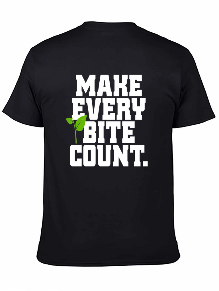 This black t-shirt features a bold, white graphic that reads "MAKE EVERY BITE COUNT." A vibrant green sprout cleverly replaces the letter 'I' in 'BITE', adding a touch of nature-inspired flair. The classic fit and comfortable material make it perfect for everyday wear. Show off your commitment to a plant-based lifestyle with this statement tee, ideal for casual outings, vegan events, or spreading an eco-conscious message. A must-have for those who want to make a difference with style!