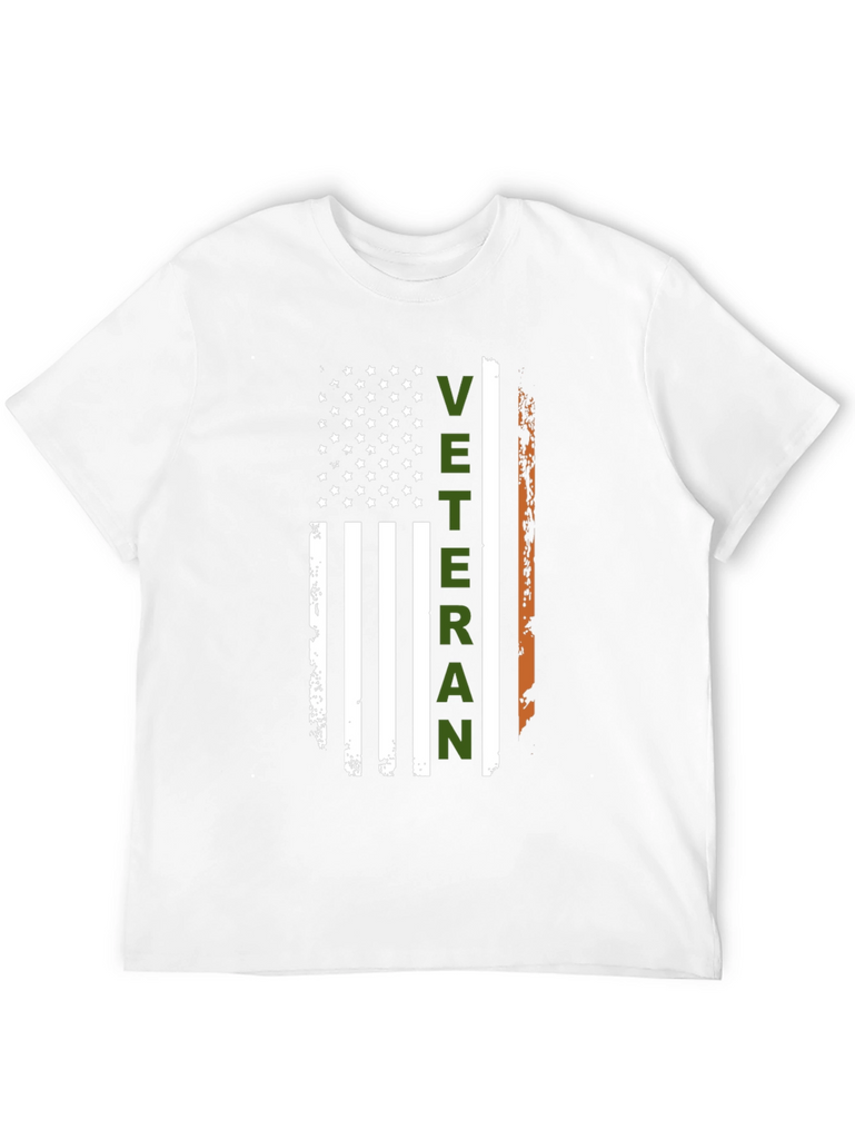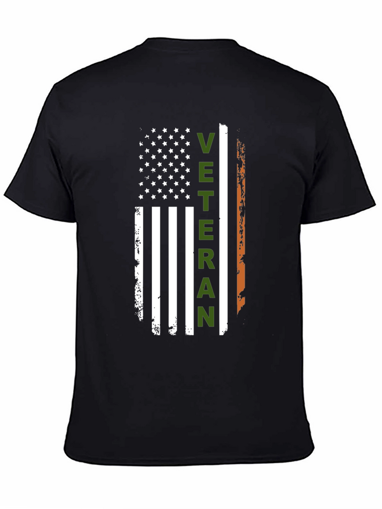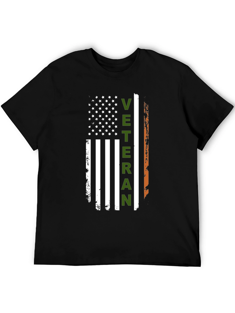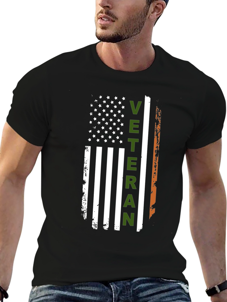 Show your pride with this Veteran flag t-shirt. The black tee features a distressed American flag design with a unique twist - the word "VETERAN" prominently displayed in bold green letters over white stripes. An orange vertical stripe runs adjacent. Perfect for veterans, military supporters, or anyone who loves patriotic apparel. This eye-catching shirt is made from what appears to be a soft and comfortable fabric, ideal for everyday wear, memorial day events, or casual outings. The classic fit and short sleeves ensure a relaxed feel. Makes a thoughtful gift for the veteran in your life.