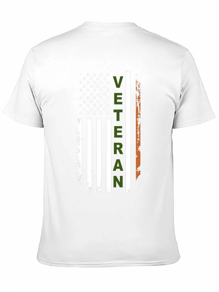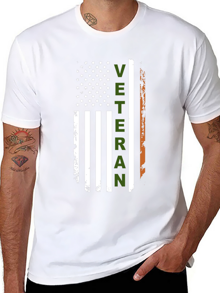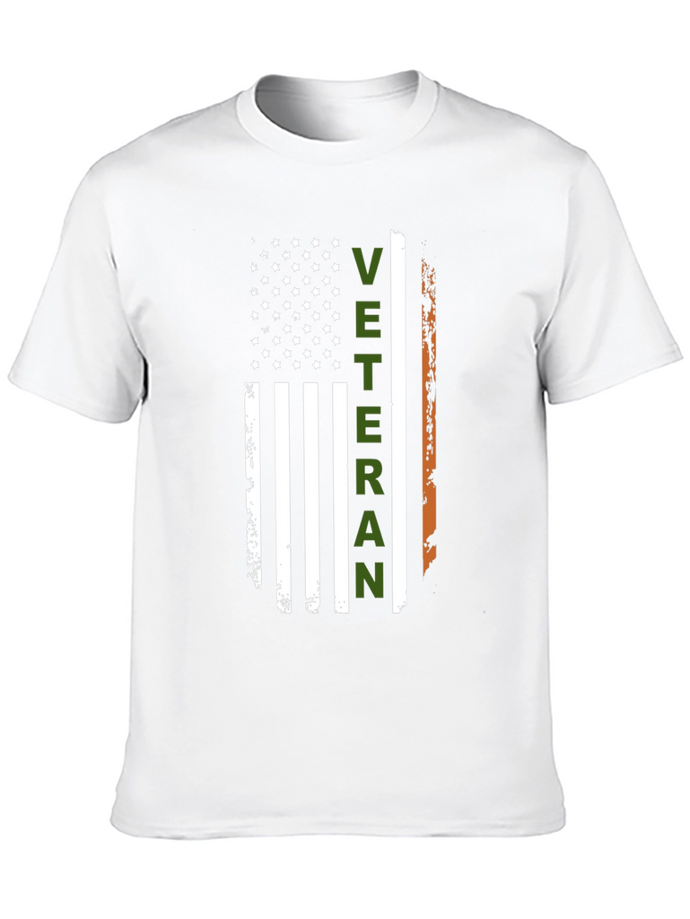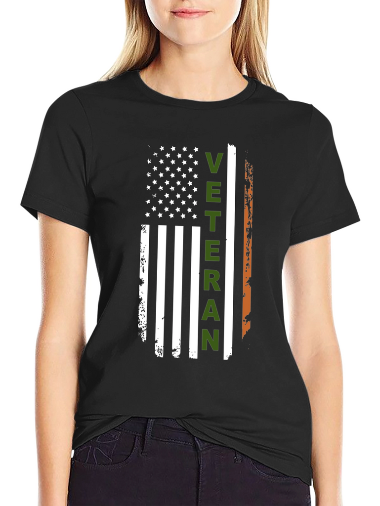 Show your pride with this Veteran flag t-shirt. The black tee features a distressed American flag design with a unique twist - the word "VETERAN" prominently displayed in bold green letters over white stripes. An orange vertical stripe runs adjacent. Perfect for veterans, military supporters, or anyone who loves patriotic apparel. This eye-catching shirt is made from what appears to be a soft and comfortable fabric, ideal for everyday wear, memorial day events, or casual outings. The classic fit and short sleeves ensure a relaxed feel. Makes a thoughtful gift for the veteran in your life.