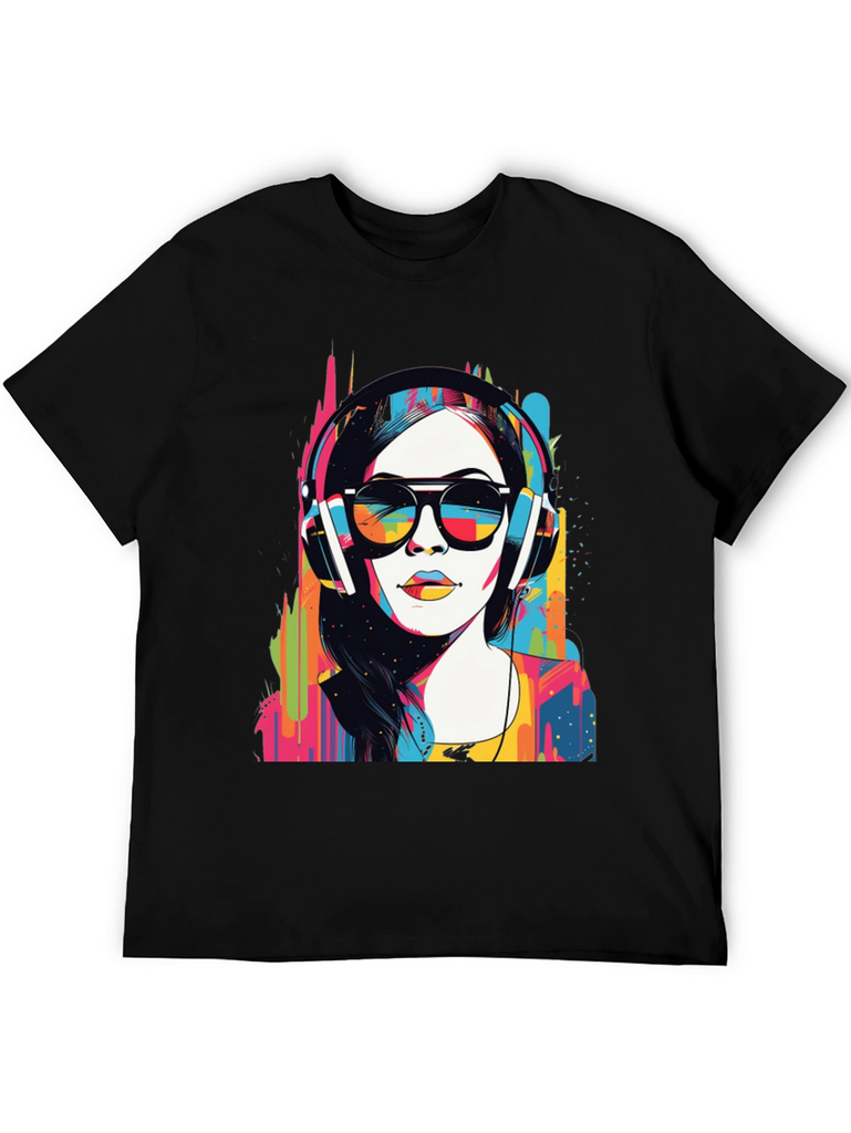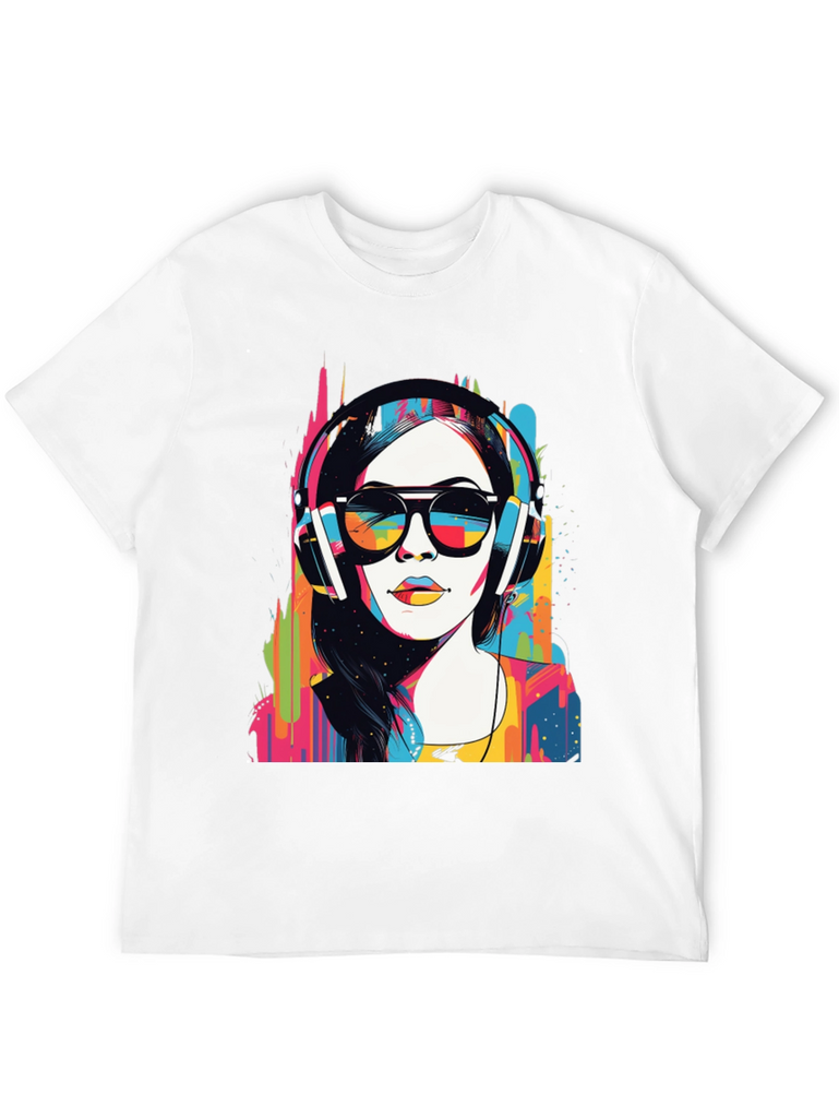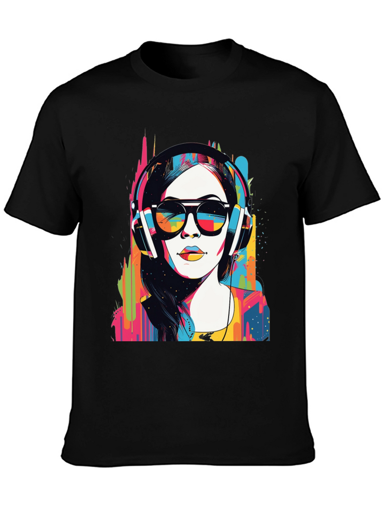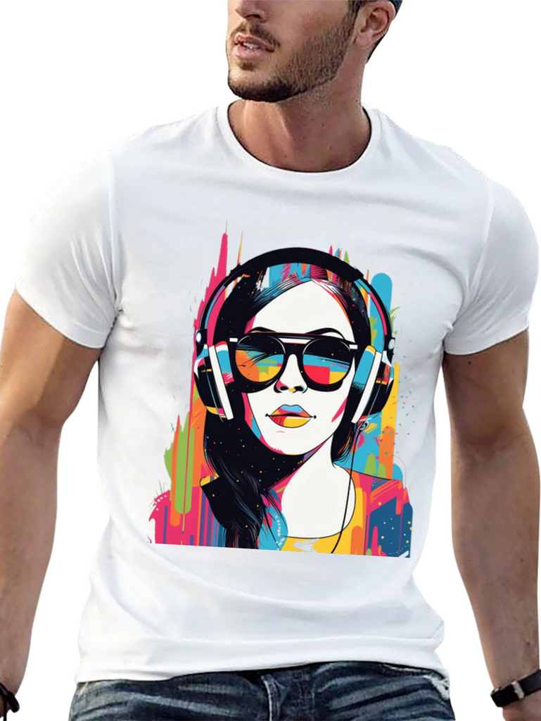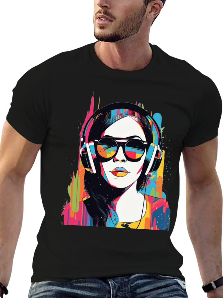 Make a bold statement with this eye-catching graphic t-shirt. The design features a woman wearing headphones and sunglasses in a striking pop art style, bursting with vibrant colors. This unique design blends modern art with casual wear. Made from soft, breathable fabric, it offers both comfort and style for everyday wear. Perfect for music lovers and art enthusiasts, this tee will definitely turn heads. Great for concerts, casual outings, or making a statement wherever you go. Get yours today and express your colorful side!