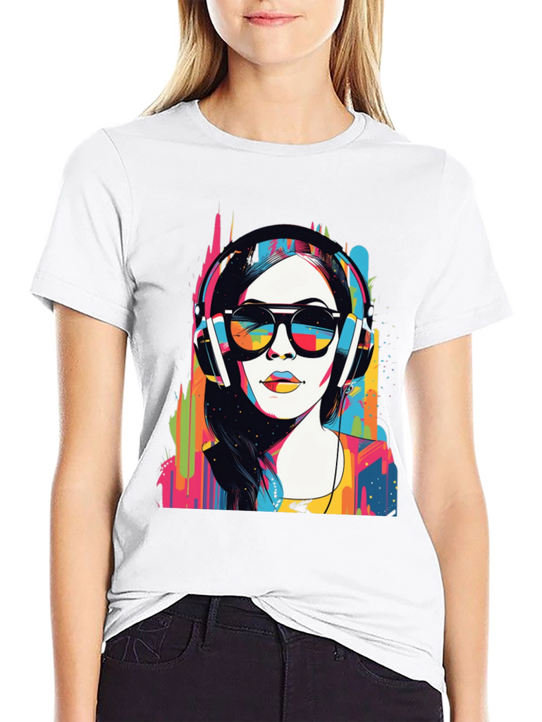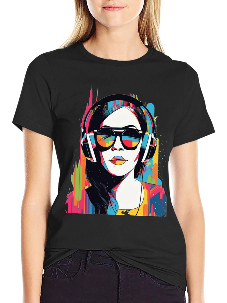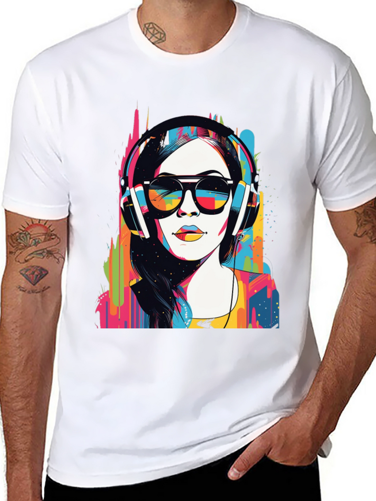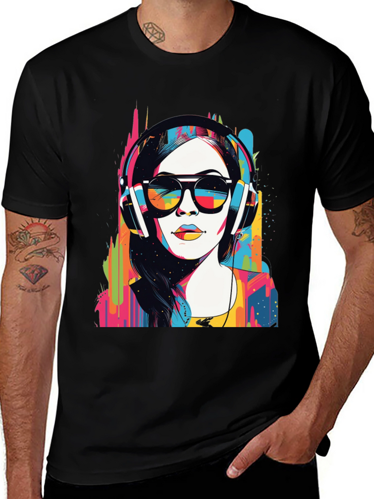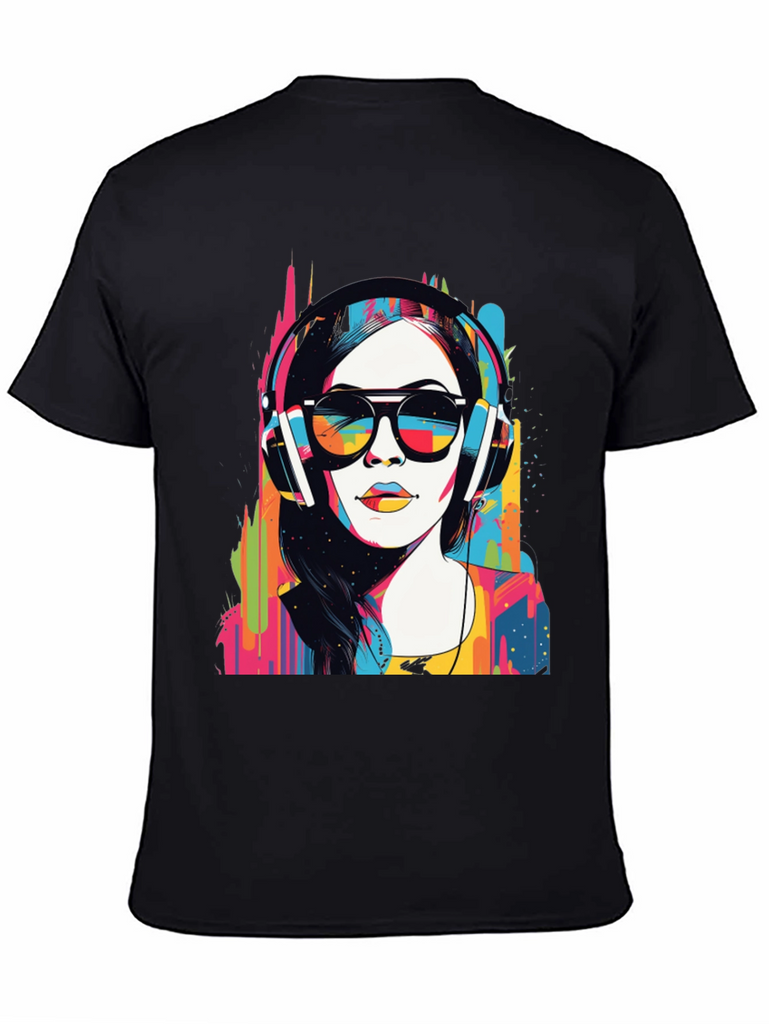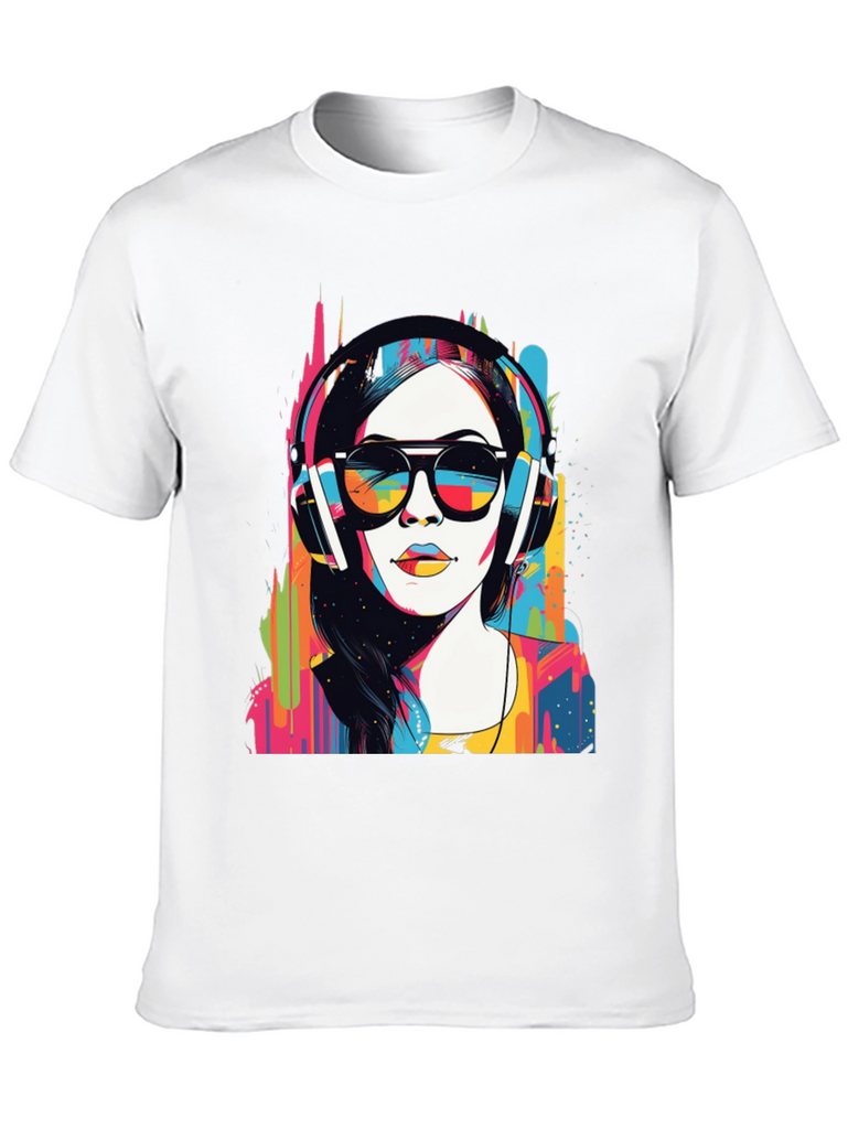 Make a bold statement with this eye-catching graphic t-shirt. The design features a woman wearing headphones and sunglasses in a striking pop art style, bursting with vibrant colors. This unique design blends modern art with casual wear. Made from soft, breathable fabric, it offers both comfort and style for everyday wear. Perfect for music lovers and art enthusiasts, this tee will definitely turn heads. Great for concerts, casual outings, or making a statement wherever you go. Get yours today and express your colorful side!