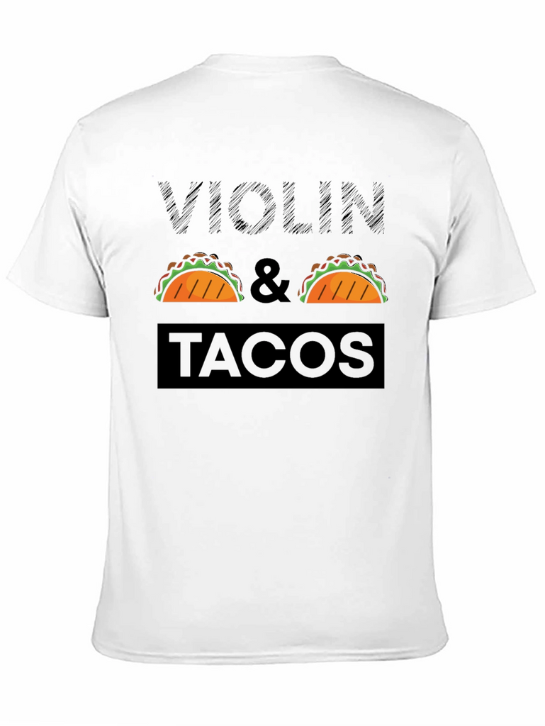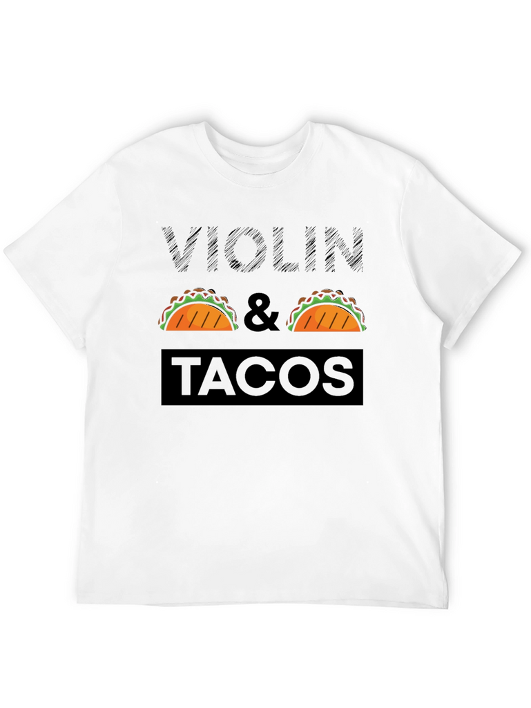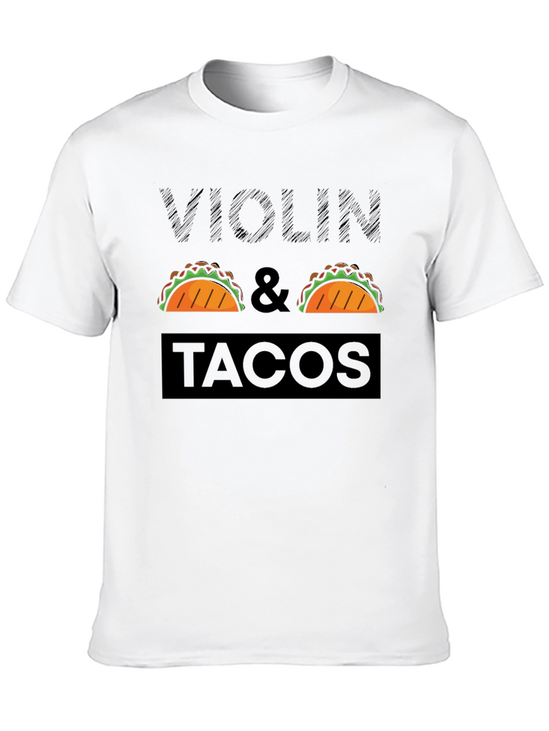 This classic black t-shirt features a playful design that combines music and food! The graphic showcases the word "VIOLIN" above an ampersand symbol between two cartoon tacos. Below, the word "TACOS" completes the humorous design. Made from a soft-looking fabric, this tee appears comfortable and breathable, perfect for everyday wear. The clean lines and bold design make it a statement piece that's sure to spark conversation. Ideal for music lovers with a sense of humor or anyone who appreciates a good taco, this shirt is a fun addition to any casual wardrobe. Wear it to concerts, casual outings, or taco Tuesdays!