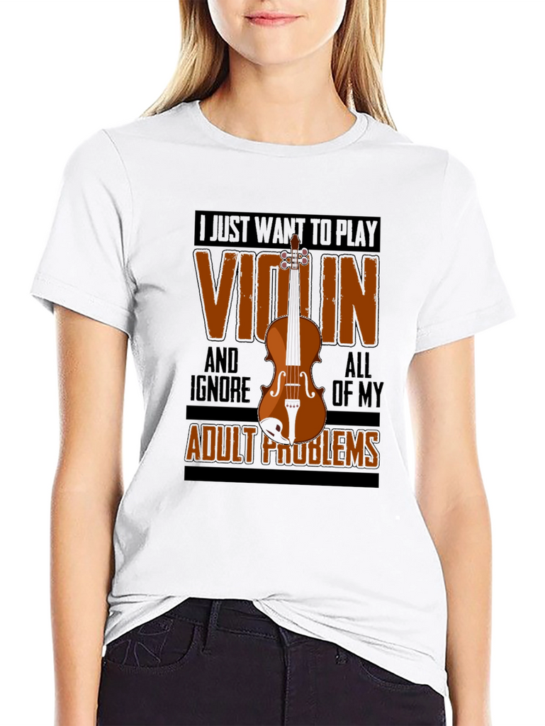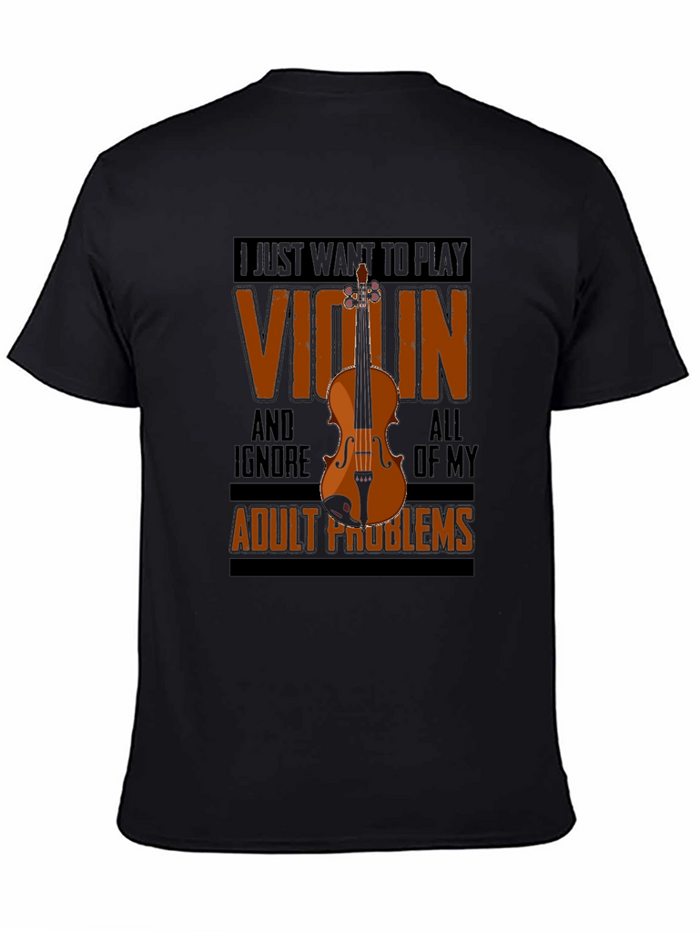 Show off your love for music with this unique black t-shirt! Featuring a fun graphic design, this tee is perfect for violin players and music lovers alike. The design includes a silhouette of a violin, accompanied by the saying "I just want to play VIOLIN and ignore all of my ADULT PROBLEMS." Made from a comfortable fabric, this shirt is ideal for casual wear, music events, or just lounging around. A great conversation starter and a perfect gift for the violinist in your life! Get yours today and let everyone know your passion.