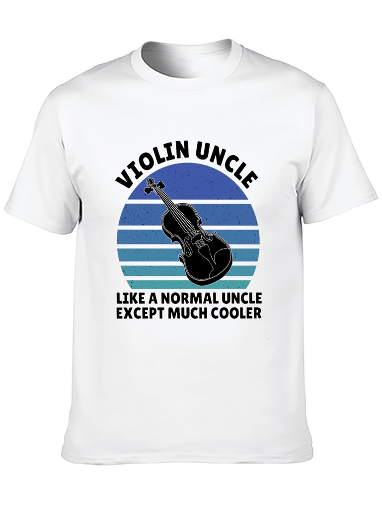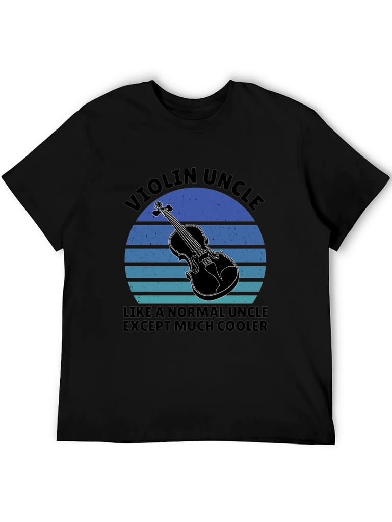 Show off your love for music with this eye-catching Violin Uncle T-Shirt. This black tee features a striking graphic of a violin set against a retro-style sunset background with blue and aqua horizontal bands. Bold text reads "Violin Uncle, Like A Normal Uncle Except Much Cooler", adding a fun, personalized touch. Made from comfortable, breathable fabric, this shirt is perfect for casual wear, music events, or as a unique gift for the cool violin-playing uncle in your life. The bold design ensures you'll stand out while expressing your passion for music and family.