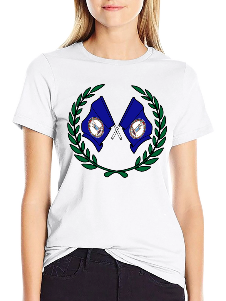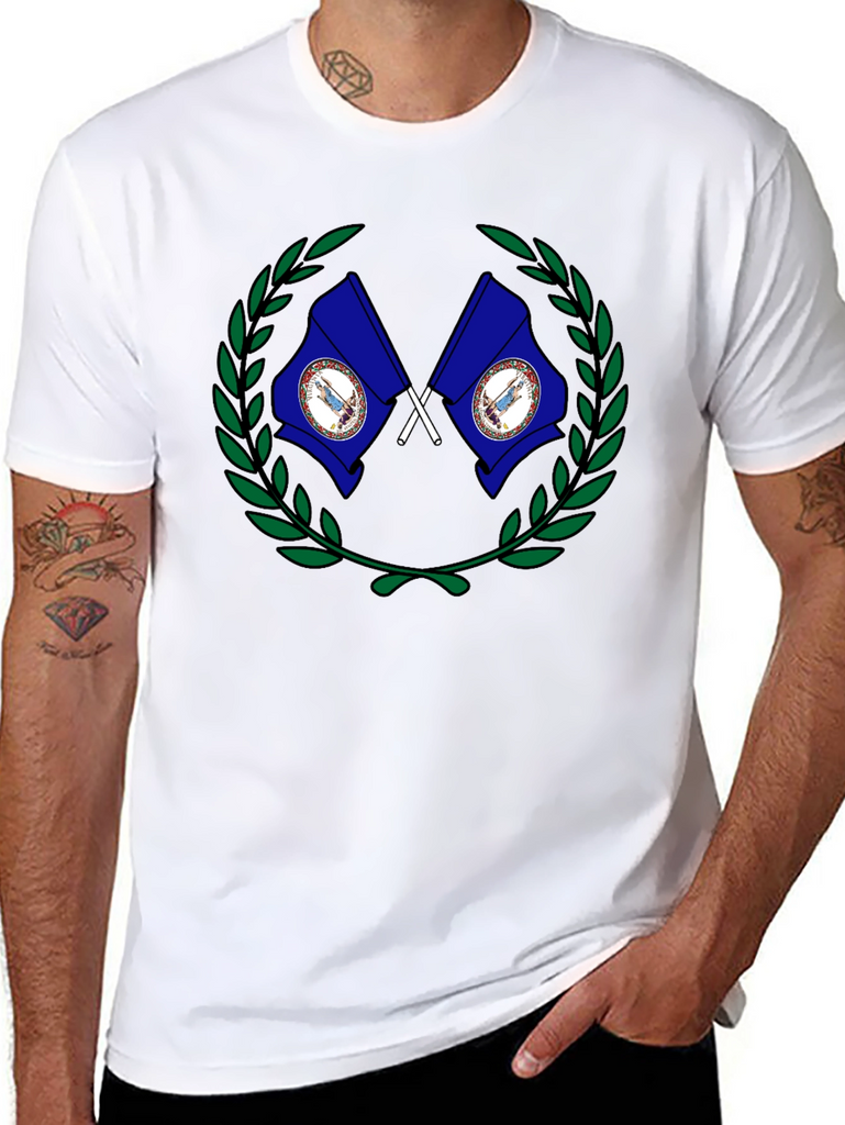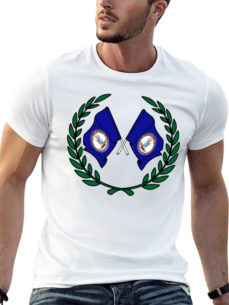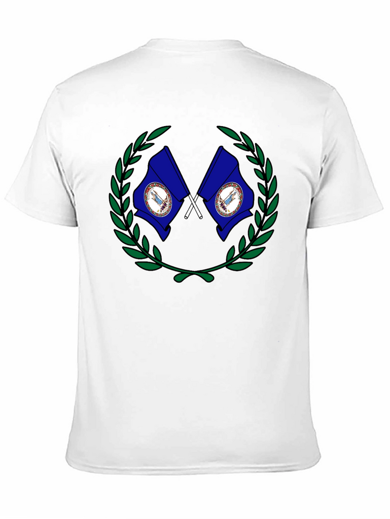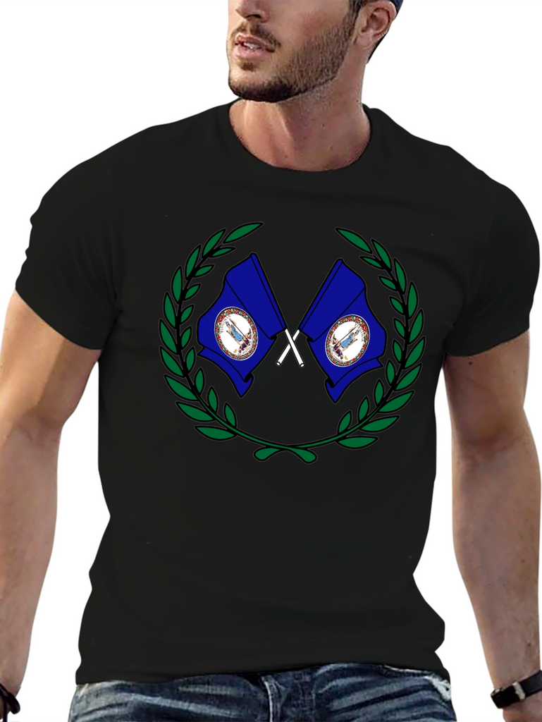 Show your Virginia pride with this eye-catching black t-shirt. The shirt features a unique emblem of crossed Virginia state flags, encircled by a classic laurel wreath. The design is prominently displayed on the front, making it a conversation starter. Made from a comfortable, breathable fabric, this tee is perfect for everyday wear. Whether you're a Virginia native, a history buff, or simply appreciate stylish apparel, this t-shirt is a great addition to your wardrobe. Wear it to sporting events, casual outings, or as a statement piece. It's also a thoughtful gift for friends and family who love Virginia. Enjoy the comfort and showcase your state pride with this distinctive t-shirt.