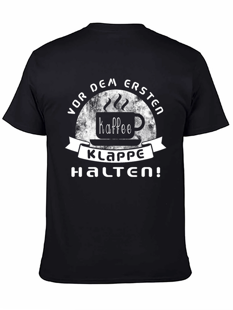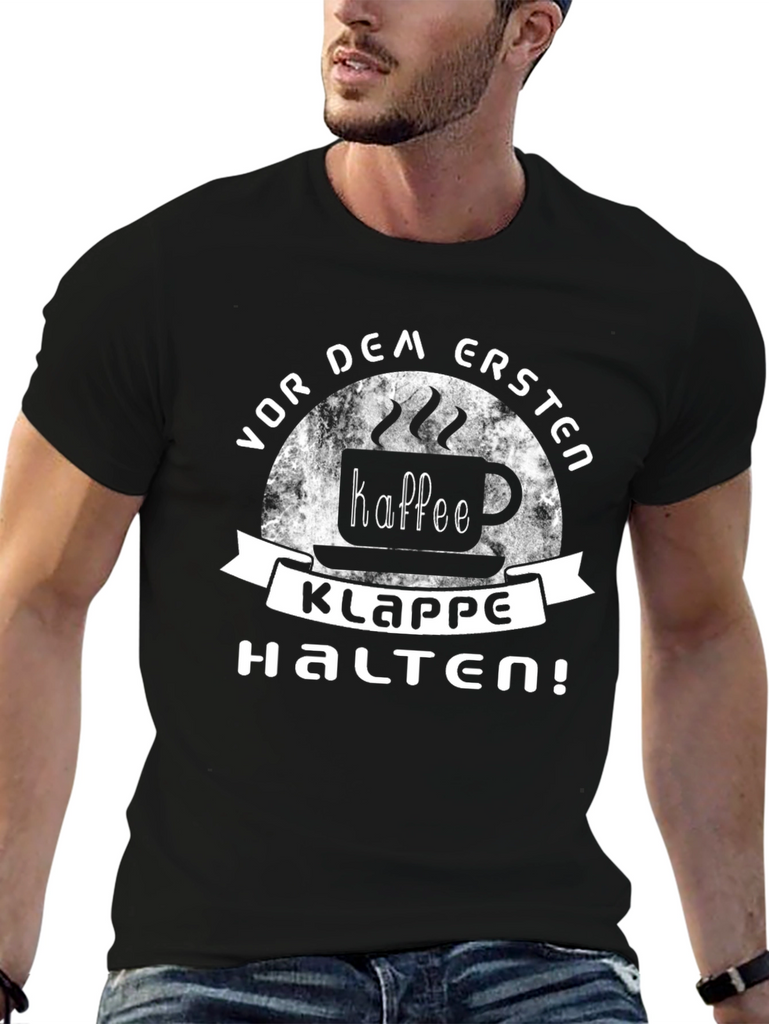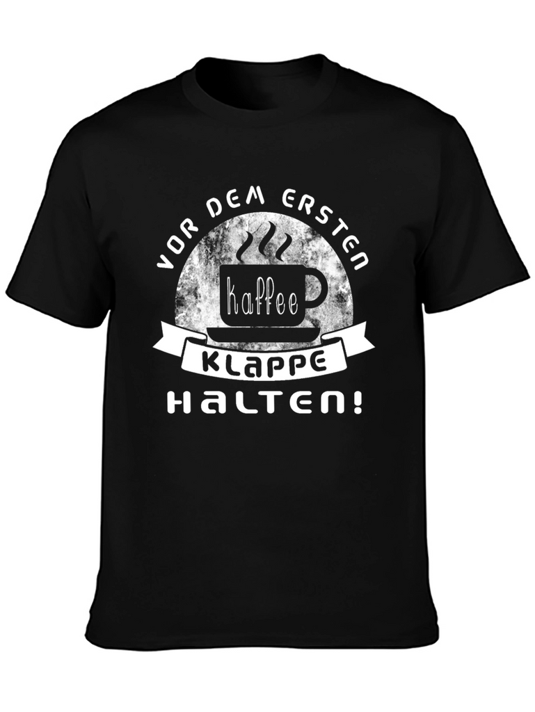 This black t-shirt features a bold and humorous design for coffee lovers. The graphic includes a stylized coffee cup with the German text "Vor Dem Ersten Kaffee Klappe Halten!", which translates to "Keep quiet before the first coffee!". The distressed design adds a vintage touch, making it a standout piece. The shirt appears to be made of a comfortable, breathable fabric, perfect for everyday wear. This t-shirt is ideal for casual outings, coffee shop visits, or as a fun gift for the coffee enthusiast in your life. Show off your love for coffee and your sense of humor with this unique tee.