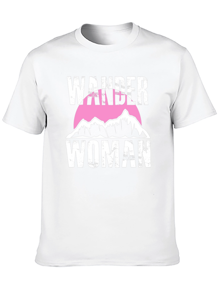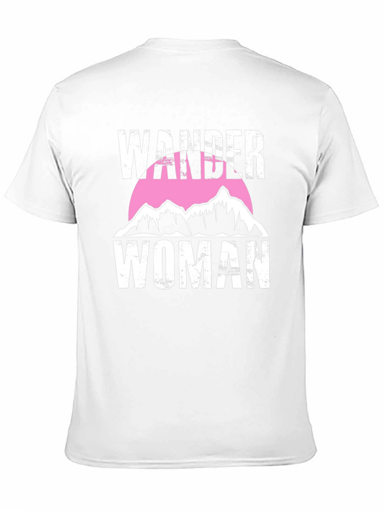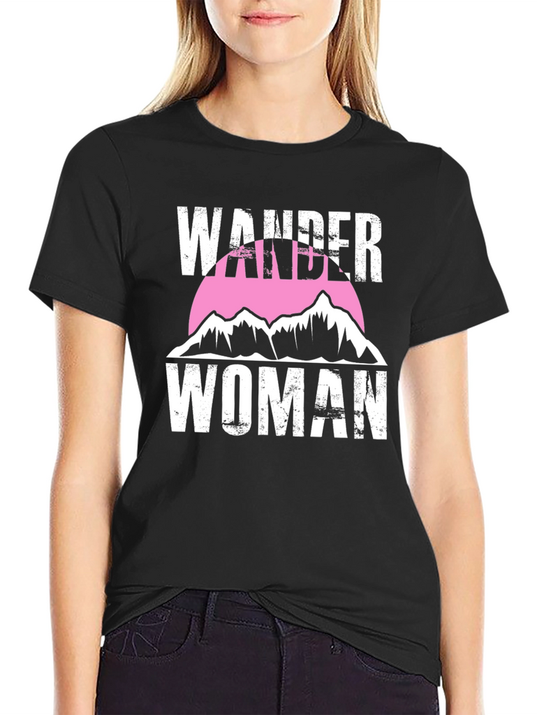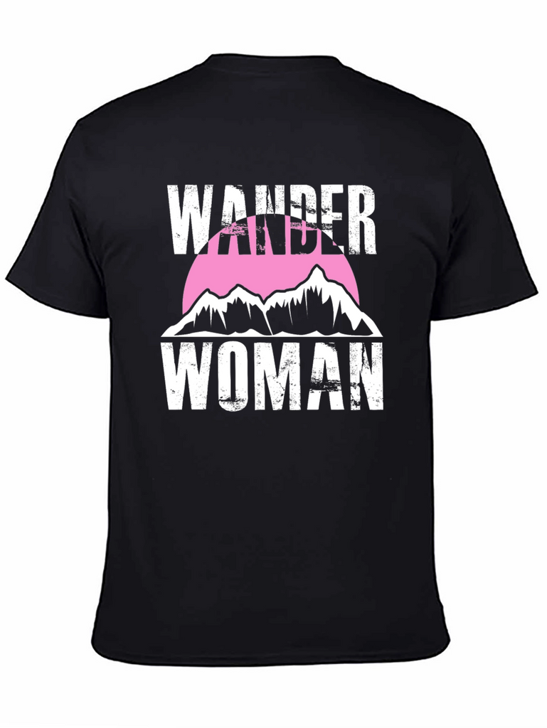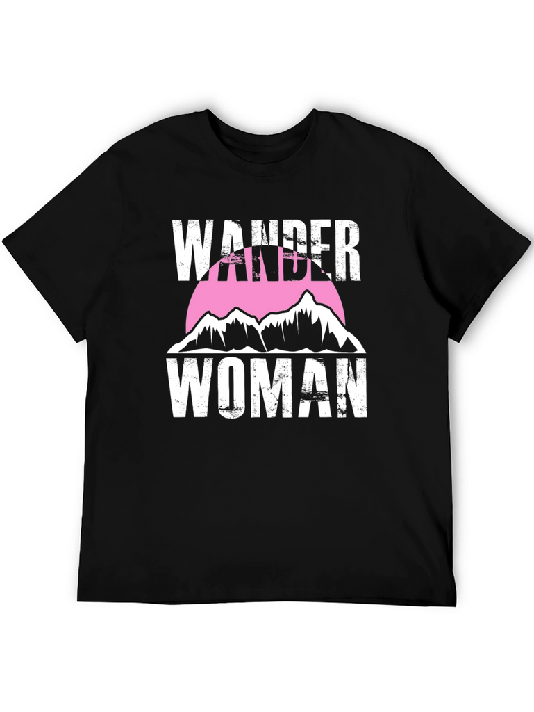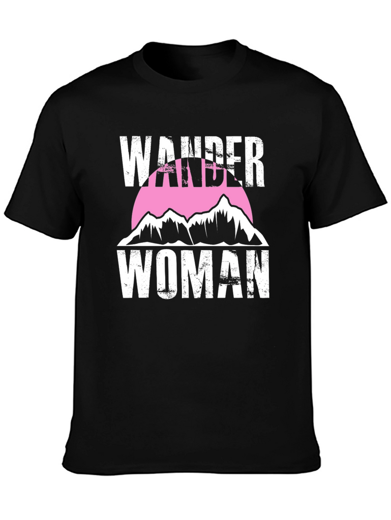 Embrace your adventurous spirit with this Wander Woman graphic tee. This stylish black t-shirt features a bold white text design with a mountain range silhouette set against a pink circle. The distressed text gives it a vintage look. Made from soft, breathable fabric, this tee is perfect for everyday wear, hiking, camping, or simply showing off your love for the outdoors. Pair it with jeans, shorts, or leggings for a casual and trendy look. Express your wanderlust with this unique and comfortable t-shirt.