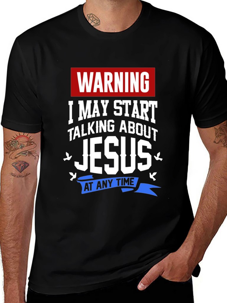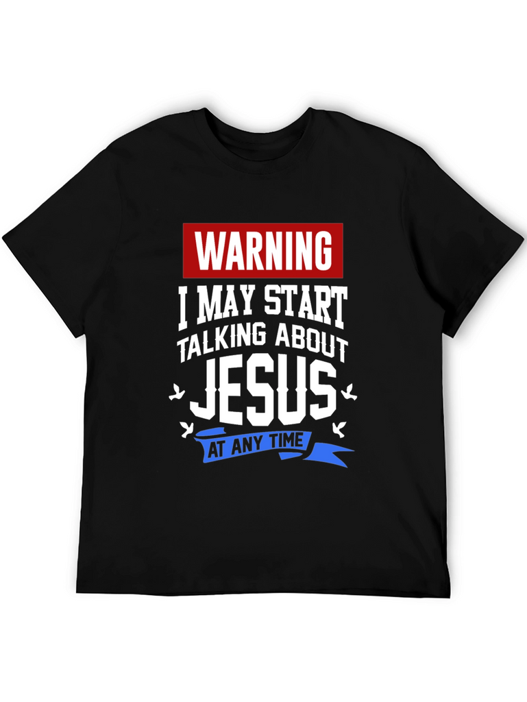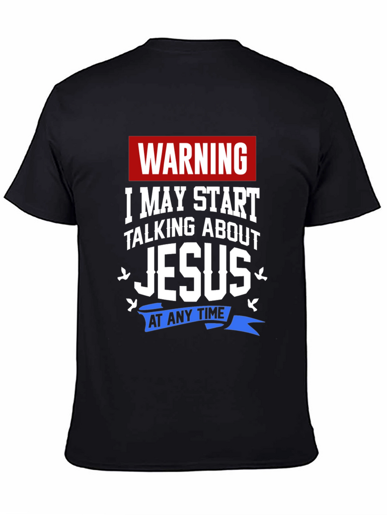 Declare your faith with this bold black t-shirt. The design features a clear "WARNING" banner at the top, followed by the humorous statement "I MAY START TALKING ABOUT JESUS" in large, eye-catching white font. Adorable dove accents surround the word "Jesus." The statement is completed by "AT ANY TIME" in blue on a ribbon banner. Ideal for casual wear, church events, or as a conversation starter, this shirt is perfect for anyone who loves to share their beliefs with a touch of humor.