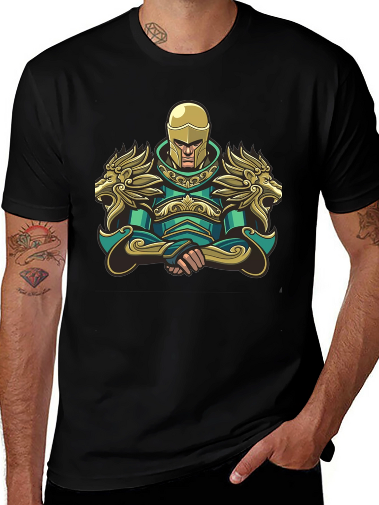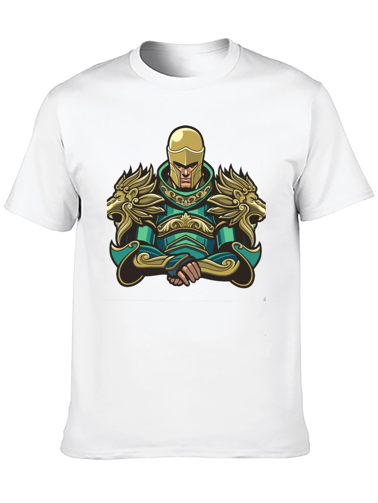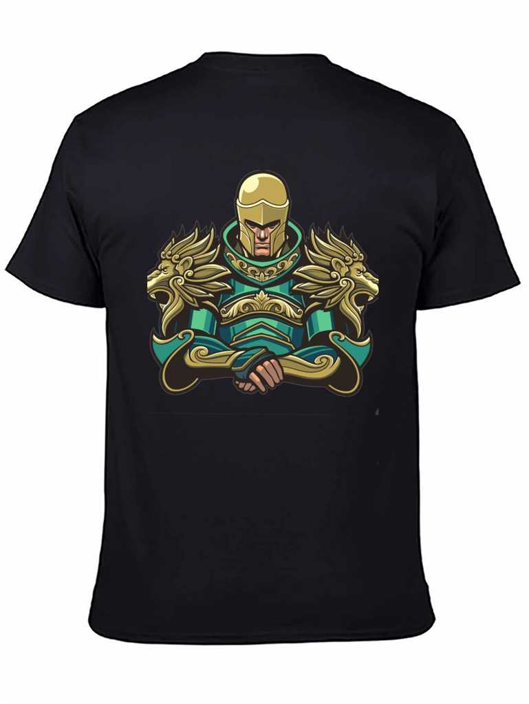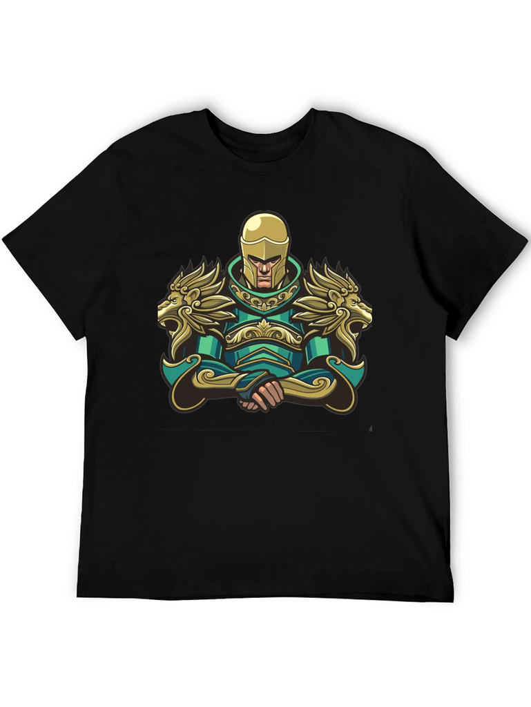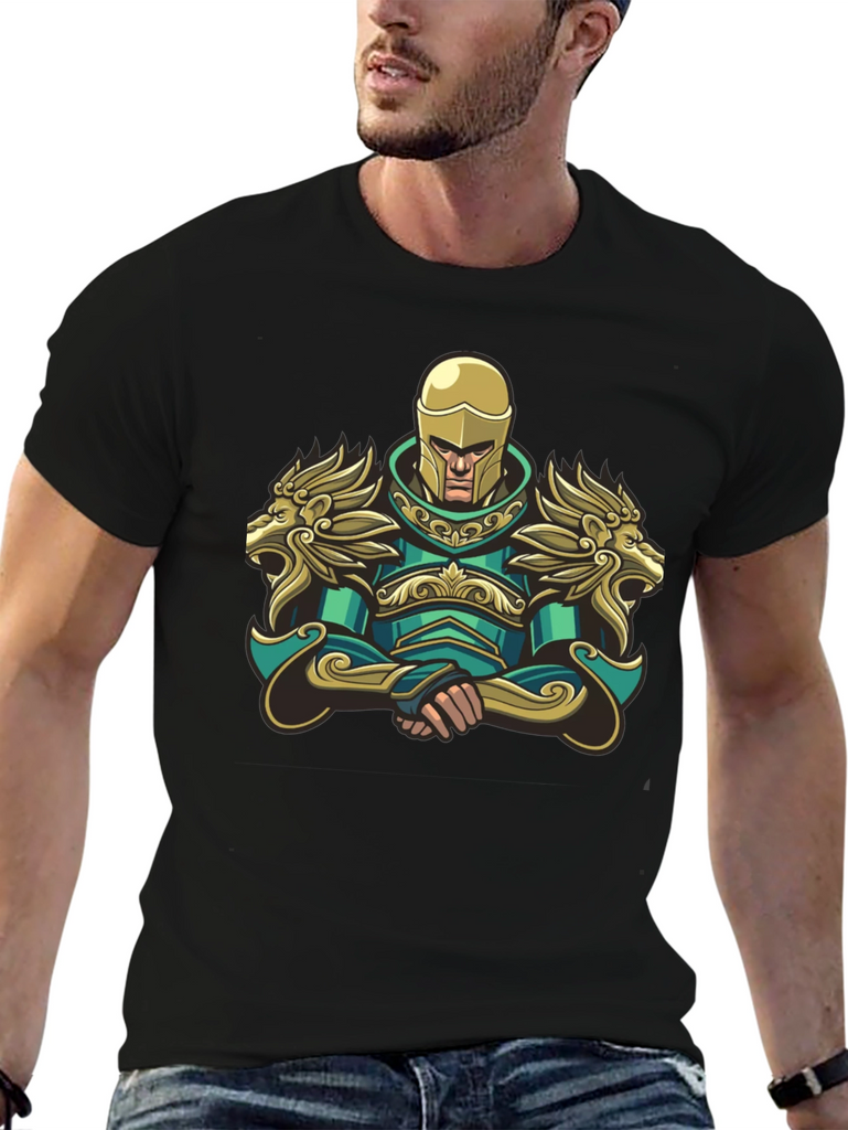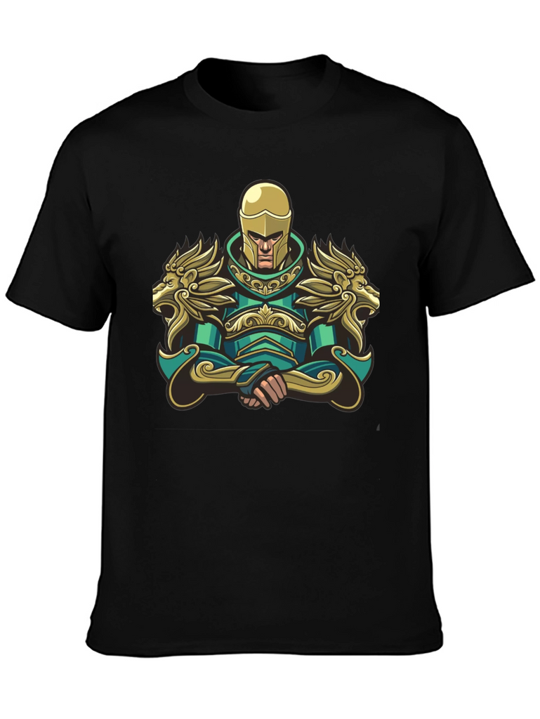 Embrace a bold and heroic style with this striking black t-shirt. The tee features a detailed graphic of a warrior knight in golden armor, complete with lion-themed shoulder guards. The design evokes a sense of strength and nobility. Made from a comfortable fabric, this shirt is perfect for casual wear, gaming events, or showing off your unique personality. Stand out from the crowd with this eye-catching and distinctive t-shirt. Makes a great gift for fantasy and gaming fans. Available in multiple sizes.
