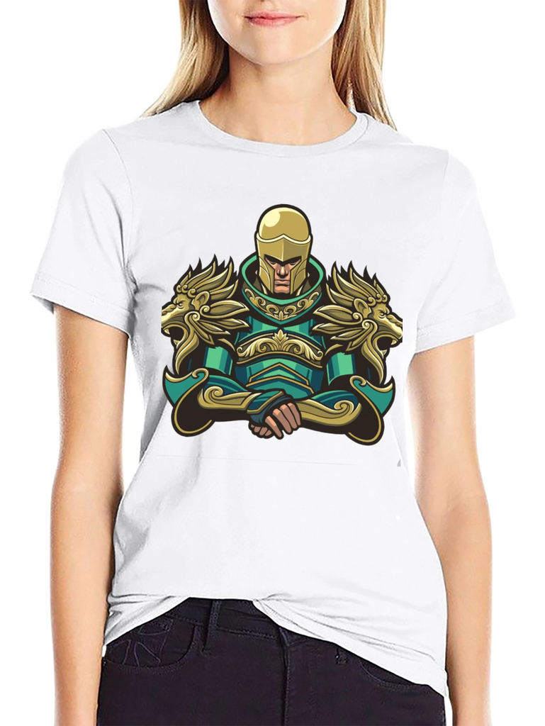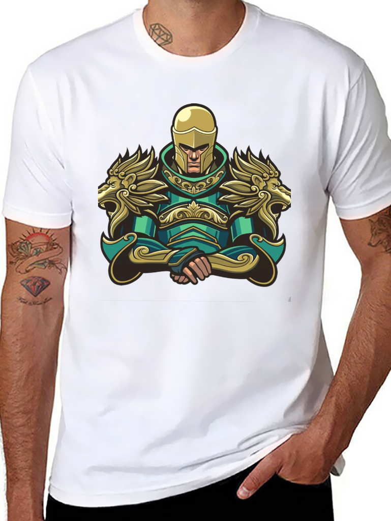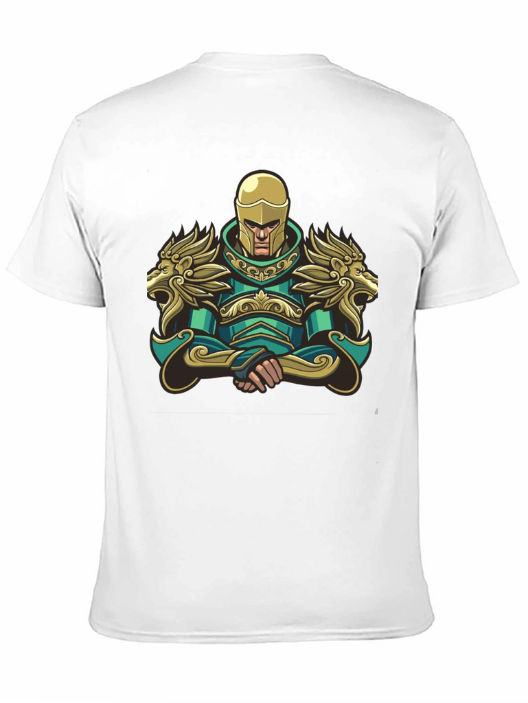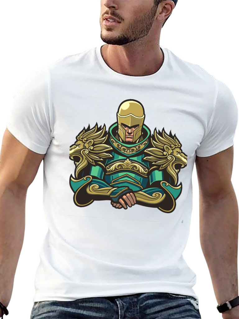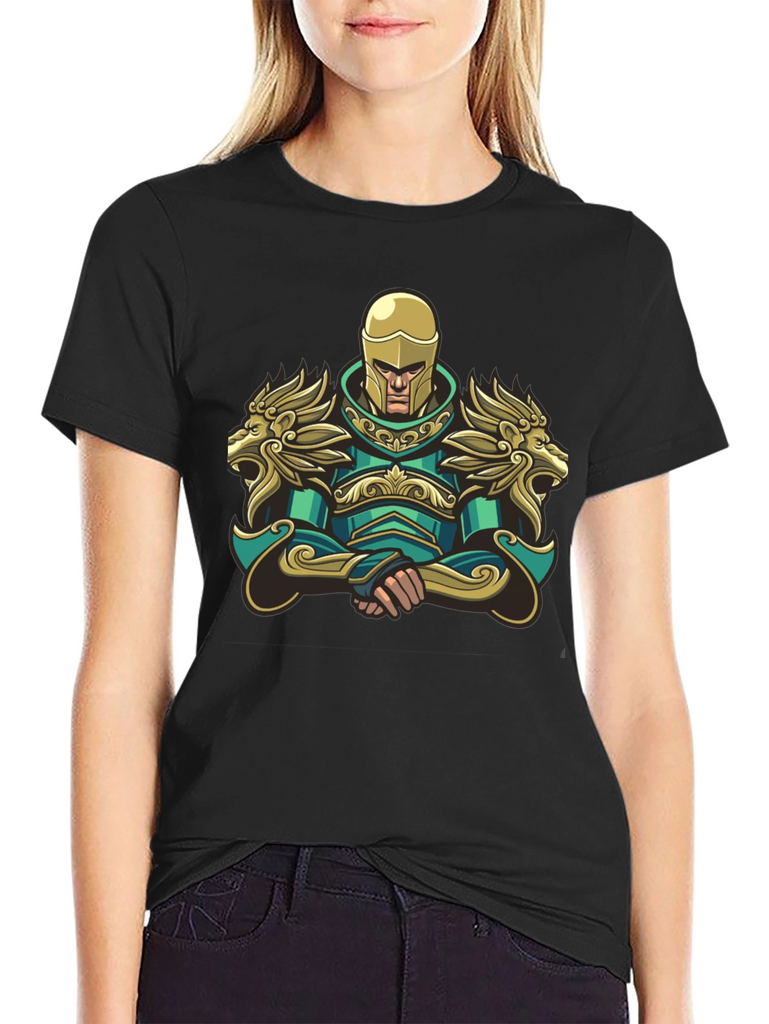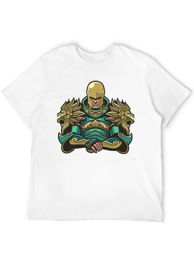 Embrace a bold and heroic style with this striking black t-shirt. The tee features a detailed graphic of a warrior knight in golden armor, complete with lion-themed shoulder guards. The design evokes a sense of strength and nobility. Made from a comfortable fabric, this shirt is perfect for casual wear, gaming events, or showing off your unique personality. Stand out from the crowd with this eye-catching and distinctive t-shirt. Makes a great gift for fantasy and gaming fans. Available in multiple sizes.