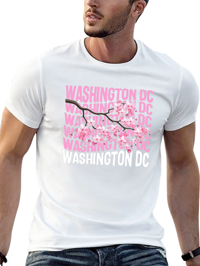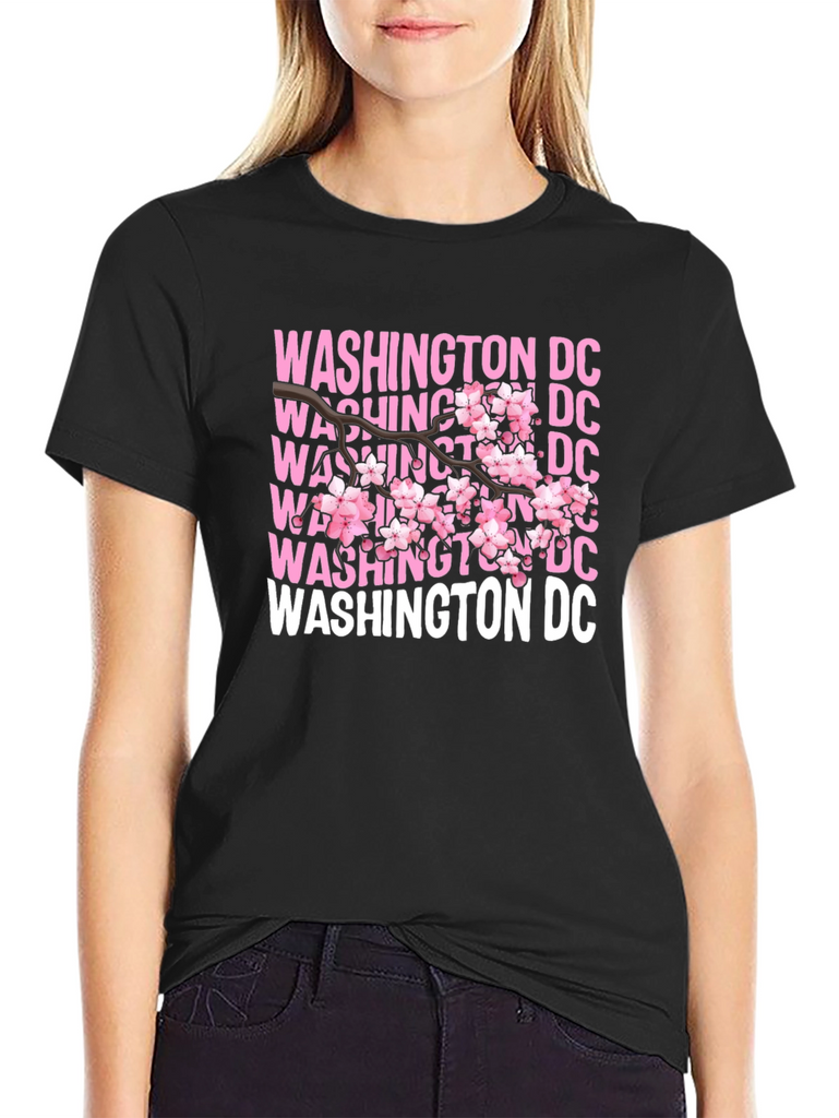 Show off your love for DC with this stylish graphic tee! This black t-shirt features a unique design with the text "WASHINGTON DC" repeated in pink and white, overlaid with a delicate cherry blossom branch. Made from a soft, breathable fabric, this shirt is comfortable enough for everyday wear. The vibrant design makes it a standout piece, perfect for casual outings, showing local pride, or as a souvenir. Pair it with jeans or shorts for a relaxed, on-trend look. This tee is a great way to celebrate the beauty of Washington D.C. and its iconic cherry blossoms!