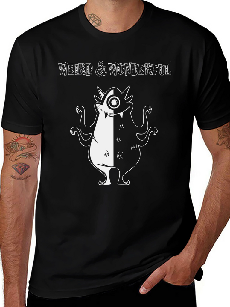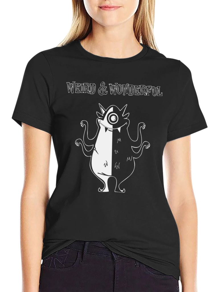 Embrace your unique style with this black 'Weird & Wonderful' graphic tee. Featuring a captivating one-eyed monster design, split in black and white. This eye-catching design adds a playful and edgy vibe to your wardrobe. Made from a comfortable material, this tee is perfect for casual outings, concerts, or expressing your individuality. Stand out from the crowd and showcase your love for the extraordinary with this must-have graphic tee! This tee is perfect for anyone who loves unique designs.
