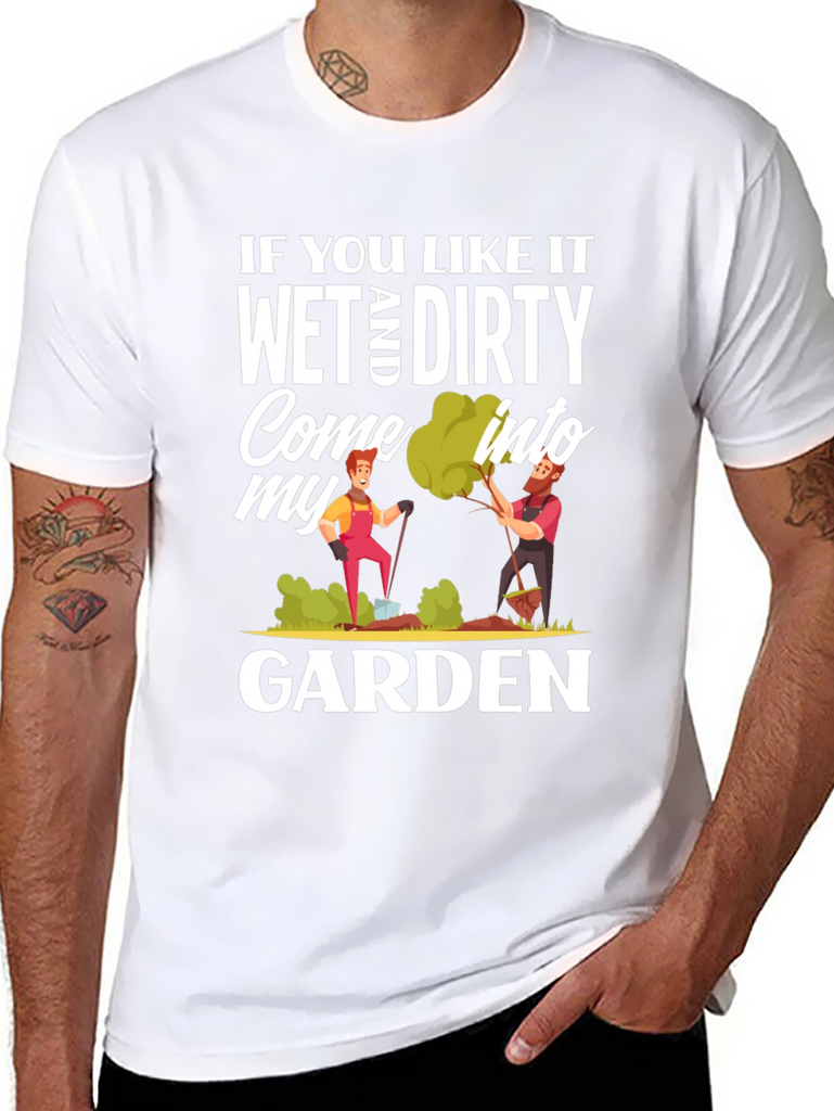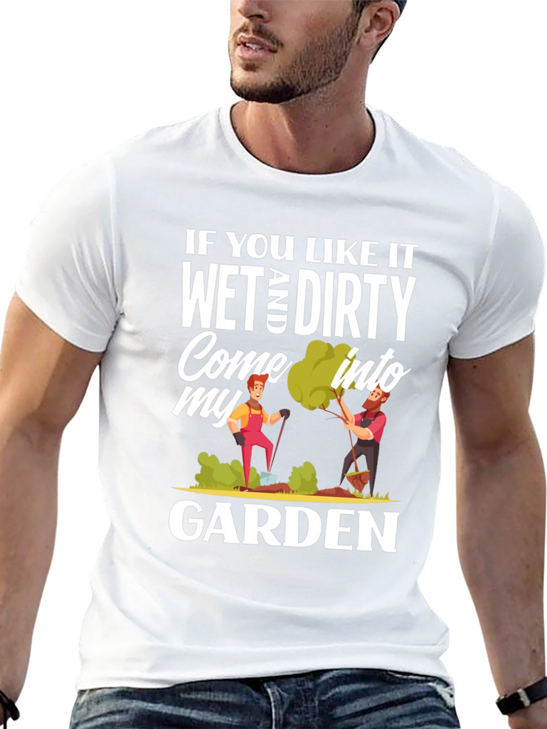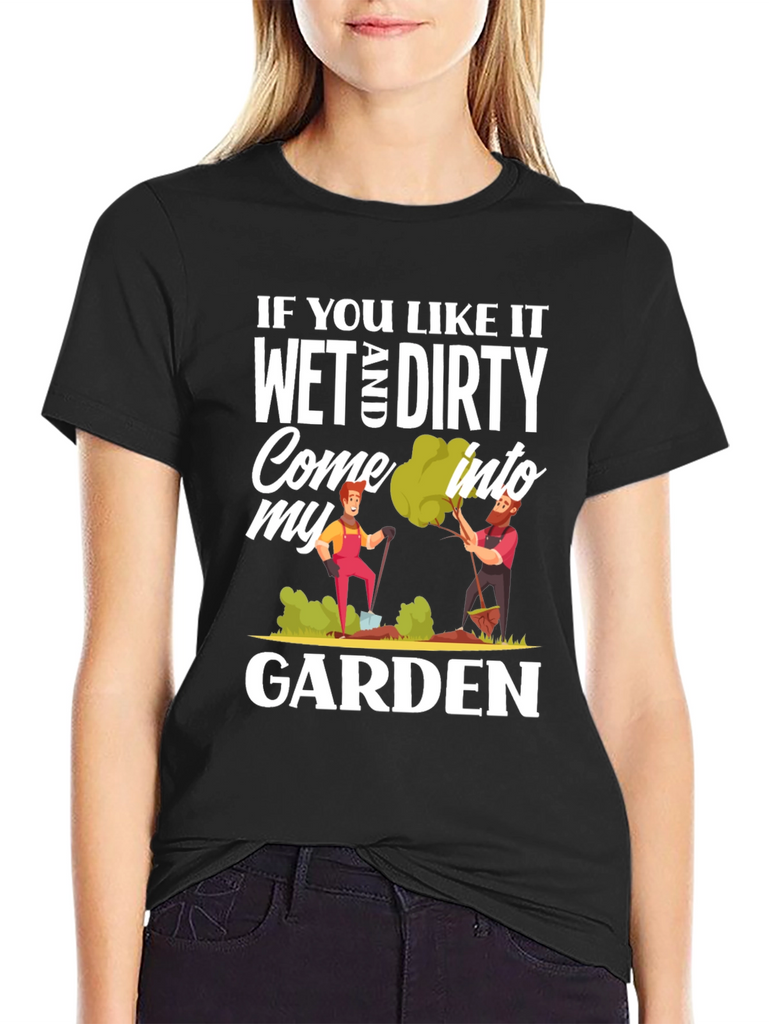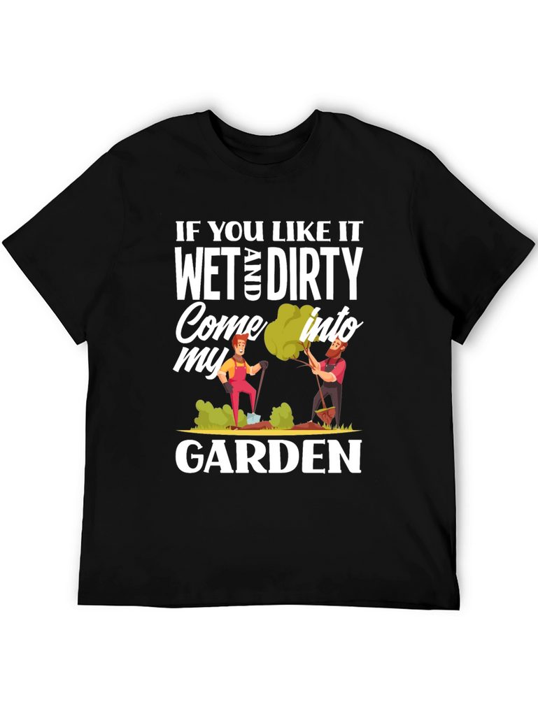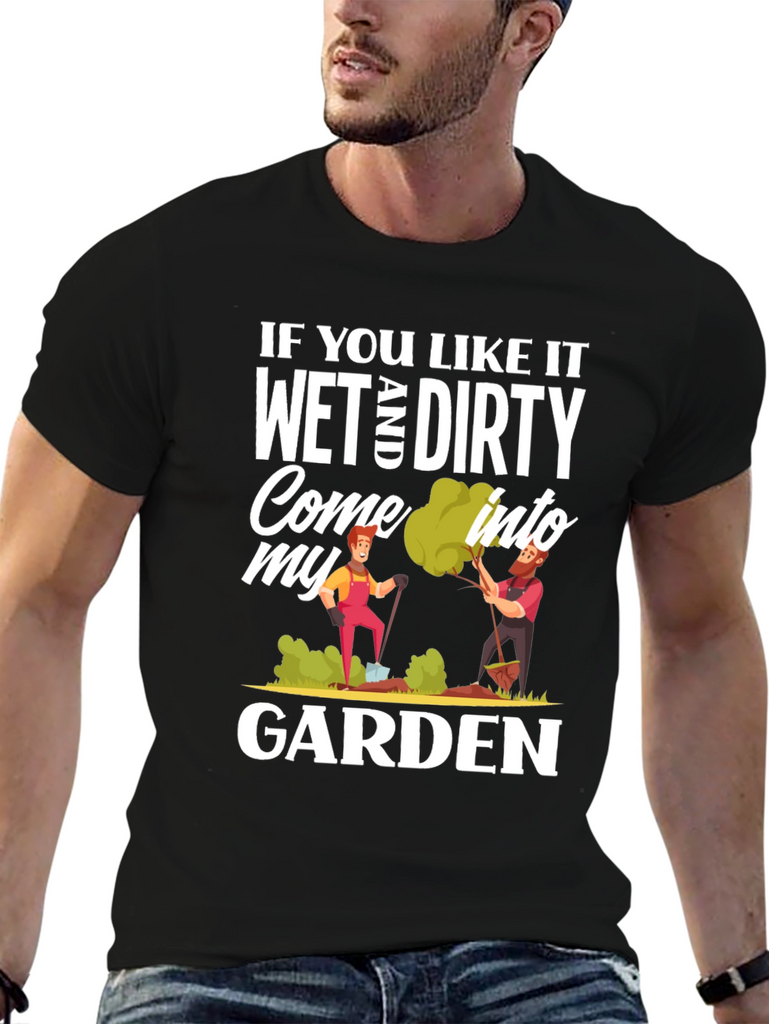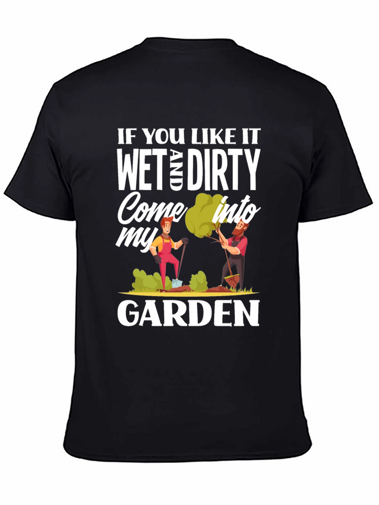 Show off your playful side with this humorous black t-shirt. The design features the cheeky phrase, "If You Like It Wet and Dirty Come Into My Garden," printed in a bold, eye-catching white font. It also includes colorful cartoon graphics of two gardeners tending to their plants. Made from a soft-looking fabric, this casual tee is perfect for gardening enthusiasts with a sense of humor. This T-shirt will definitely bring some laughter to your everyday life and is sure to turn heads wherever you go.