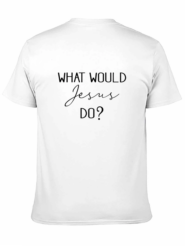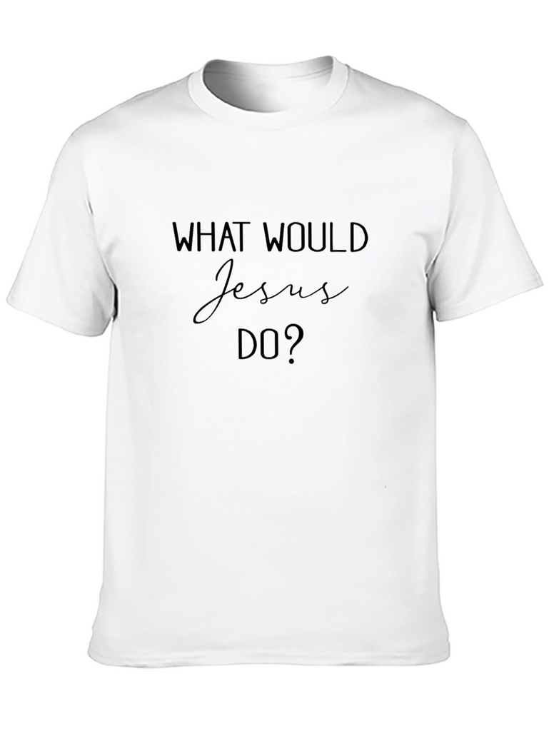 This classic black t-shirt features the popular phrase "What Would Jesus Do?" printed across the chest in a clean, readable font. Made from what appears to be a soft and comfortable fabric, this shirt is perfect for everyday wear and casual occasions. The simple yet impactful design makes it easy to pair with jeans, shorts, or layered under a jacket. It’s a great way to express your faith and start conversations. Wear it to church, casual outings, or anywhere you want to share your values. A stylish and meaningful addition to any wardrobe.