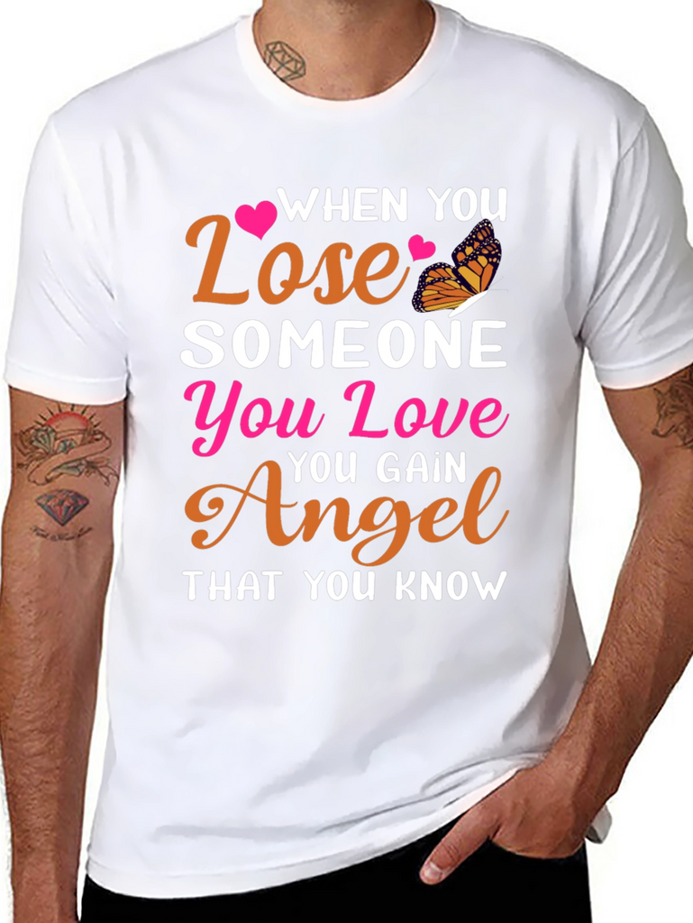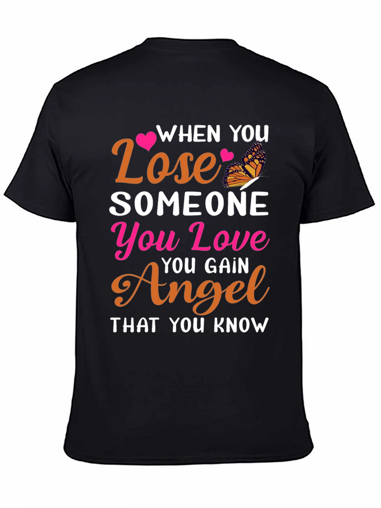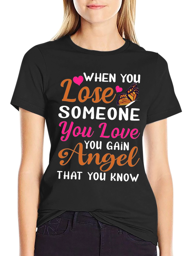 This black t-shirt features a touching memorial message, making it a thoughtful gift for those who have experienced loss. The design includes the phrase "When You Lose Someone You Love, You Gain An Angel That You Know" in a combination of peach, white, and pink fonts, adorned with a butterfly and heart graphics. Made from a soft, comfortable fabric, this shirt is suitable for everyday wear. It's a simple yet meaningful way to honor a loved one and offer comfort during difficult times. Perfect for wearing as a reminder of cherished memories or as a sympathy gift for friends and family. Ideal for memorial events, remembrance gatherings, or simply as a personal expression of grief and love.