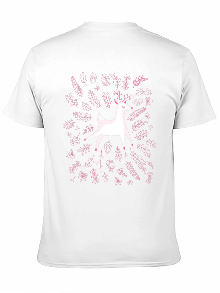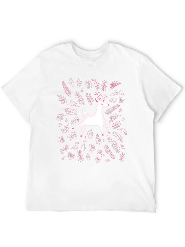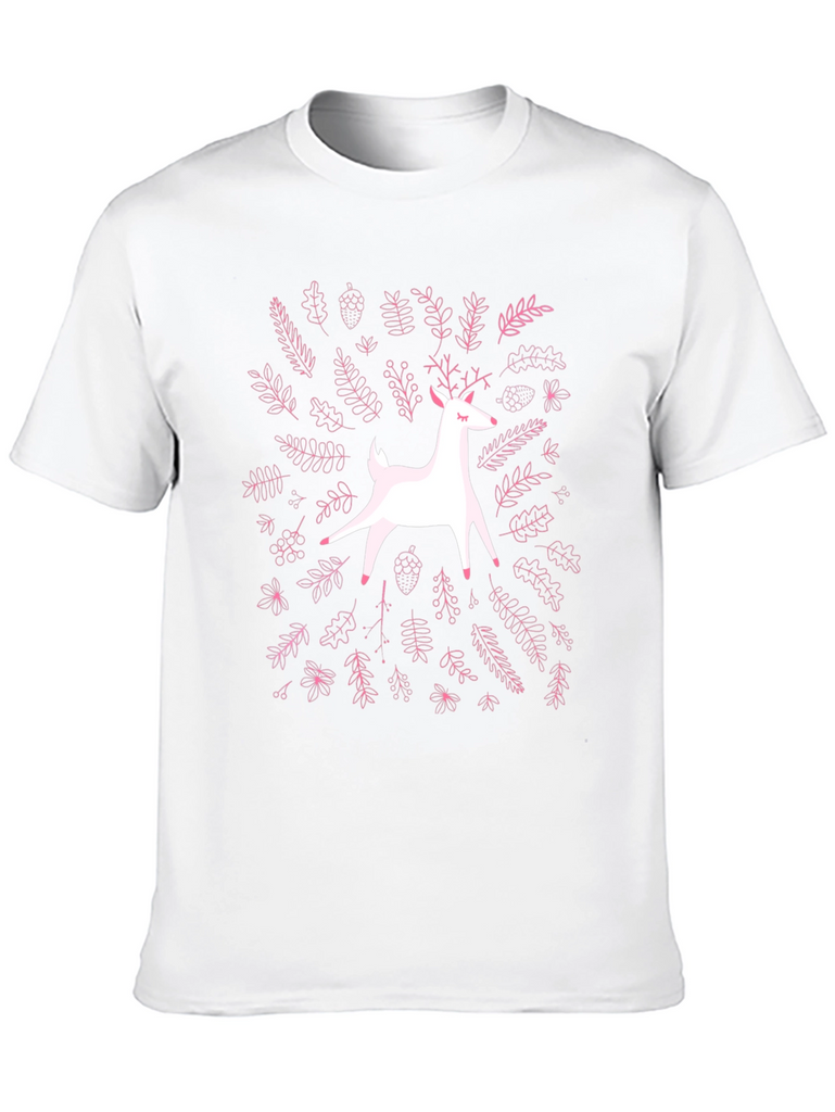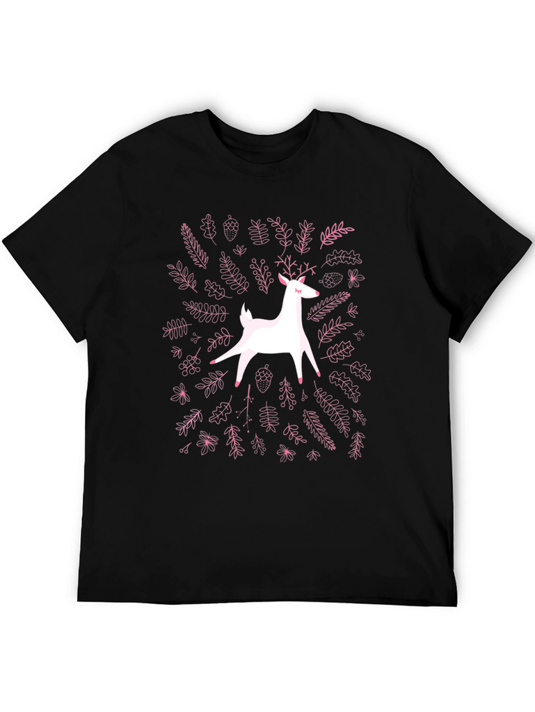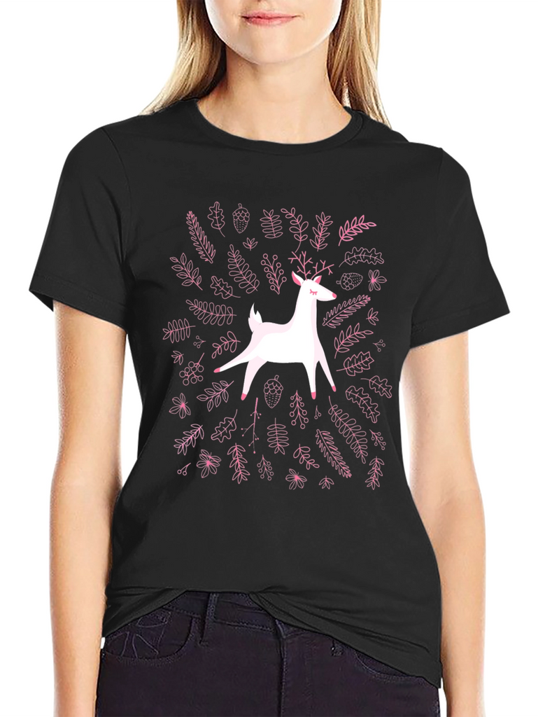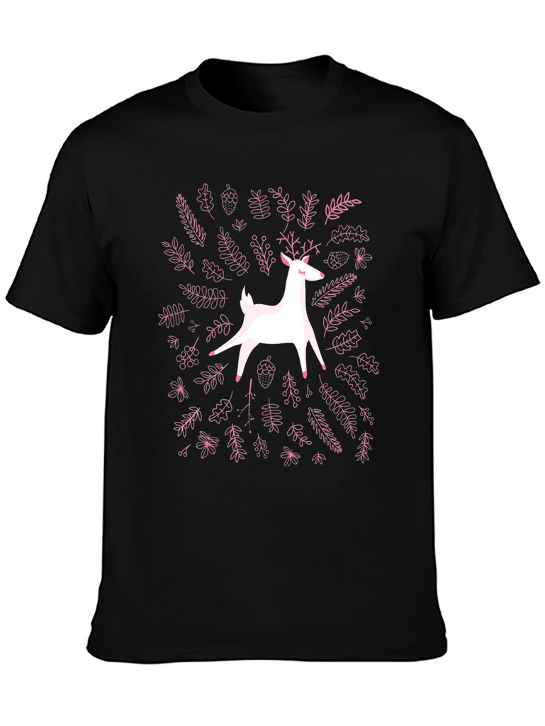 Embrace the charm of nature with this unique black T-shirt. The design features a graceful, white deer surrounded by delicate pink botanical elements, including leaves, acorns, and berries. The playful, hand-drawn style creates a whimsical, eye-catching look. Made from comfortable, breathable fabric, this T-shirt is perfect for everyday wear. Pair it with jeans or shorts for a casual yet stylish outfit. Its soft feel and relaxed fit make it an ideal choice for running errands, weekend outings, or simply lounging at home. Show off your love for nature and stand out from the crowd with this delightful graphic tee.