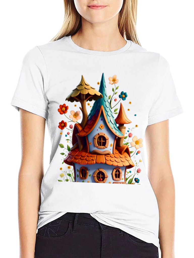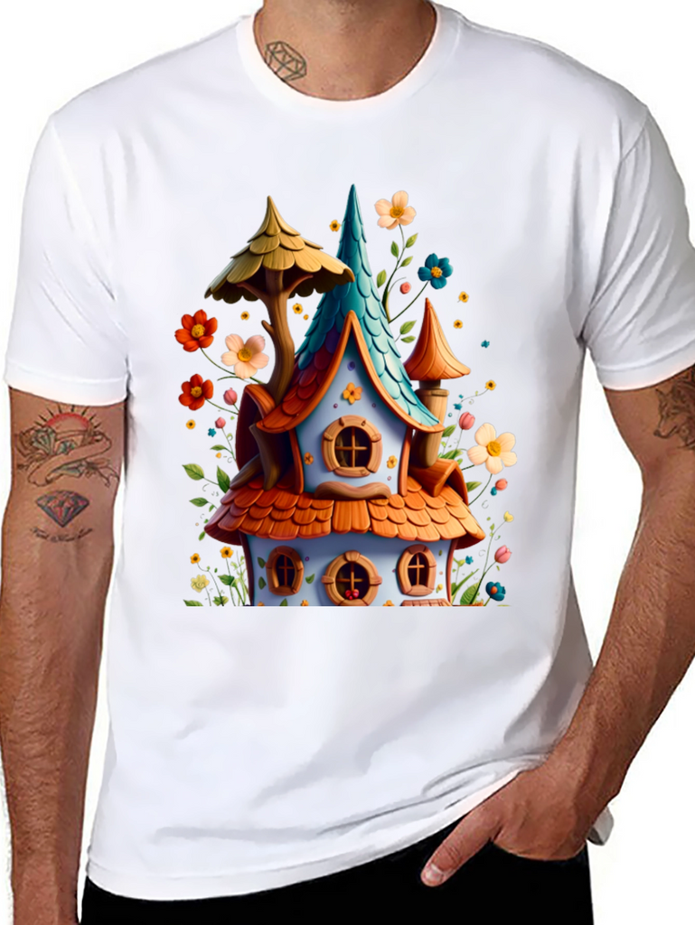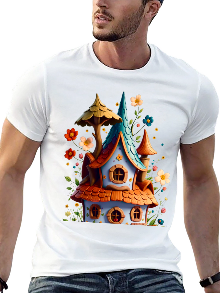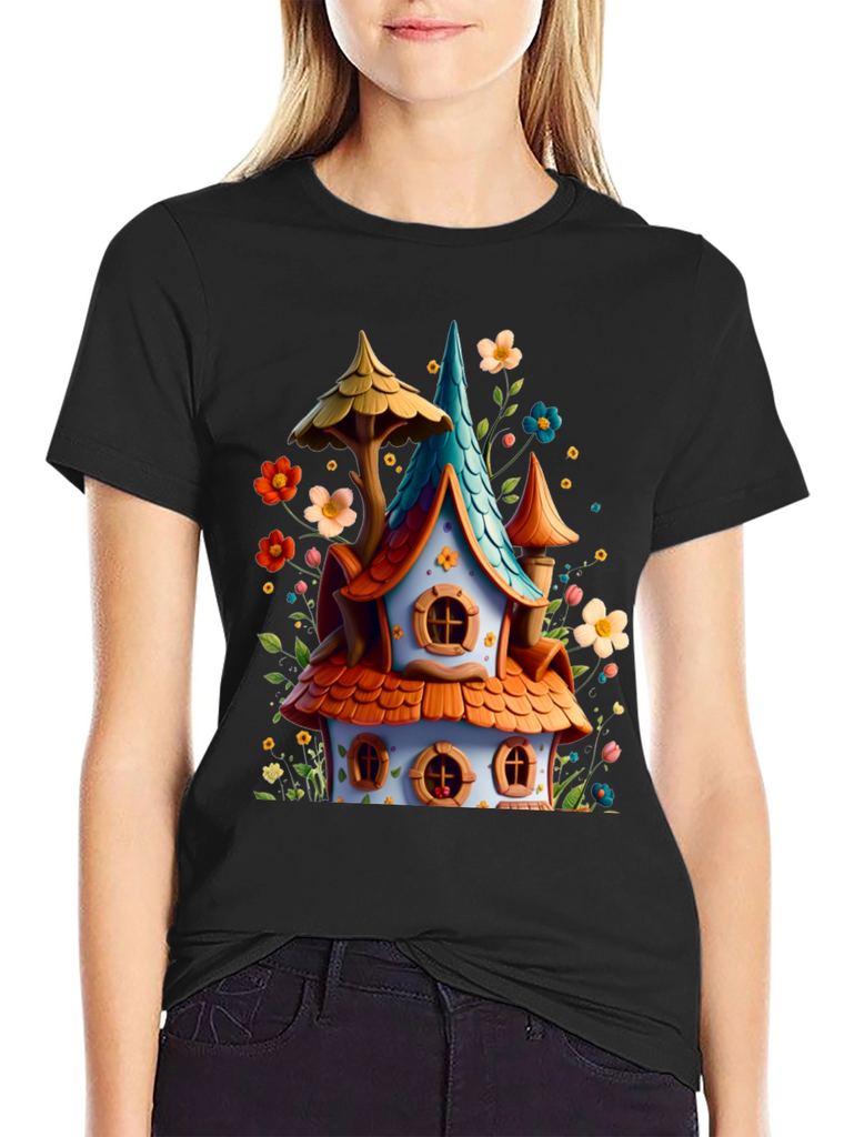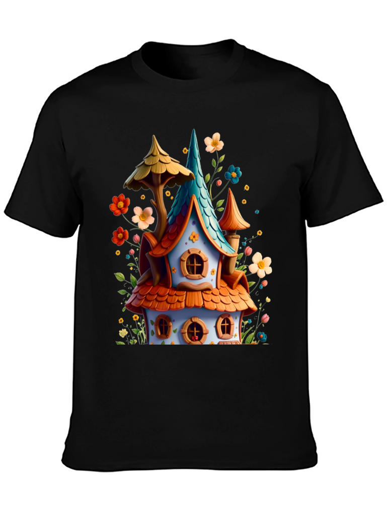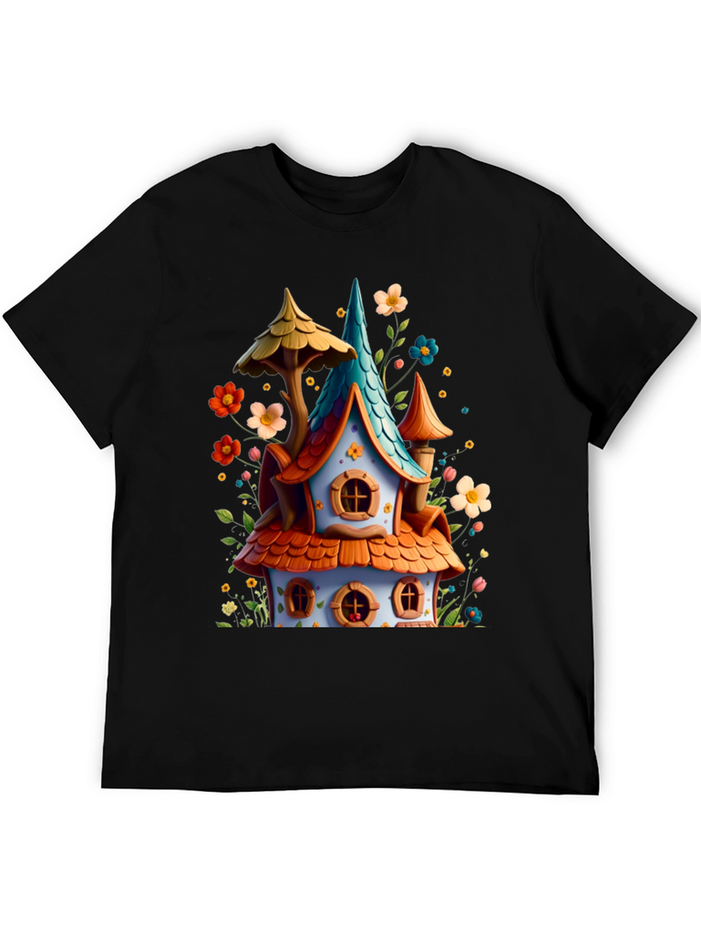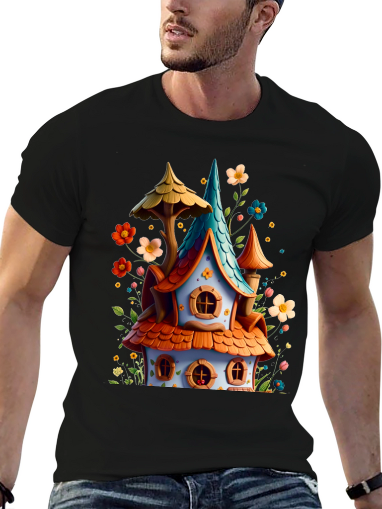Add a touch of fantasy to your wardrobe with this unique graphic tee! Featuring a colorful, whimsical house design with charming details like orange tiled roofing, a turquoise spire, and surrounded by playful flowers. The design offers a joyful, fairytale-like aesthetic. Made with a comfortable black cotton blend, this tee is perfect for everyday wear, casual outings, or themed events. Express your love for fantasy and stand out with this eye-catching and cheerful design!