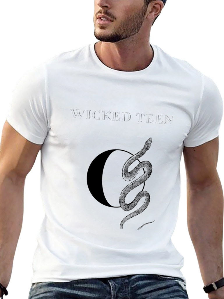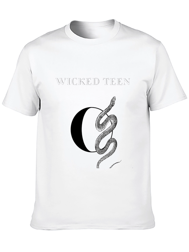 Embrace edgy style with this black graphic tee. Featuring a striking design of a snake coiled around a letter, overlaid onto the words "Wicked Teens", this t-shirt is a statement piece. The classic short-sleeve cut and comfortable fabric make it ideal for casual wear. Show off your unique style at concerts, parties, or everyday outings. Pair it with jeans and sneakers for a cool, relaxed look. The bold graphic ensures you'll stand out from the crowd.