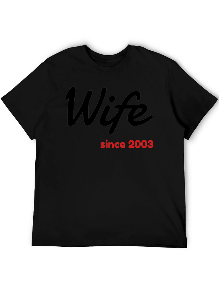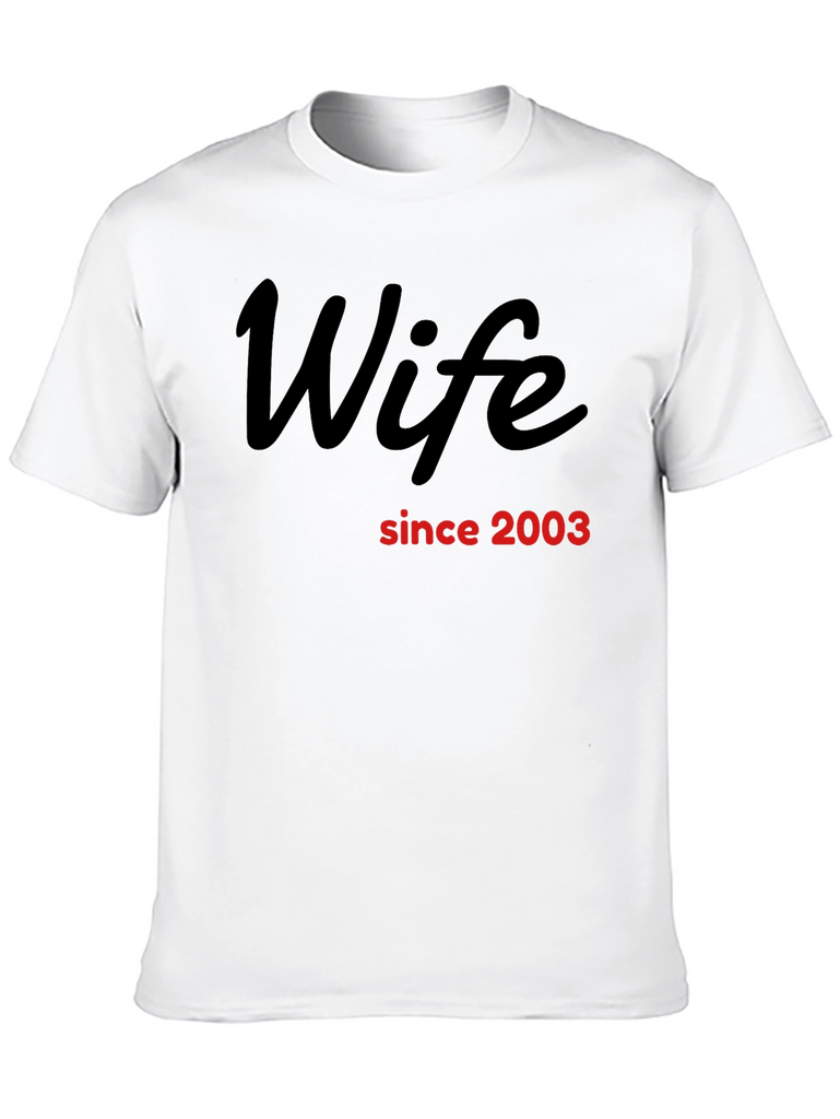 Celebrate your enduring love with this classic black t-shirt. The shirt features the word "Wife" in a stylish font, accompanied by "since 2003" in a bold red. Made from a comfortable, breathable fabric, this tee is perfect for everyday wear or special occasions. Show off your commitment and sense of humor with this unique and eye-catching design. Whether you're running errands, lounging at home, or celebrating an anniversary, this t-shirt is a fun and fashionable way to express your pride. It makes a great gift for a wife who has been cherished since 2003!