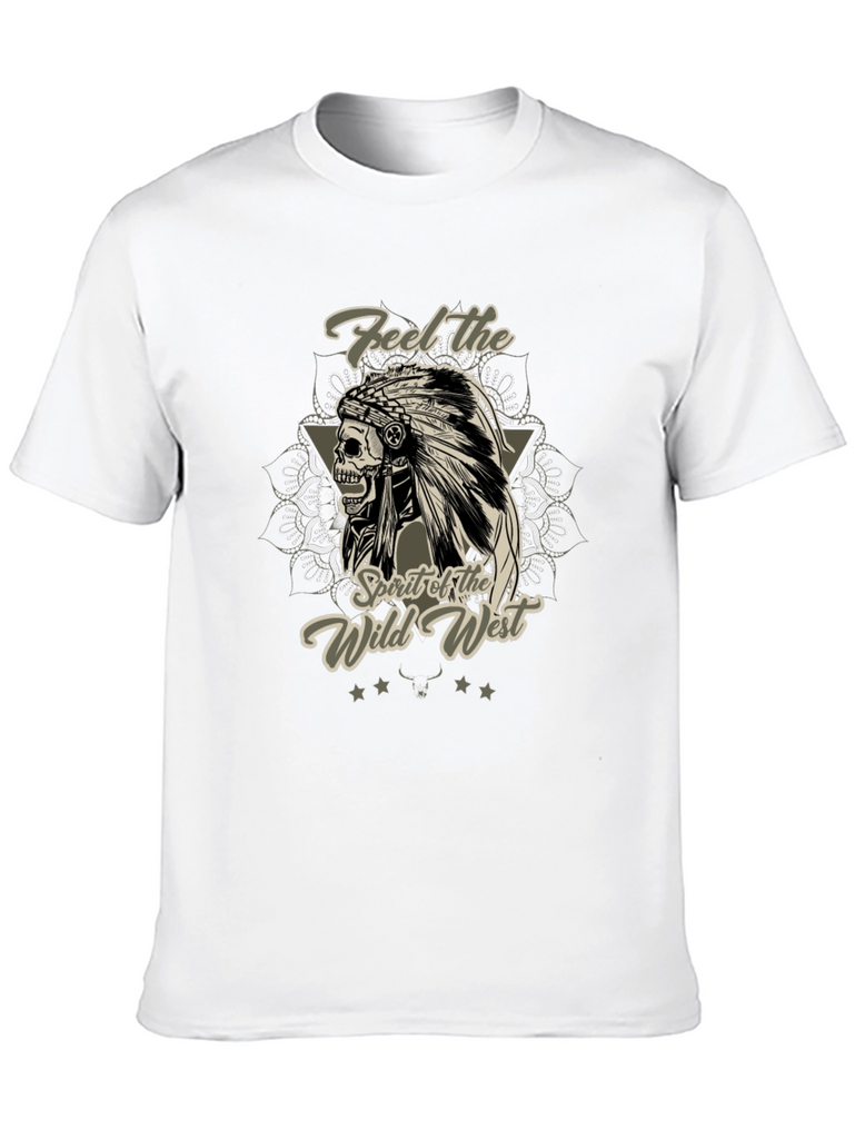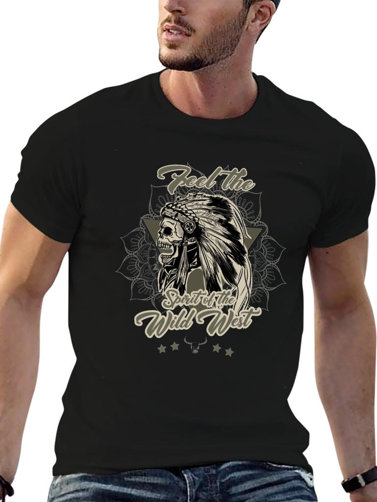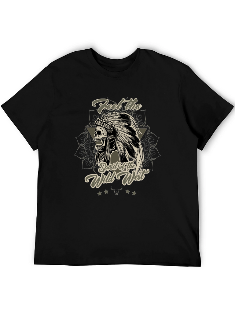 Embrace the spirit of the Wild West with this eye-catching black t-shirt. Featuring a unique graphic of a skull adorned with Native American headdress elements, this tee exudes a bold and edgy vibe. The phrase "Feel the Spirit of the Wild West" is emblazoned above and below the skull, complemented by subtle decorative elements, and geometric shapes. Made from comfortable fabric, this shirt is perfect for casual wear, concerts, or making a statement wherever you go. Show off your individual style with this one-of-a-kind graphic tee.