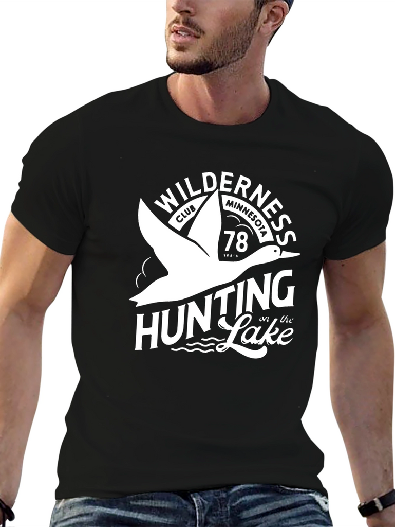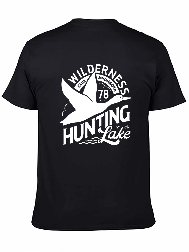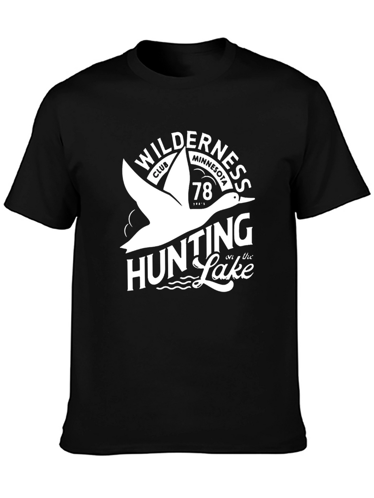 Showcase your love for the great outdoors with this striking black T-shirt. The tee features a bold, vintage-style graphic depicting a flying duck along with the words "Wilderness Club Minnesota 78" and "Hunting on the Lake." The design evokes a sense of adventure and rustic charm. Made from what appears to be a comfortable, breathable cotton blend, this T-shirt is perfect for casual wear, outdoor activities, or as a gift for the hunting enthusiast in your life. Pair it with jeans or shorts for a relaxed, stylish look that celebrates the spirit of the wilderness.
