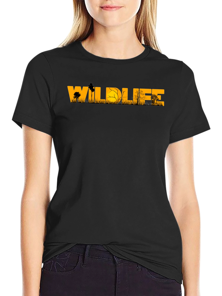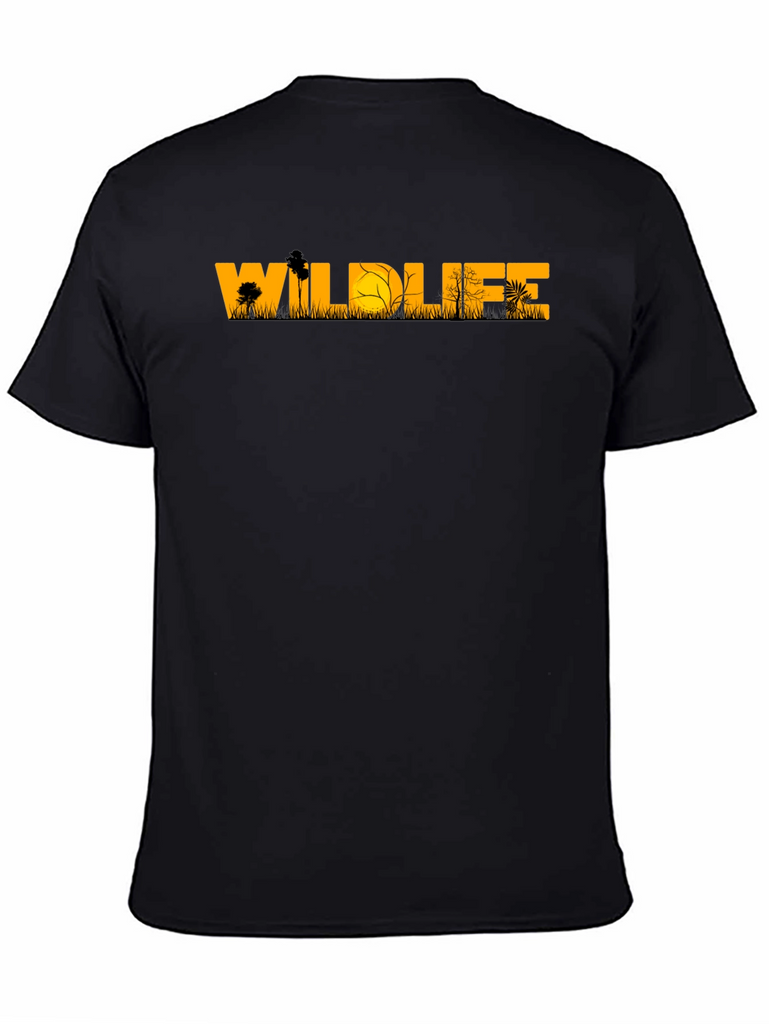 Showcase your love for nature with this unique wildlife-themed t-shirt. Crafted from a soft, breathable black fabric, this tee features a bold "WILDLIFE" graphic across the chest, with a silhouette of natural scenery filling in each letter. The design includes depictions of grasslands, trees, and a sun or moon, creating a serene outdoor feel. This short-sleeved shirt is perfect for casual wear, outdoor adventures, or as a thoughtful gift for nature enthusiasts. Its classic fit ensures comfort and versatility. Embrace the call of the wild with this stylish statement piece.