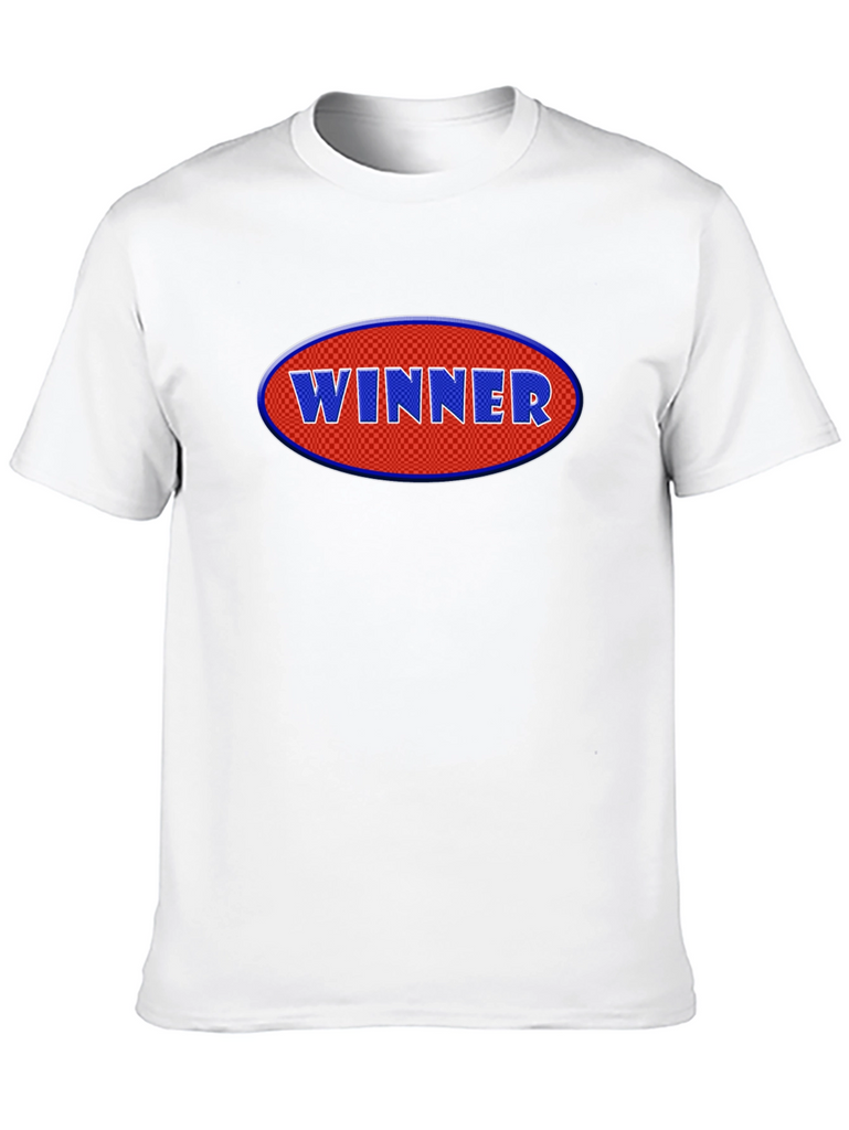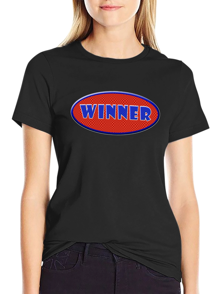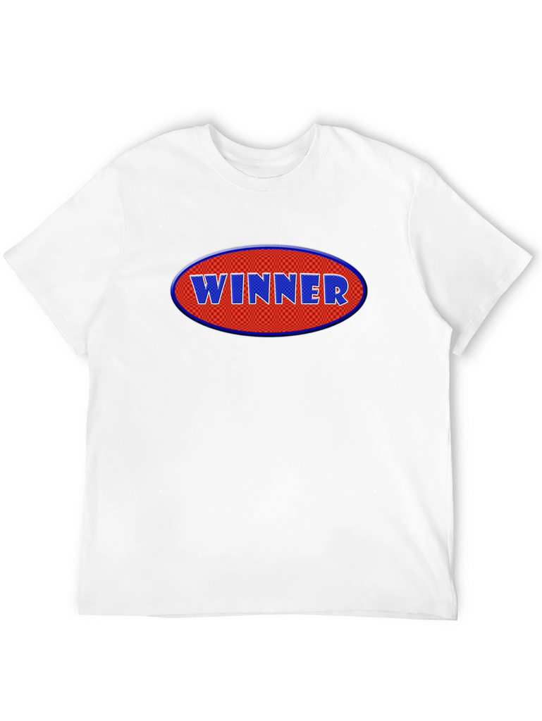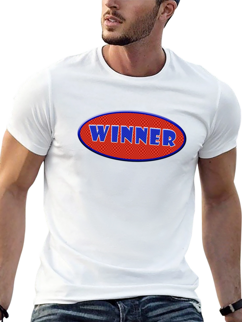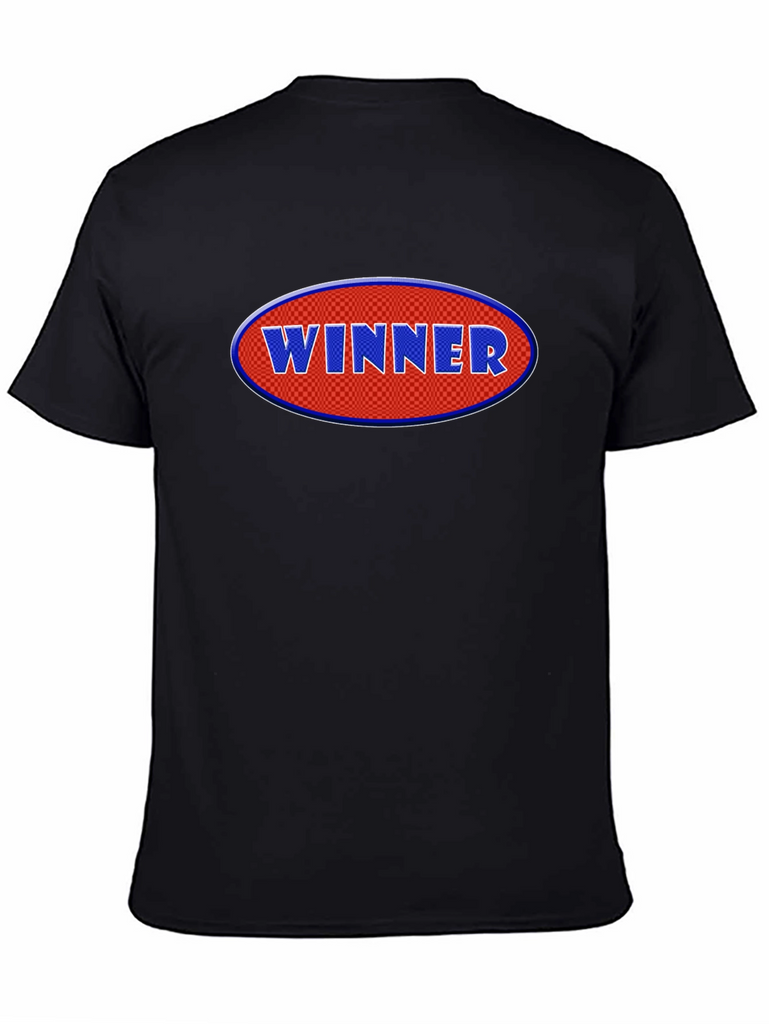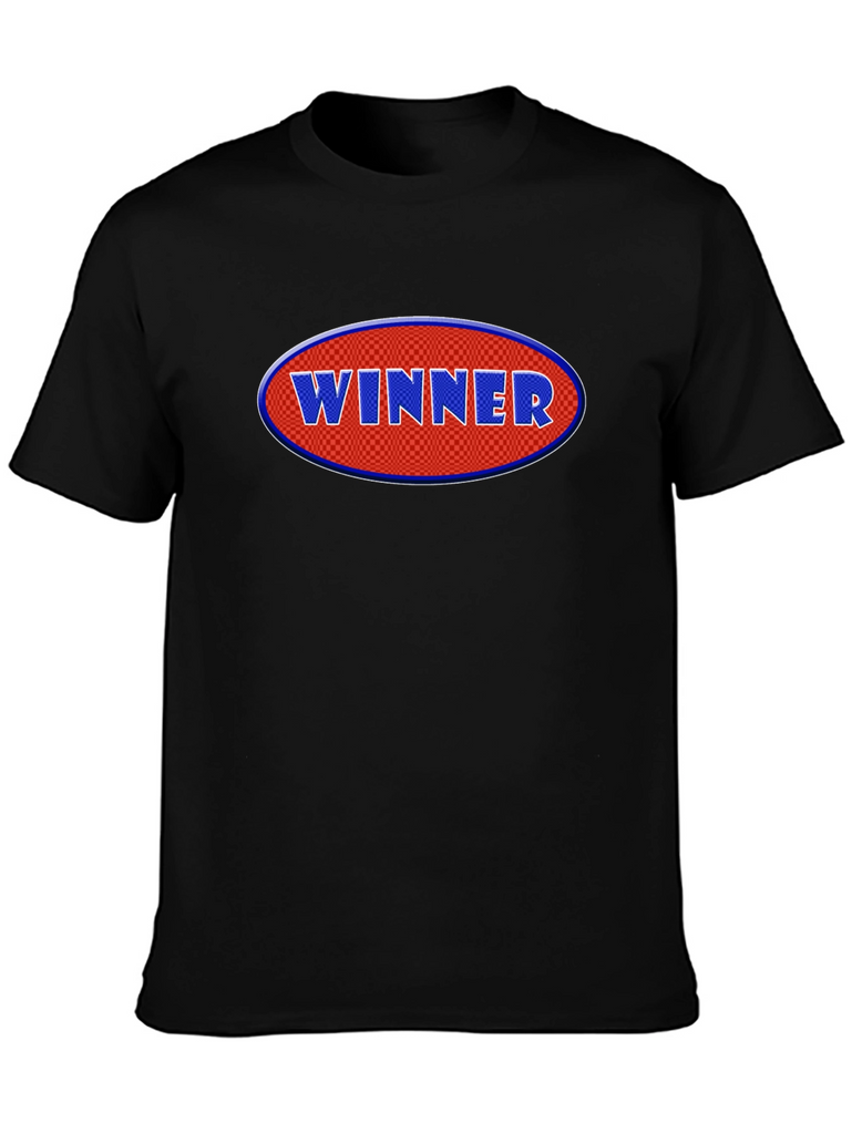 Declare victory with this eye-catching black t-shirt! Featuring a bold, oval graphic with the word "WINNER" in raised, blue lettering against a red, checkered background, this tee makes a statement. Crafted from a comfortable cotton blend, it offers a relaxed fit for everyday wear. The short sleeves and classic crew neck add to its casual appeal. Perfect for showcasing your winning attitude at sports events, casual outings, or just lounging around. Grab yours and wear your success!