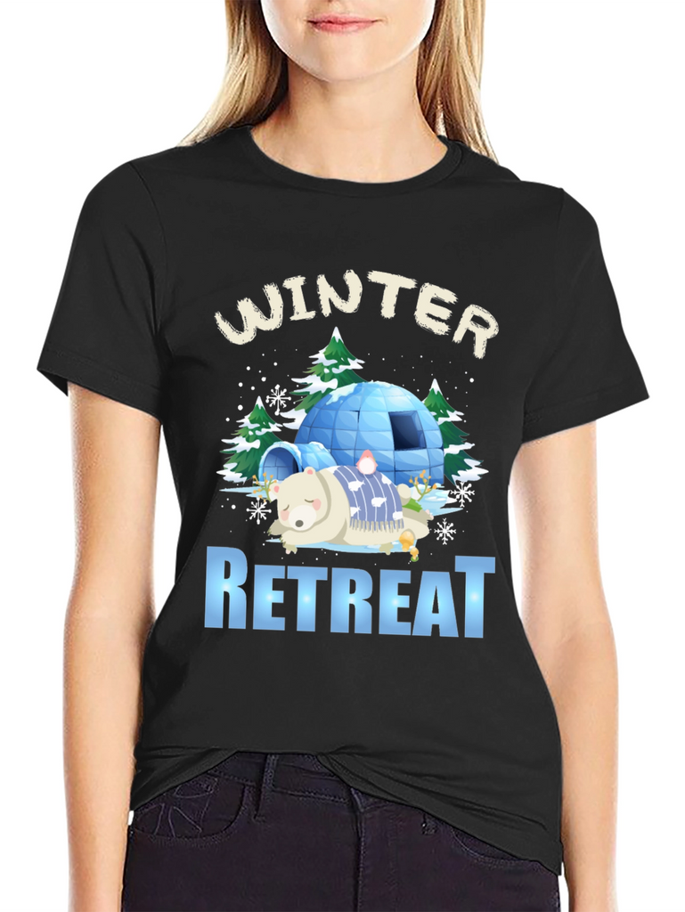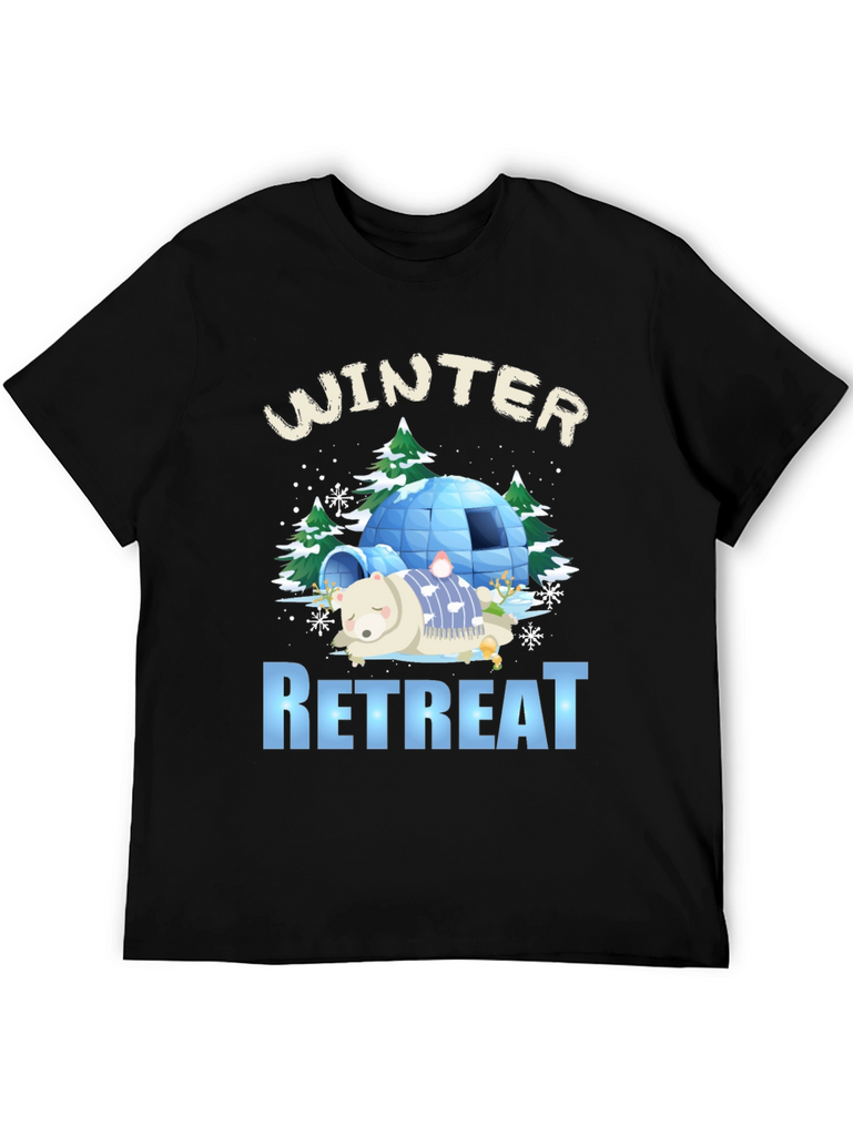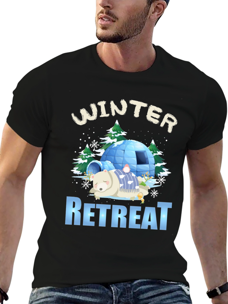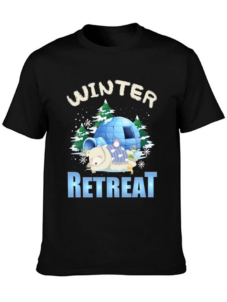 Stay cozy this winter in our Winter Retreat Graphic T-Shirt. Featuring a charming design with a sleepy polar bear, igloo, and snowy trees, this tee brings the serenity of a winter getaway to your wardrobe. The blue and white details pop against the black backdrop, making it a versatile piece. Crafted from a soft, breathable fabric, this t-shirt offers all-day comfort. Ideal for casual outings, lounging at home, or as a thoughtful gift for winter enthusiasts. Embrace the cold season in style and comfort.