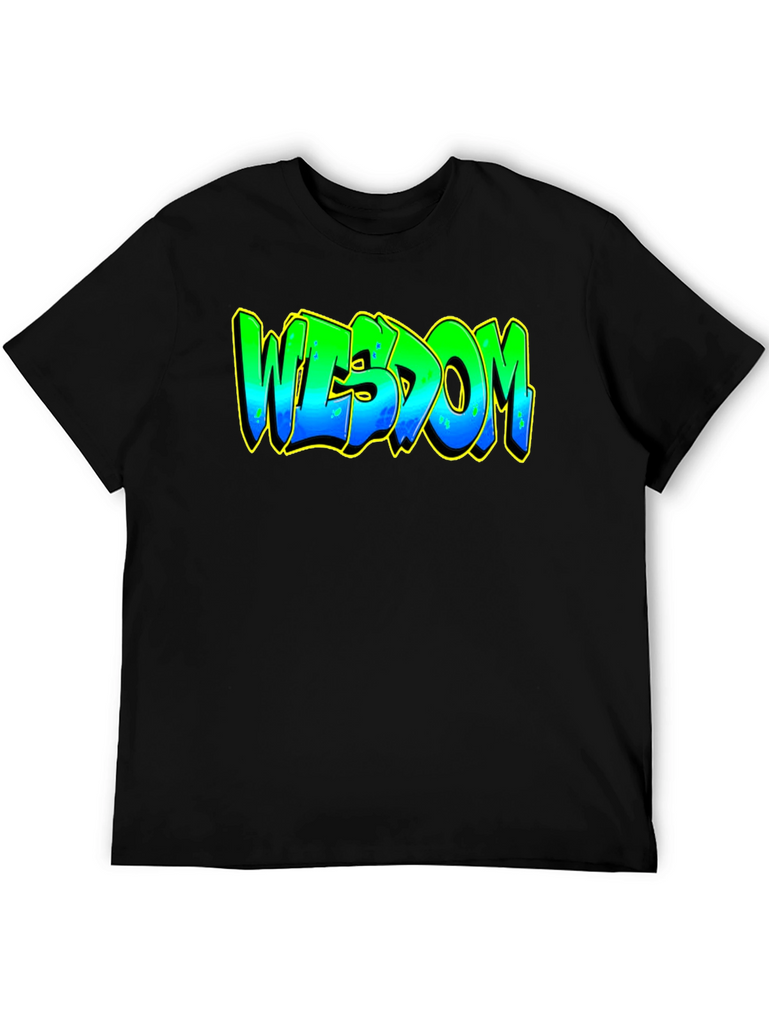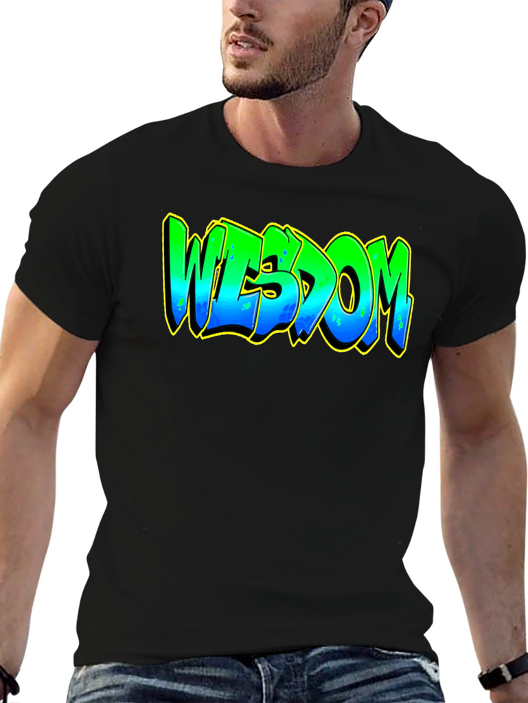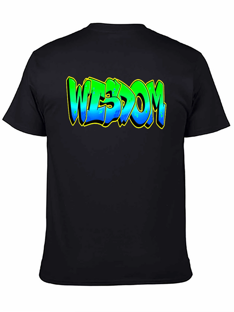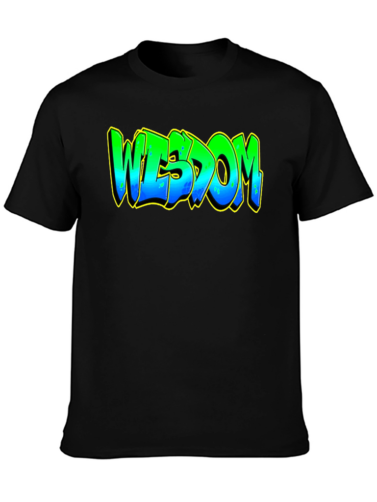 Elevate your casual style with this striking black graphic t-shirt. The bold design features the word "WISDOM" in a vibrant, graffiti-inspired font. The lettering transitions from green at the top to blue at the bottom, accented with a yellow outline that makes the design pop. Crafted from a comfortable and durable fabric, this tee is perfect for everyday wear. Whether you're heading to a casual hangout, expressing your unique style, or just relaxing at home, this t-shirt is a great way to showcase your individuality and wisdom. Pair it with jeans, shorts, or joggers for a cool and effortless look.