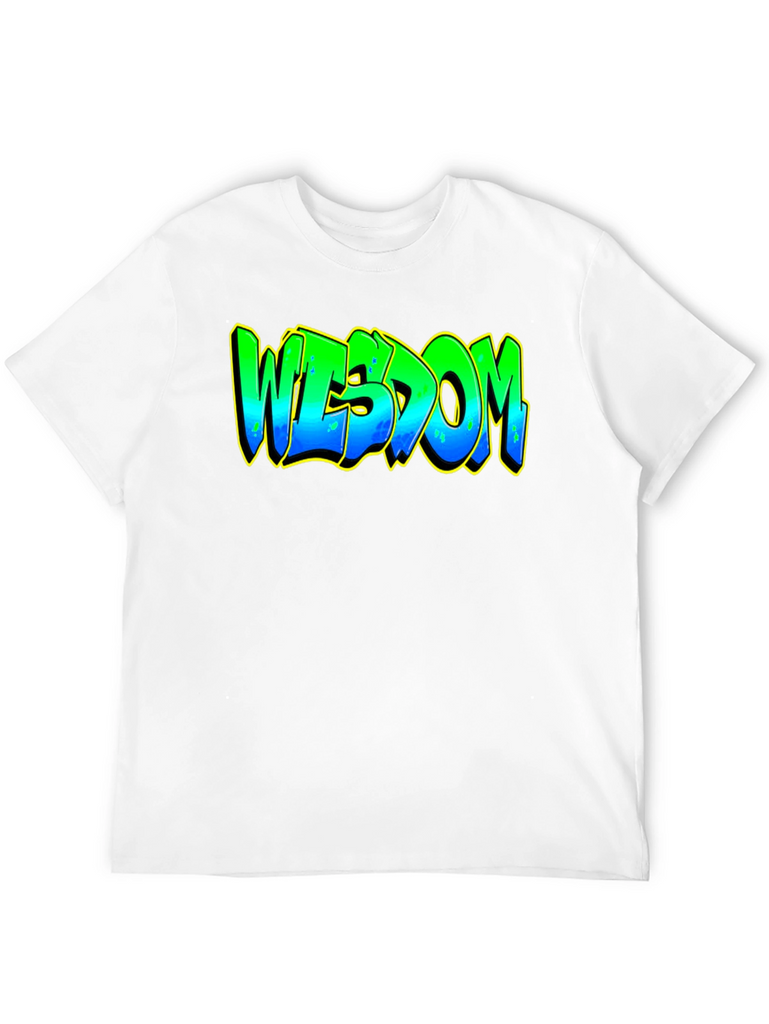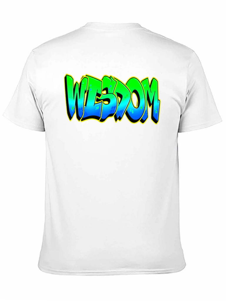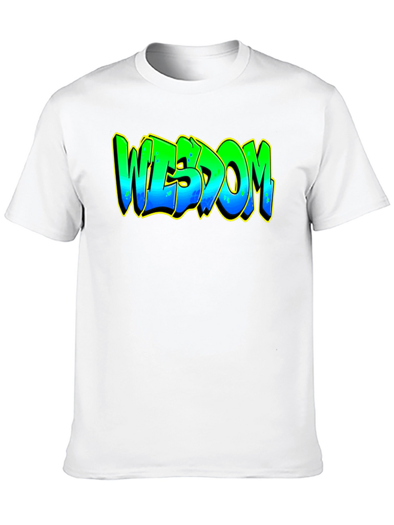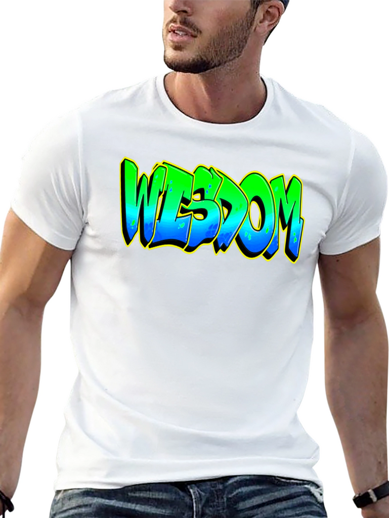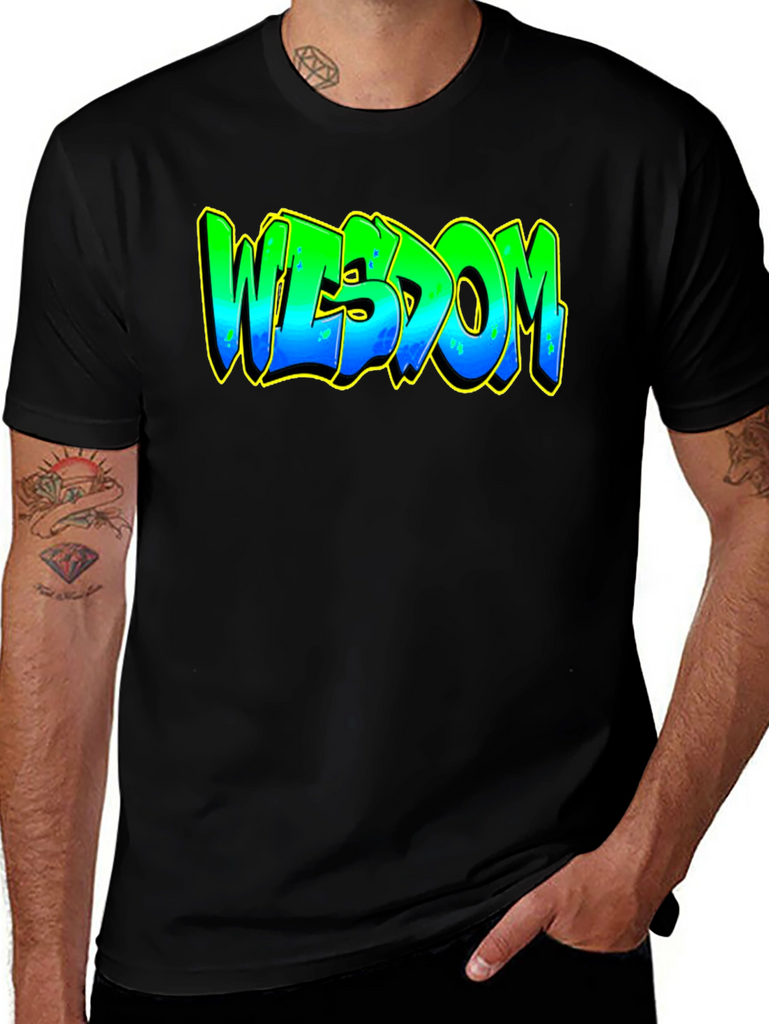 Elevate your casual style with this striking black graphic t-shirt. The bold design features the word "WISDOM" in a vibrant, graffiti-inspired font. The lettering transitions from green at the top to blue at the bottom, accented with a yellow outline that makes the design pop. Crafted from a comfortable and durable fabric, this tee is perfect for everyday wear. Whether you're heading to a casual hangout, expressing your unique style, or just relaxing at home, this t-shirt is a great way to showcase your individuality and wisdom. Pair it with jeans, shorts, or joggers for a cool and effortless look.