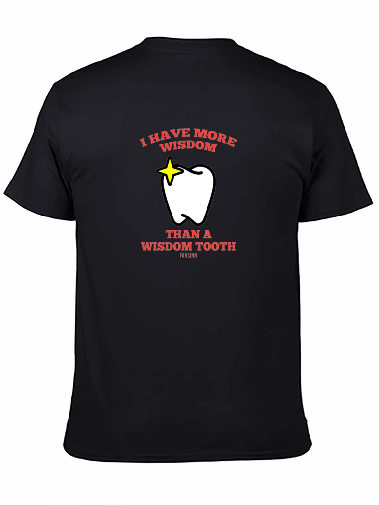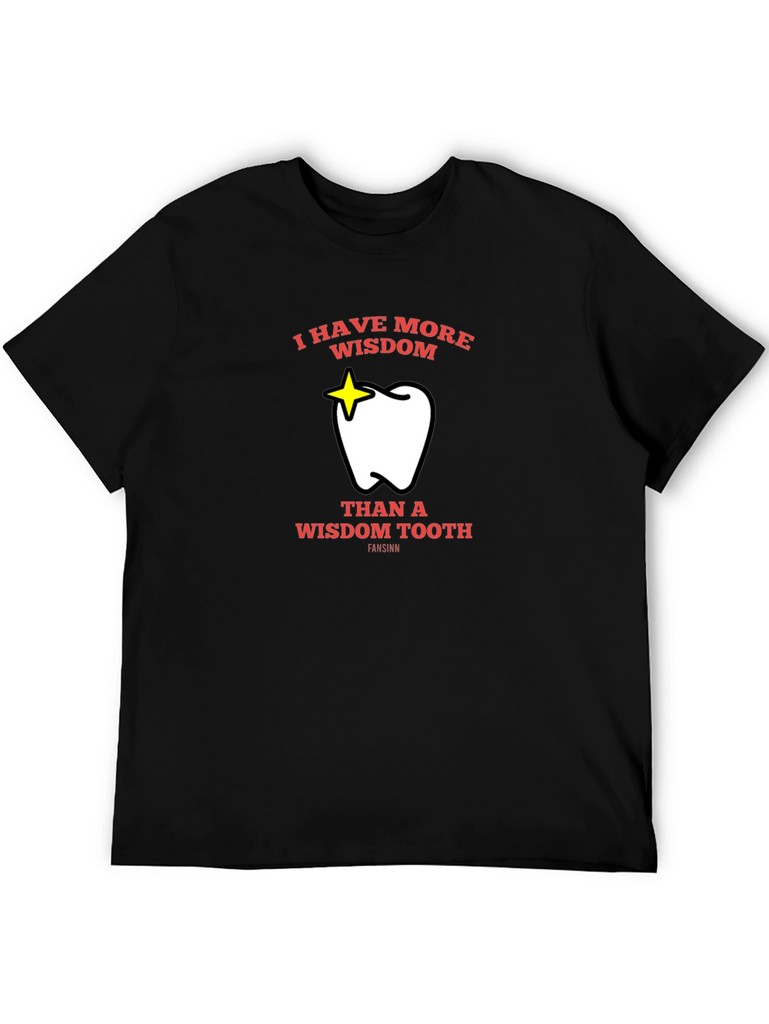 Show off your wit with this eye-catching black T-shirt featuring a playful dental design. The tee features a gleaming white tooth with a sparkling yellow star and the humorous message 'I HAVE MORE WISDOM THAN A WISDOM TOOTH.' Crafted from a soft-looking fabric, this shirt offers both comfort and style. Ideal for dentists, dental students, or anyone with a great sense of humor, this tee is perfect for casual wear, dental conferences, or as a fun gift. Stand out from the crowd and let your wisdom shine with this unique and conversation-starting T-shirt.