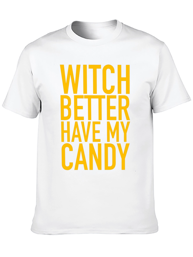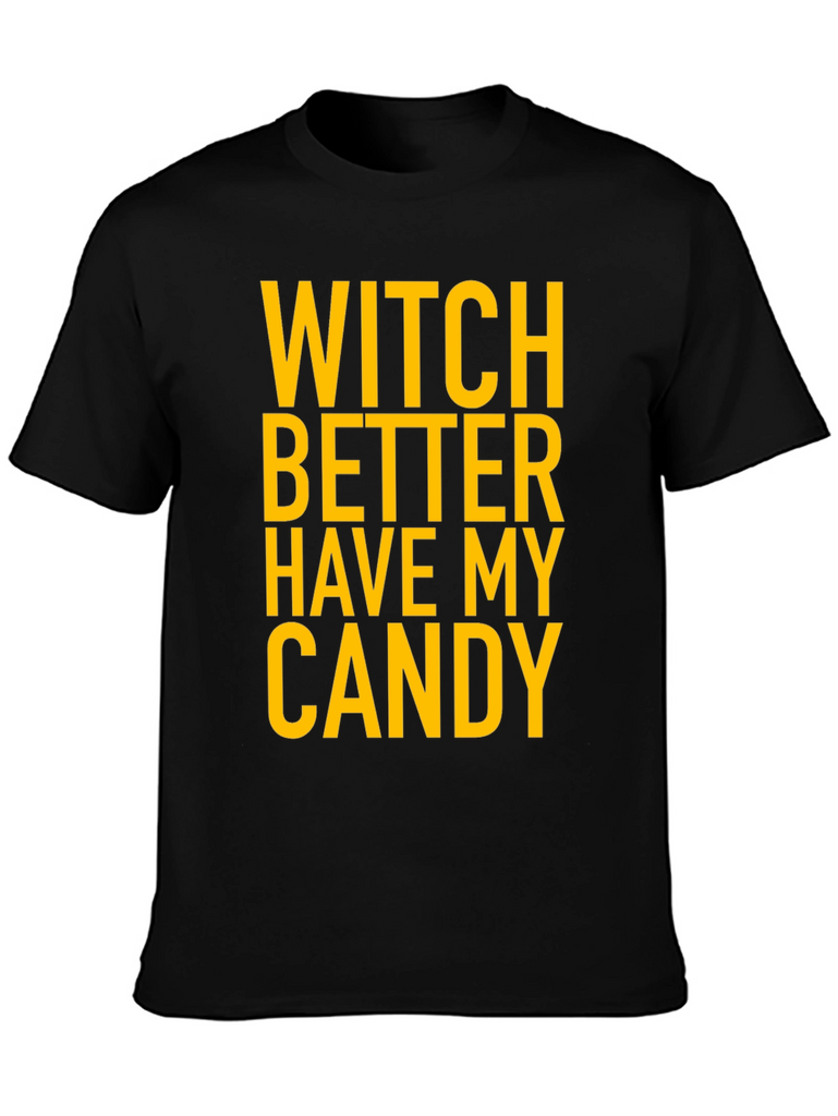 Get ready for Halloween with this fun and festive black t-shirt! The bold, yellow text "Witch Better Have My Candy" makes a statement and is perfect for trick-or-treating, parties, or casual wear. Made from a comfortable-looking fabric, this tee is ideal for both men and women who love Halloween. Show off your spooky spirit with this unique and eye-catching design, and get ready for some serious candy collecting this season. This shirt is bound to be a hit!