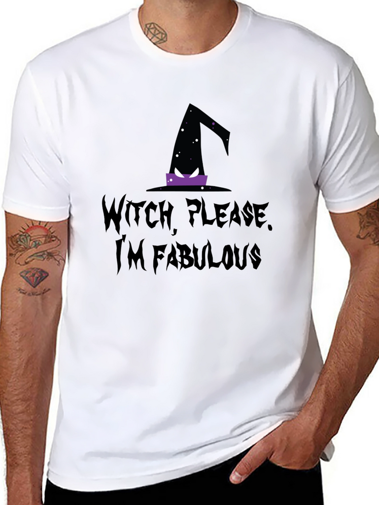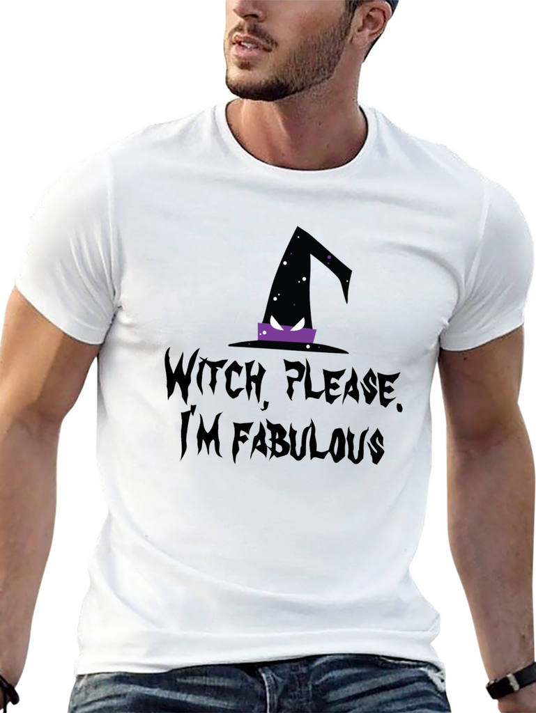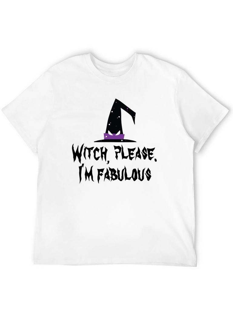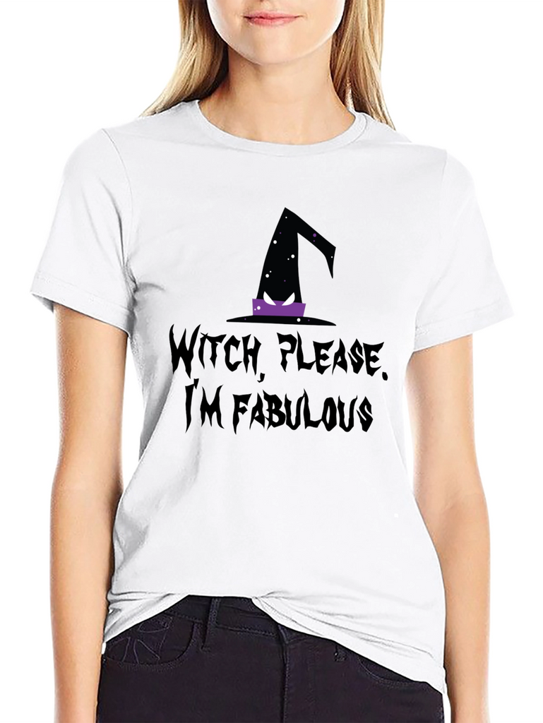 This black t-shirt features a playful graphic design. It showcases a witch hat with a purple brim and the witty phrase 'Witch Please, I'm Fabulous' printed below in a spooky font. The shirt is a classic crew neck style, ideal for casual wear and Halloween-themed events. The t-shirt appears to be made of a comfortable material, and its black color makes it versatile for pairing with various outfits. Show off your fabulous side with this fun and unique t-shirt, perfect for expressing your personality.