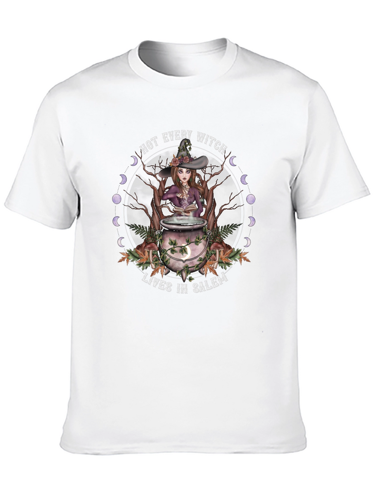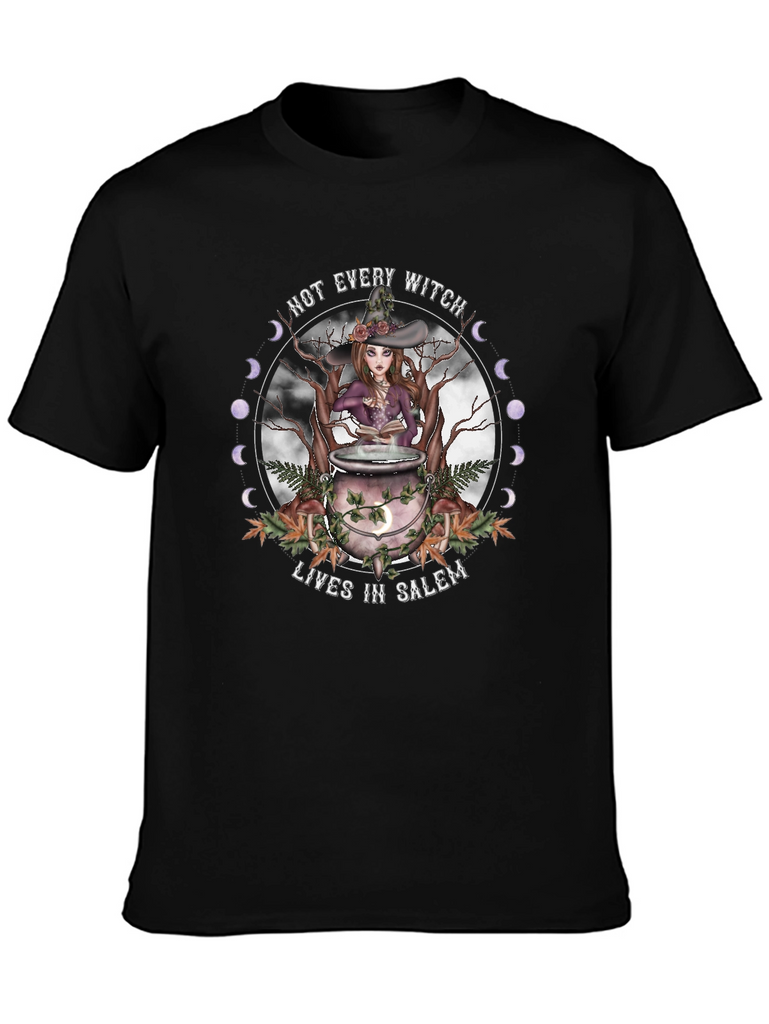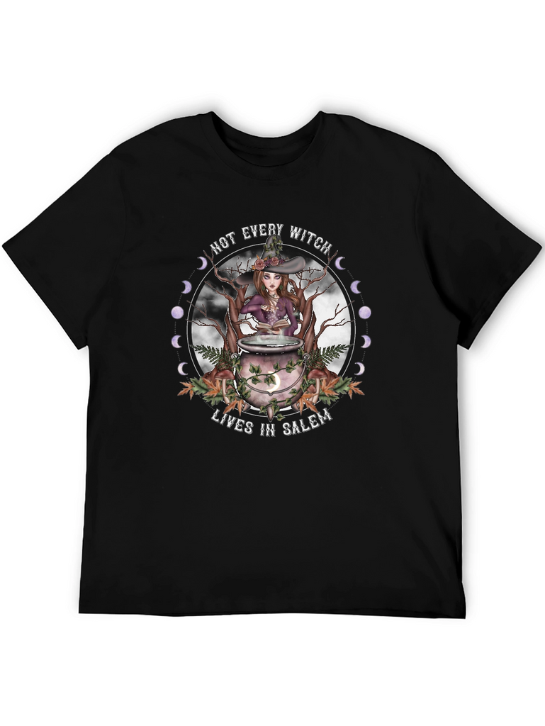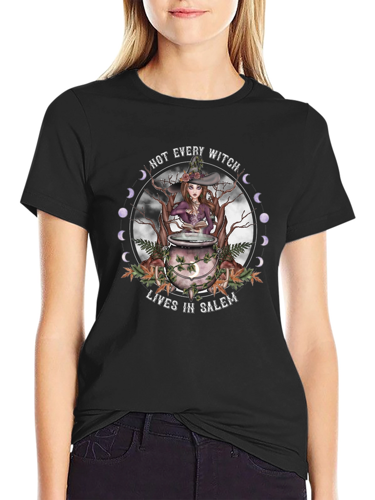 Embrace the mystical spirit with this eye-catching black t-shirt. The design features a captivating scene of a witch brewing a potion, surrounded by crescent moons and autumn foliage. The phrase "Not Every Witch Lives in Salem" adds a touch of playful rebellion. Made from soft, breathable fabric, this t-shirt is perfect for casual wear, Halloween parties, or expressing your unique style. A comfortable fit makes it ideal for everyday adventures or cozy nights in. Show off your love for magic and the occult with this standout graphic tee.