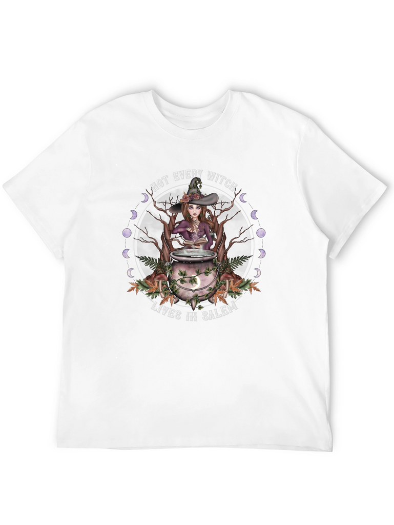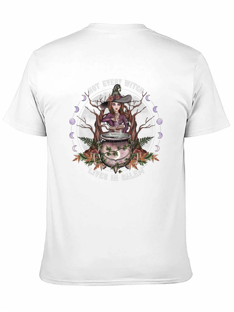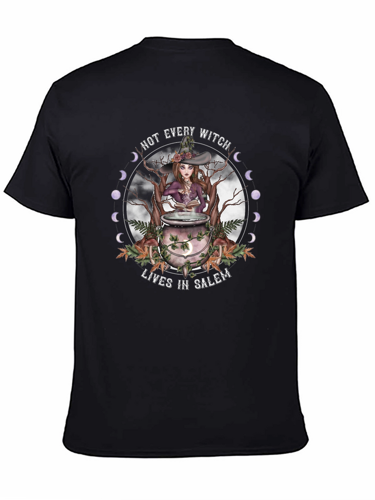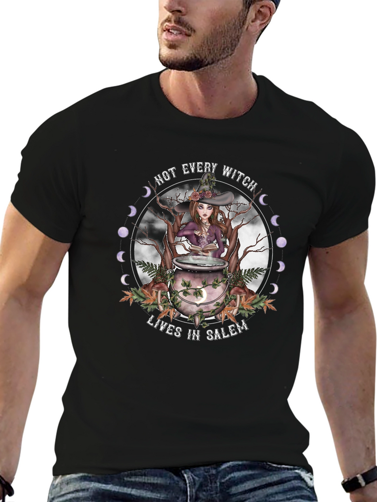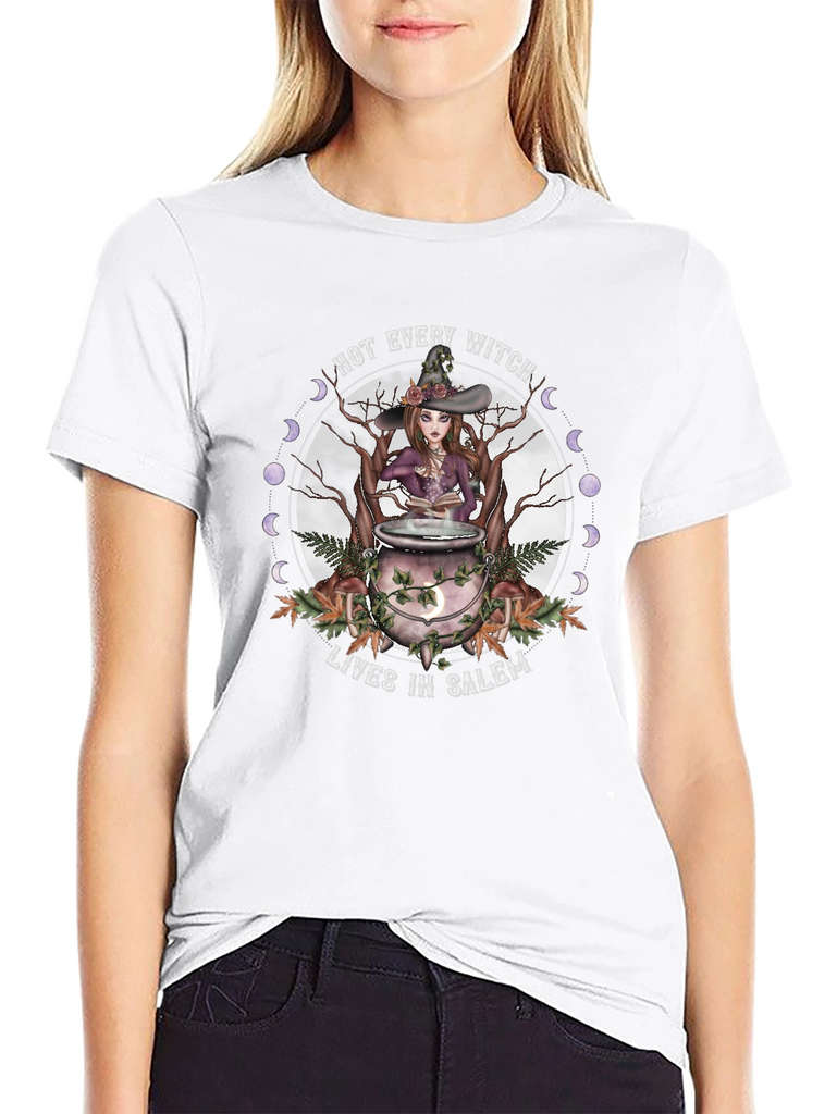 Embrace the mystical spirit with this eye-catching black t-shirt. The design features a captivating scene of a witch brewing a potion, surrounded by crescent moons and autumn foliage. The phrase "Not Every Witch Lives in Salem" adds a touch of playful rebellion. Made from soft, breathable fabric, this t-shirt is perfect for casual wear, Halloween parties, or expressing your unique style. A comfortable fit makes it ideal for everyday adventures or cozy nights in. Show off your love for magic and the occult with this standout graphic tee.