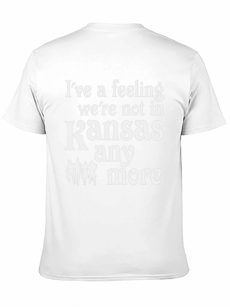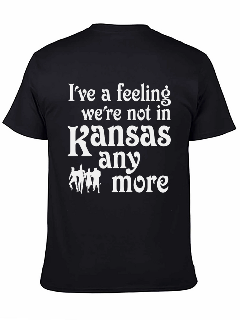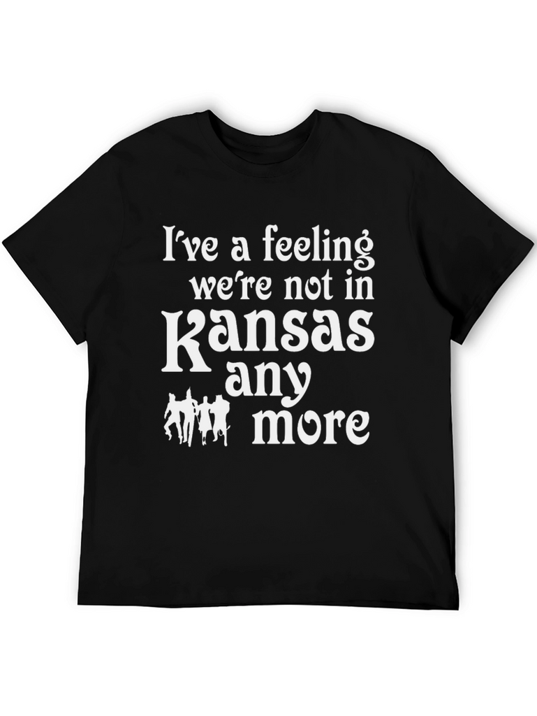 Show off your love for classic movies with this stylish black t-shirt. Featuring the iconic quote "I've a feeling we're not in Kansas anymore" in bold white lettering, this shirt is a must-have for any fan of The Wizard of Oz. The silhouettes of Dorothy and her friends are printed below the text. Made from a comfortable, breathable fabric, it's perfect for everyday wear or a casual night out. This tee is not only a fashion statement, but also a conversation starter! Get ready to turn heads and express your unique style.