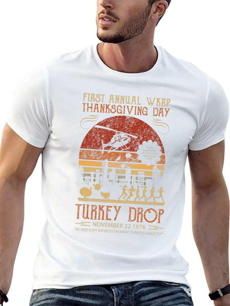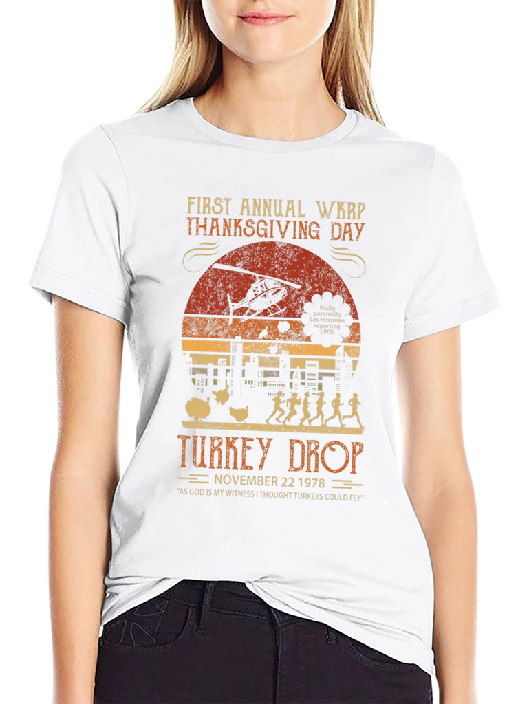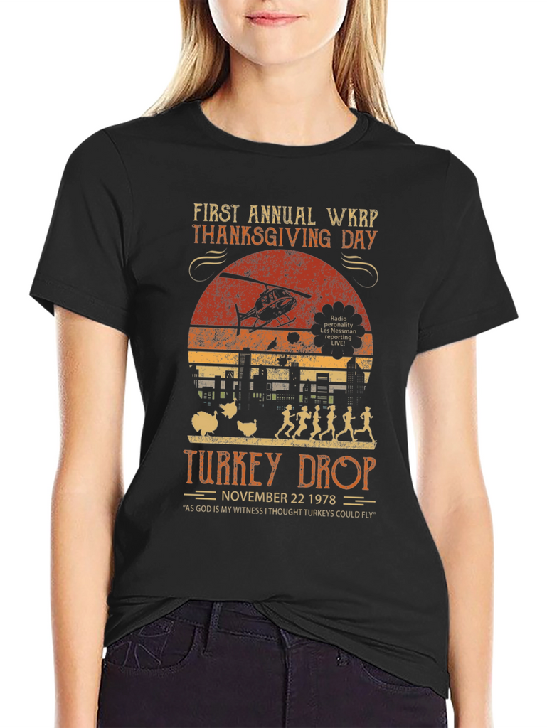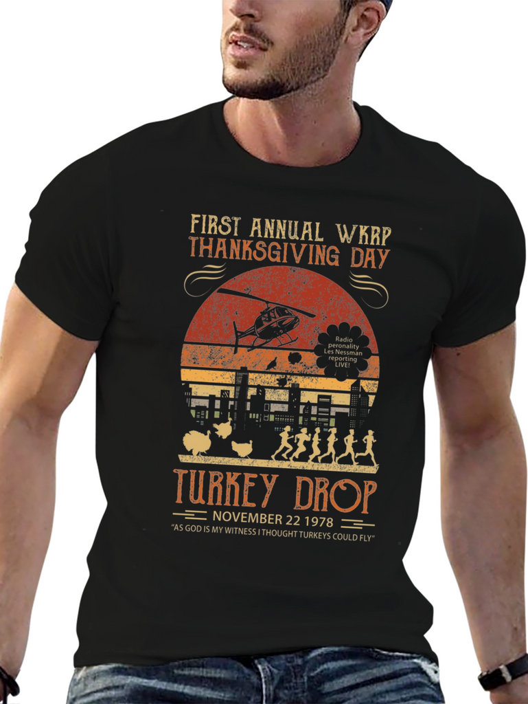 Celebrate a classic TV moment with this unique black t-shirt! Featuring a retro-style graphic design, it commemorates the "First Annual WKRP Thanksgiving Day Turkey Drop". The design shows a helicopter and the city silhouette. It also includes the iconic line, "As God is my witness, I thought turkeys could fly". This tee is perfect for fans of the show and those who appreciate a touch of humor in their wardrobe. Its classic fit makes it suitable for casual wear. It's a great conversation starter and a must-have for any WKRP enthusiast. Get yours now and pay tribute to one of television's most memorable Thanksgiving mishaps!