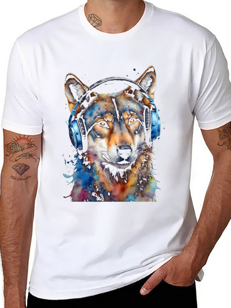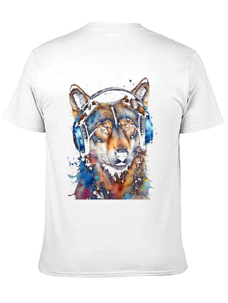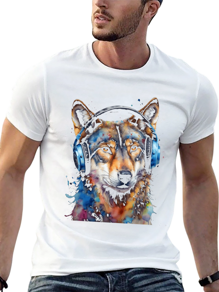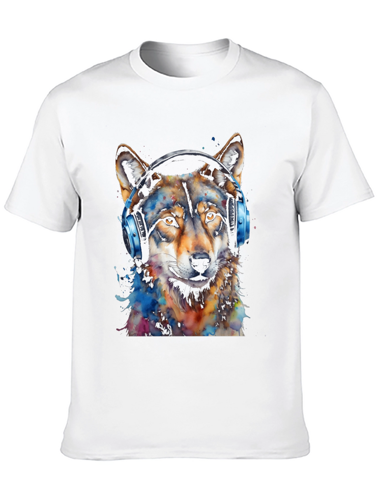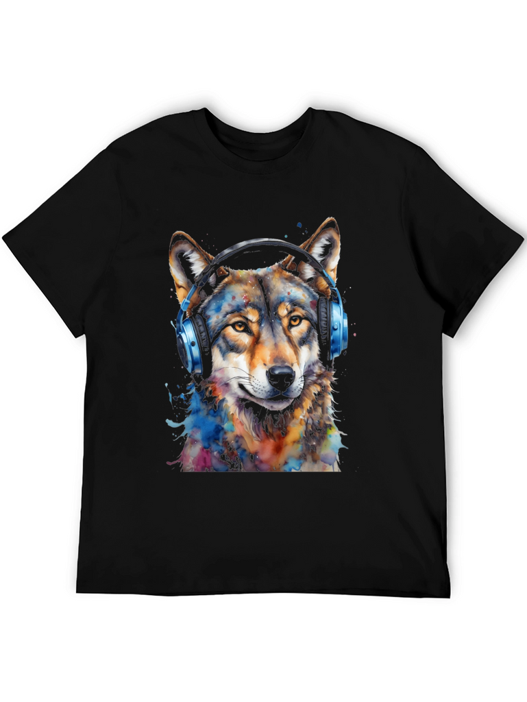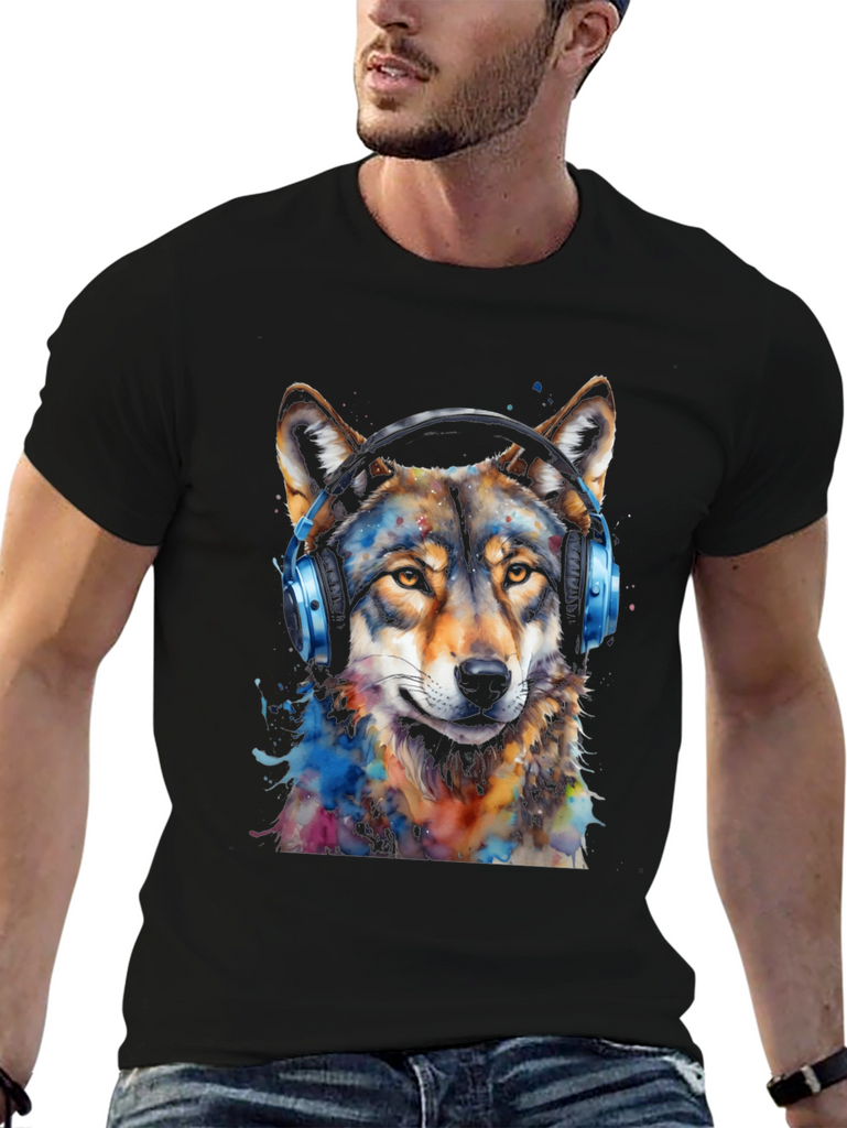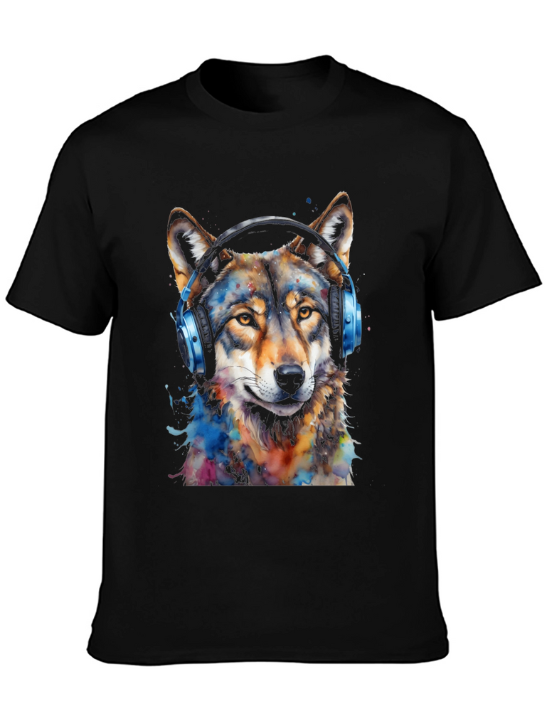 Showcase your love for wildlife and music with this unique black t-shirt. It features a vibrant watercolor-style graphic of a wolf wearing blue headphones. The eye-catching design blends artistry and nature, making it a standout piece for casual wear. Made from a comfortable fabric blend, this short-sleeved tee offers both style and comfort. Perfect for music lovers, animal enthusiasts, or anyone looking to add a pop of color to their wardrobe. Wear it to concerts, casual outings, or while relaxing at home.