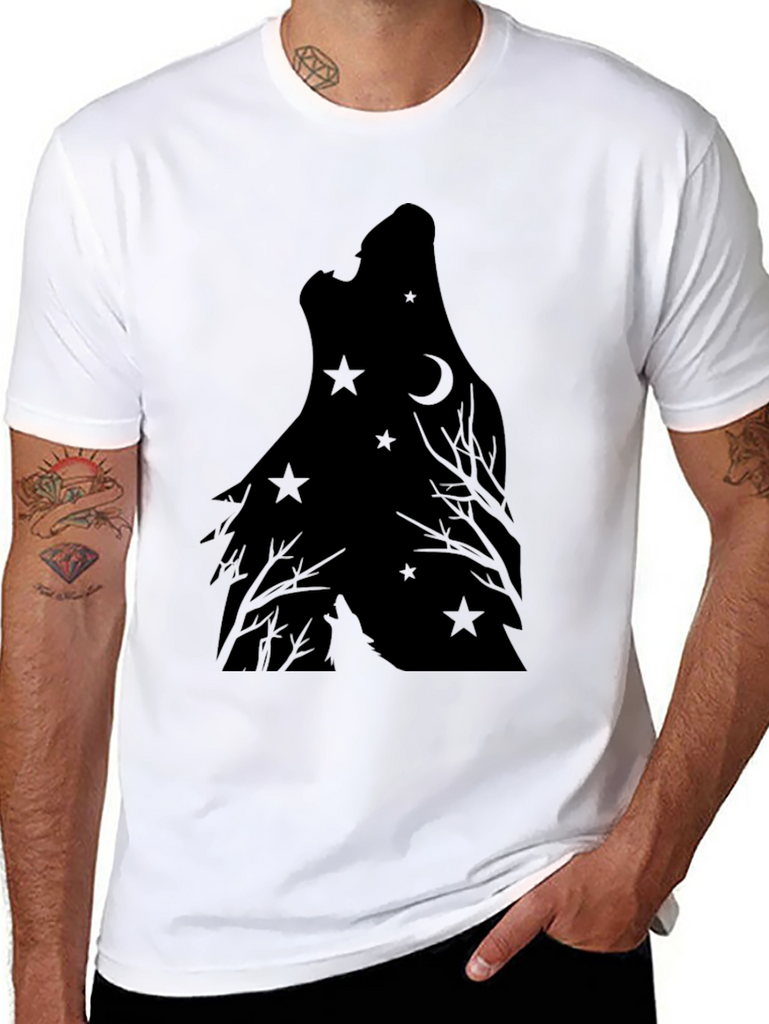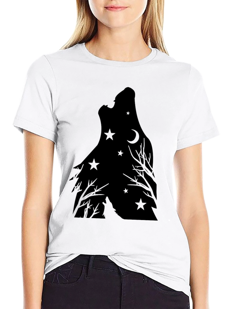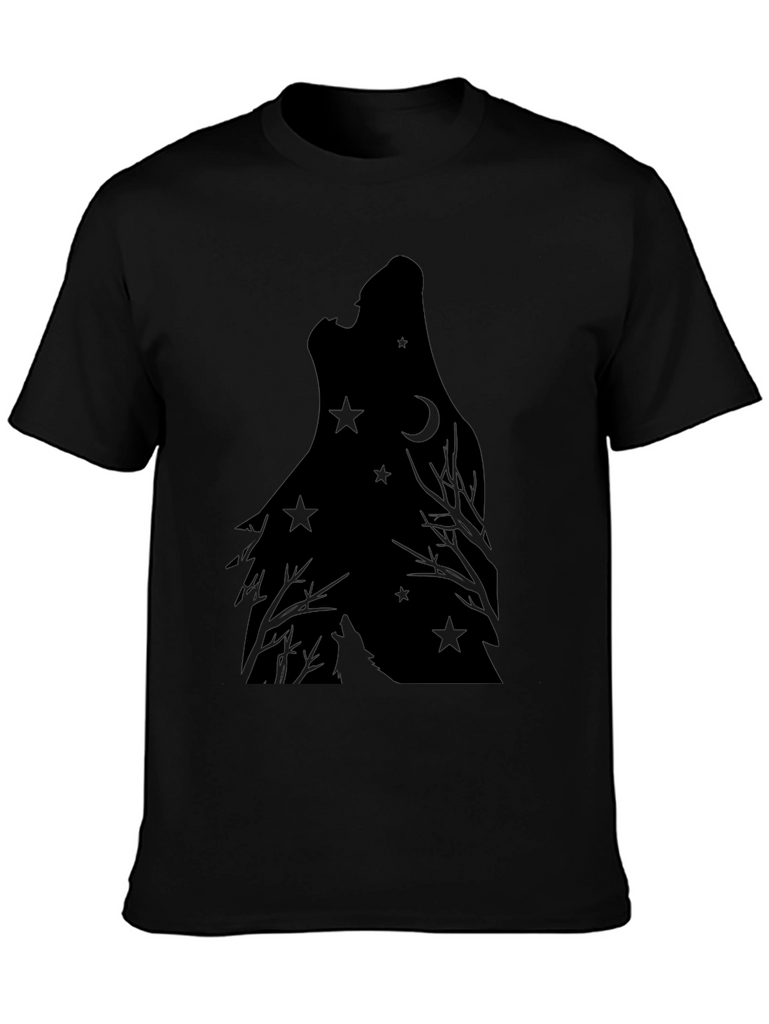 Embrace your wild side with this unique black tee! This striking t-shirt features a bold, silhouette graphic of a wolf howling under a crescent moon, surrounded by stars and silhouetted branches. The design creates a captivating nighttime scene. Made from a comfortable, breathable fabric, this tee is perfect for everyday wear or as a statement piece for any casual occasion. Show off your individual style with this eye-catching and expressive t-shirt. The print will bring a unique and artistic flair to your wardrobe. A must-have for wolf lovers and those who appreciate nature-inspired fashion!