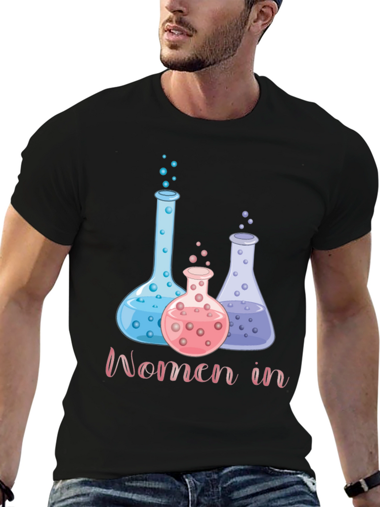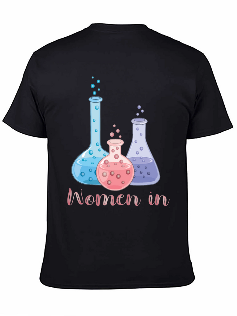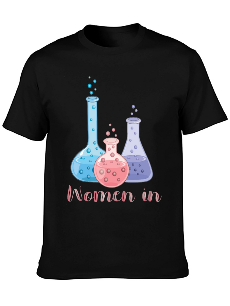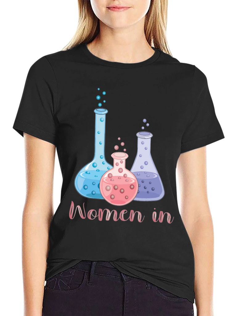 This black t-shirt features a playful and empowering design for women in science. The graphic showcases three colorful beakers filled with bubbling liquids, creating a vibrant and eye-catching visual. Below the beakers, the words "Women in" are written in a stylish, cursive font. Made from comfortable, breathable fabric, this t-shirt is perfect for casual wear. Show your support for women in STEM with this unique and stylish tee. It's a great conversation starter and a fun way to express your passion for science. Ideal for scientists, students, teachers, or anyone who believes in empowering women in STEM fields. A must-have addition to any science enthusiast's wardrobe!