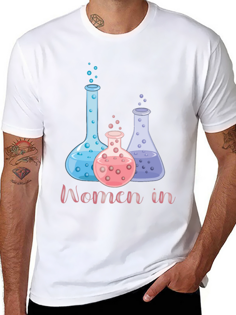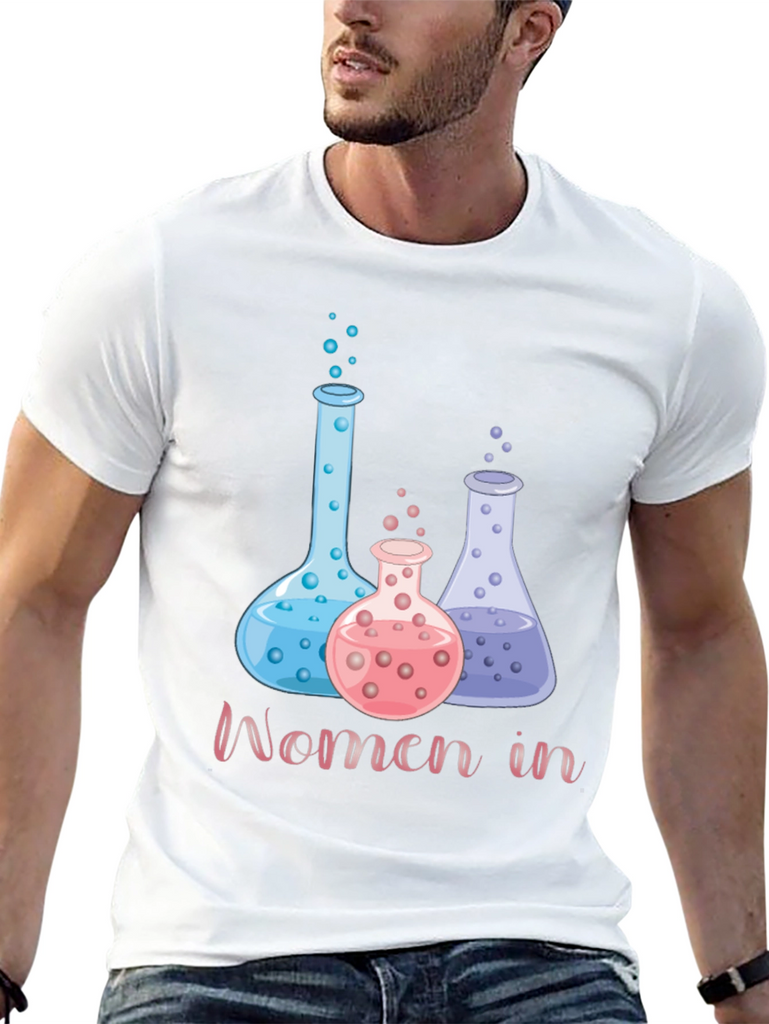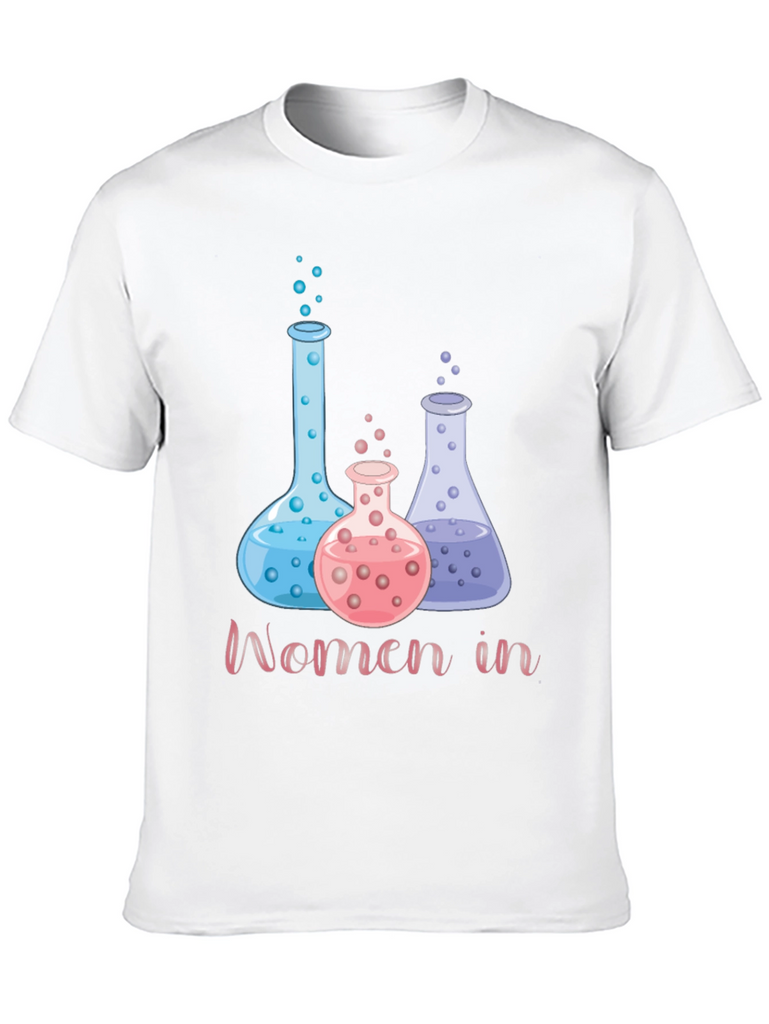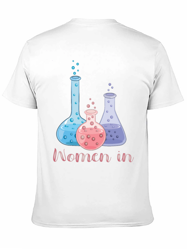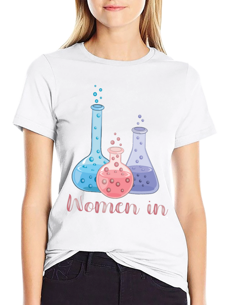 This black t-shirt features a playful and empowering design for women in science. The graphic showcases three colorful beakers filled with bubbling liquids, creating a vibrant and eye-catching visual. Below the beakers, the words "Women in" are written in a stylish, cursive font. Made from comfortable, breathable fabric, this t-shirt is perfect for casual wear. Show your support for women in STEM with this unique and stylish tee. It's a great conversation starter and a fun way to express your passion for science. Ideal for scientists, students, teachers, or anyone who believes in empowering women in STEM fields. A must-have addition to any science enthusiast's wardrobe!