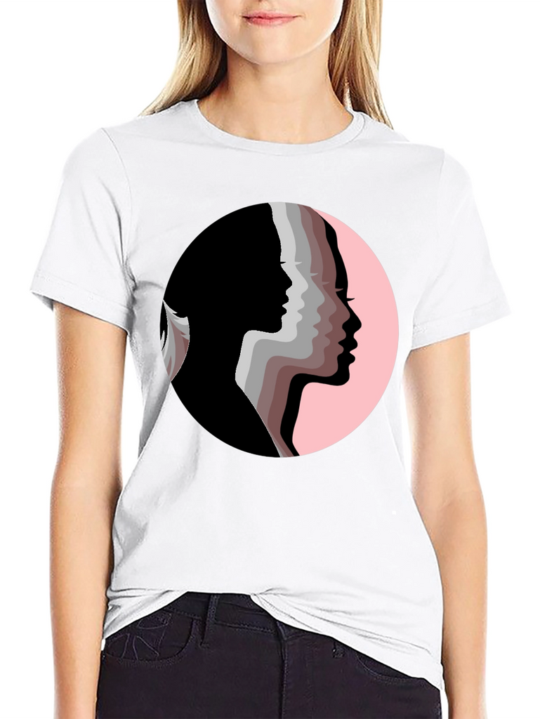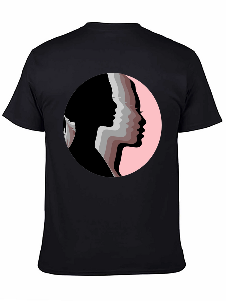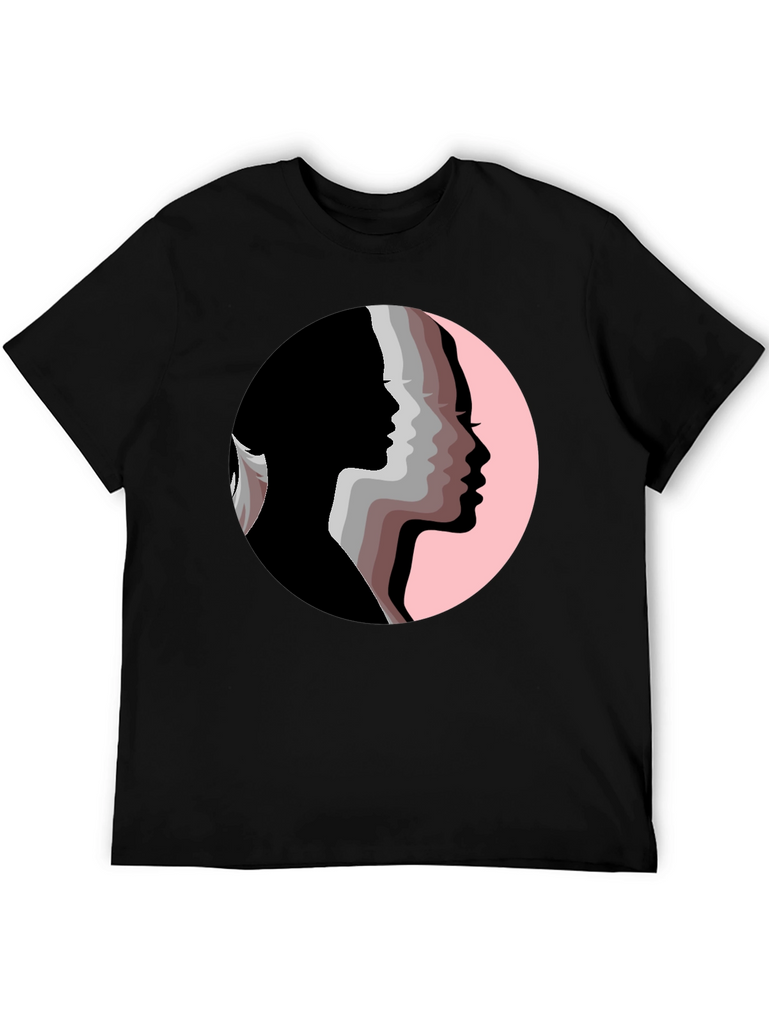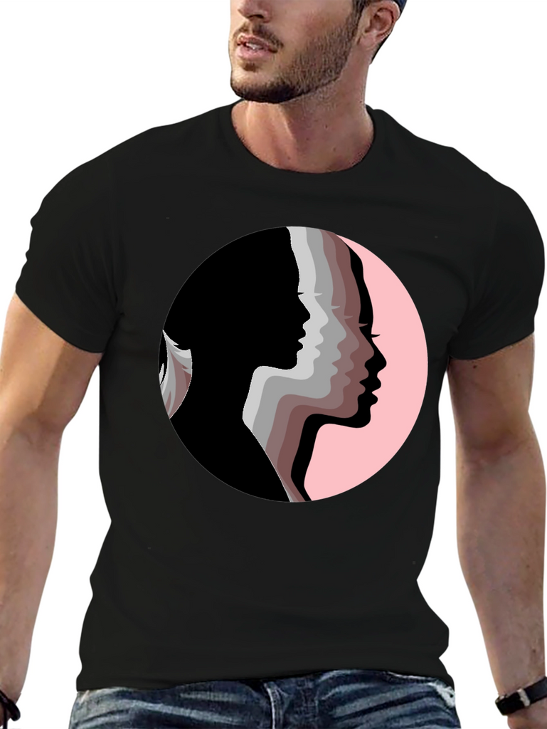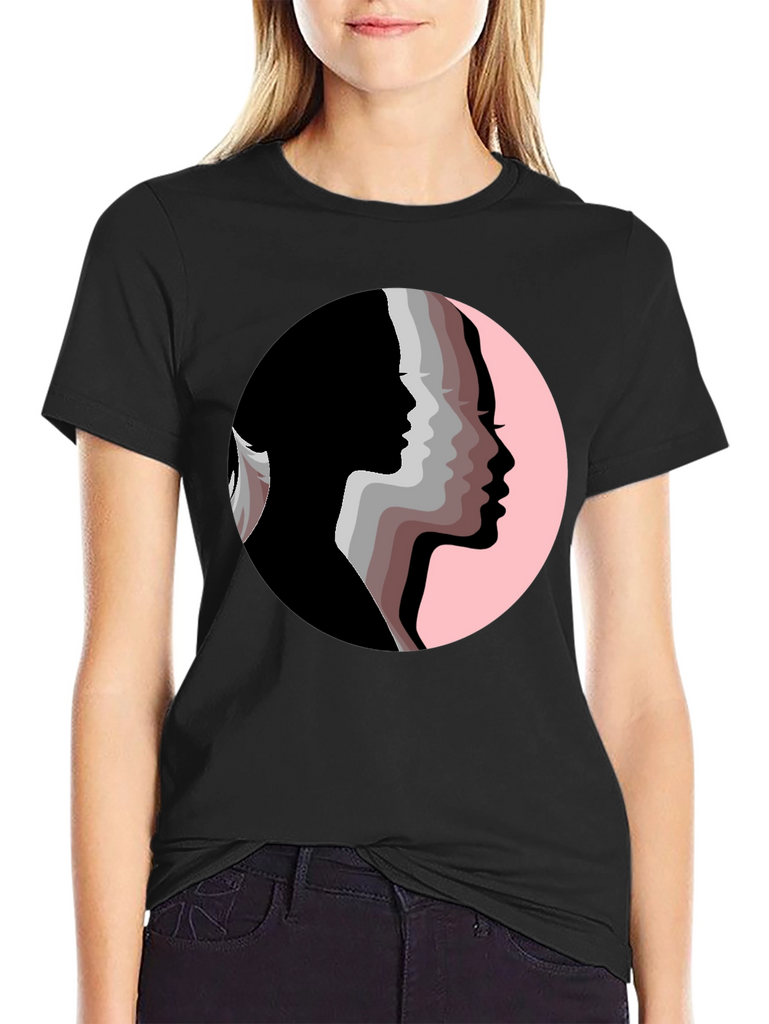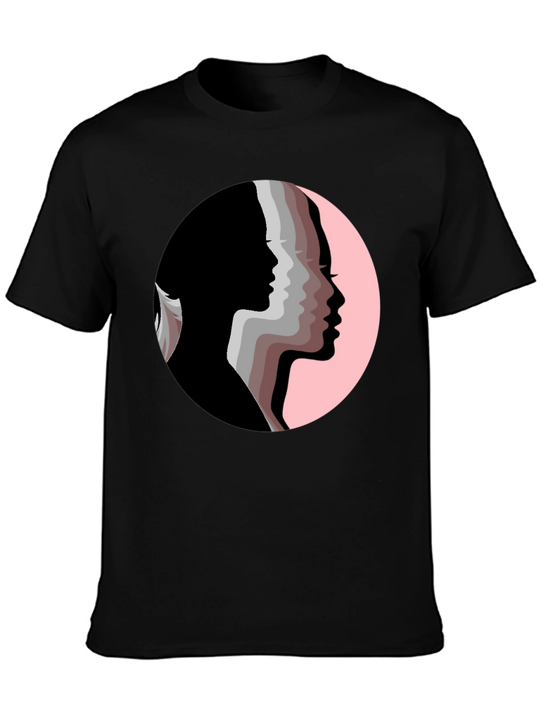 Show off your unique style with this striking black T-shirt. The front features a captivating graphic design of layered women's silhouettes in a circle, rendered in shades of black, grey, and pink. Made from a comfortable material, this tee is perfect for everyday wear. Its eye-catching design is sure to turn heads. Great for casual outings, weekend adventures, or just relaxing at home, this versatile T-shirt will quickly become a wardrobe staple. The unique blend of modern art and classic style makes it a must-have for any fashion-conscious individual.