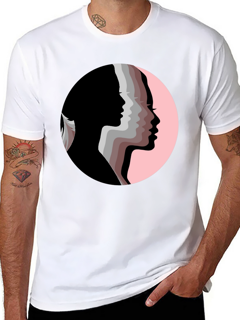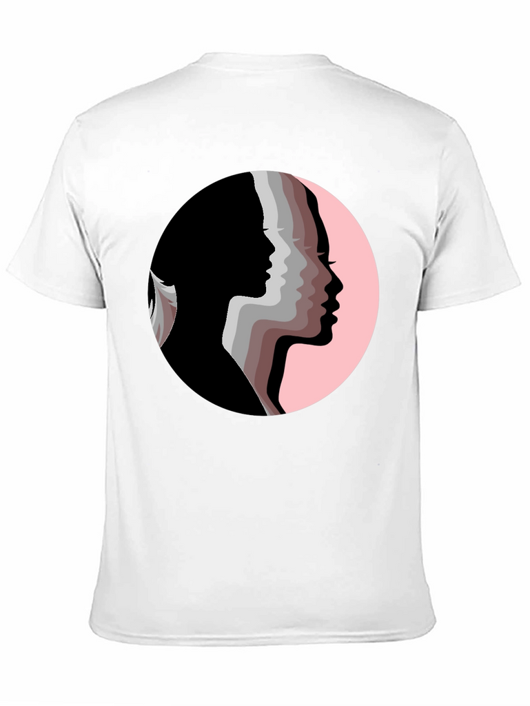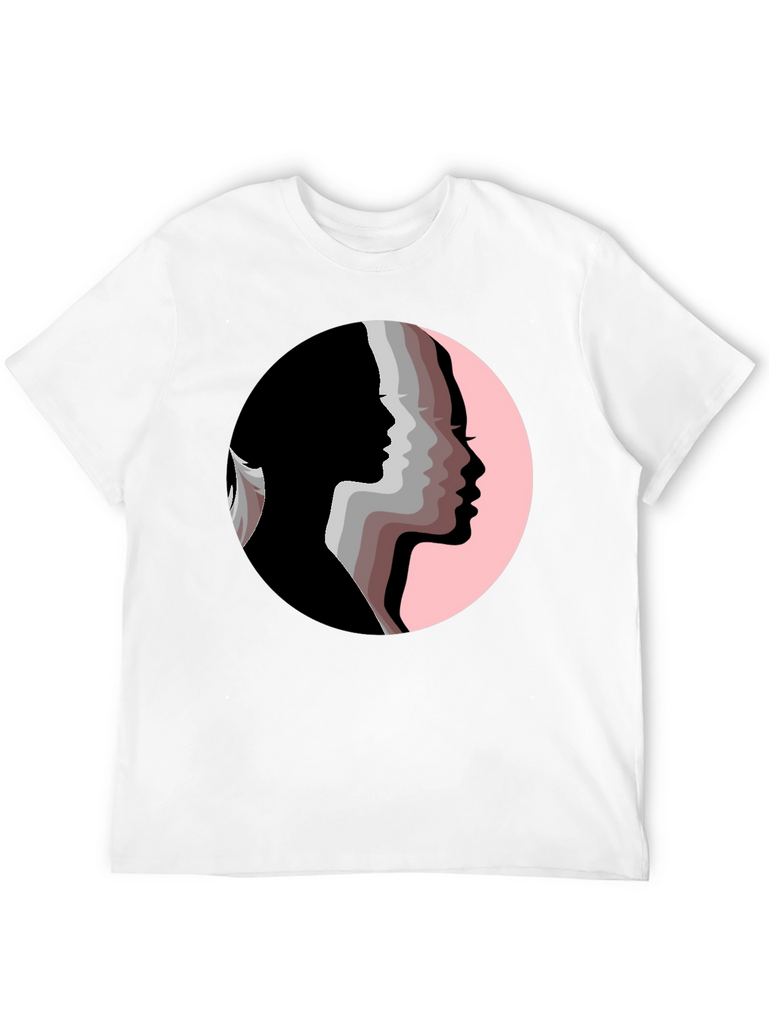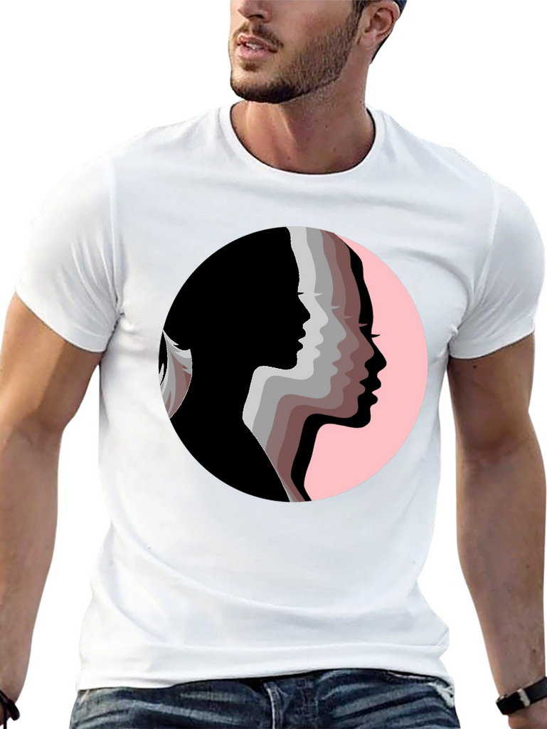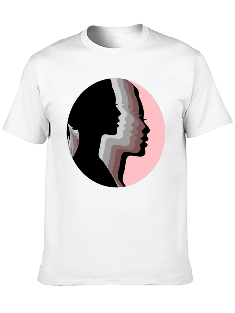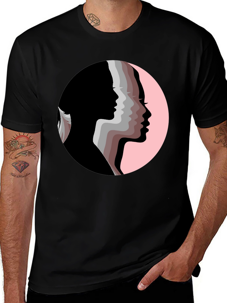 Show off your unique style with this striking black T-shirt. The front features a captivating graphic design of layered women's silhouettes in a circle, rendered in shades of black, grey, and pink. Made from a comfortable material, this tee is perfect for everyday wear. Its eye-catching design is sure to turn heads. Great for casual outings, weekend adventures, or just relaxing at home, this versatile T-shirt will quickly become a wardrobe staple. The unique blend of modern art and classic style makes it a must-have for any fashion-conscious individual.