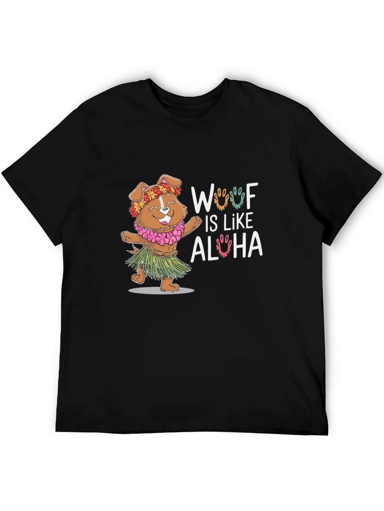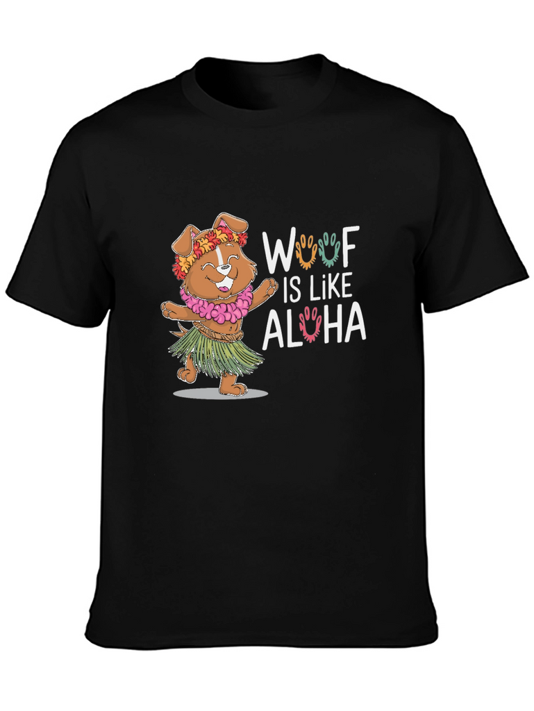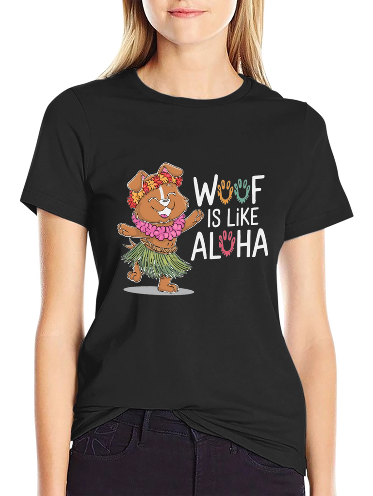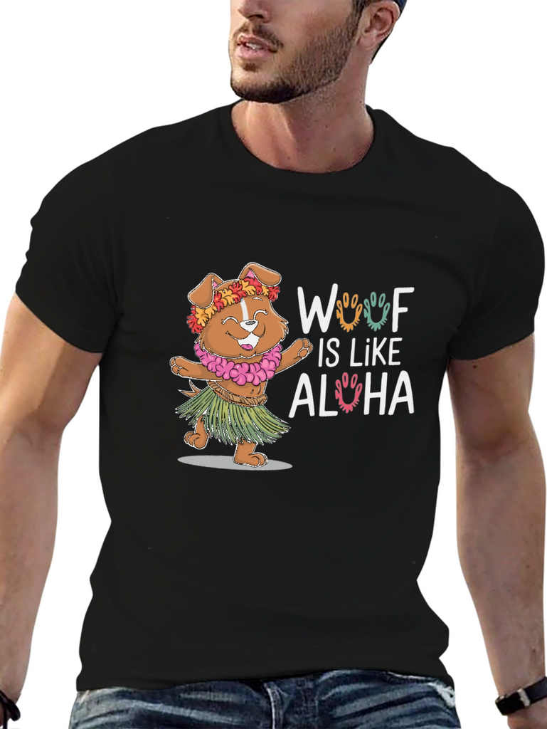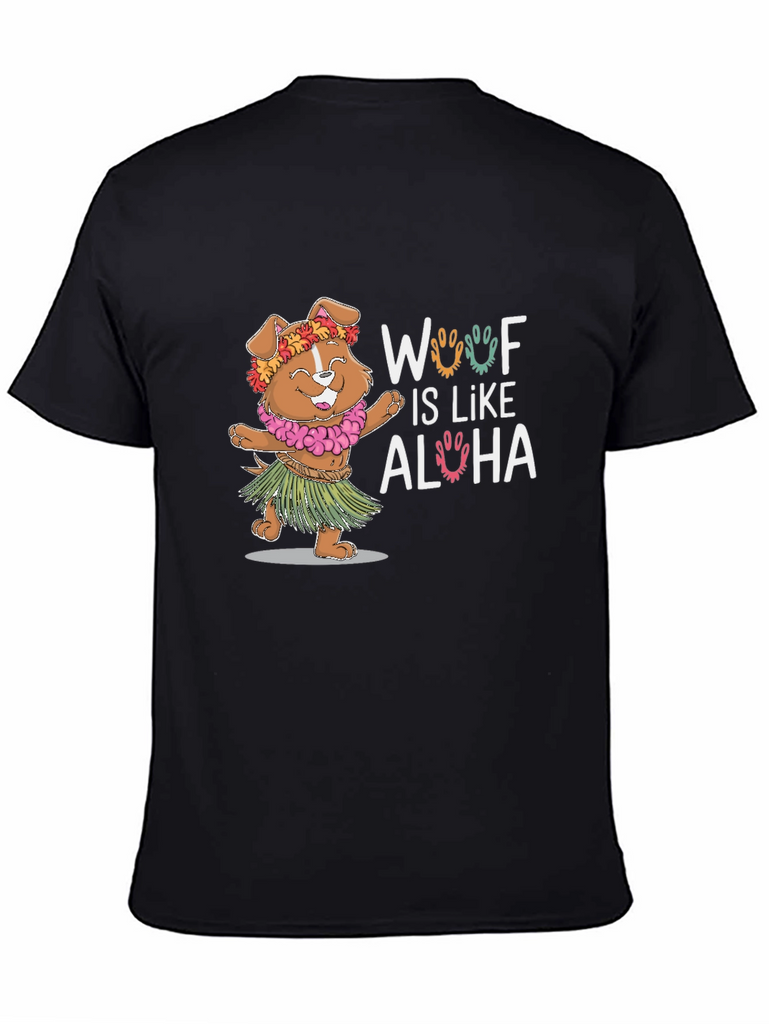 Embrace the island spirit with this adorable "Woof Is Like Aloha" t-shirt. This playful tee features a cute dog dressed in a Hawaiian lei and grass skirt, bringing a touch of tropical fun to your wardrobe. The design is printed on a soft, breathable black fabric, perfect for everyday wear. Show off your love for dogs and the aloha lifestyle with this unique and eye-catching t-shirt. It's ideal for casual outings, beach days, or simply adding a fun twist to your look. A perfect gift for dog lovers!