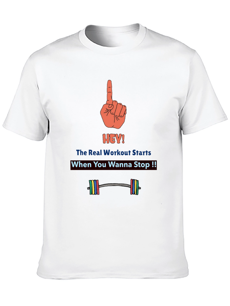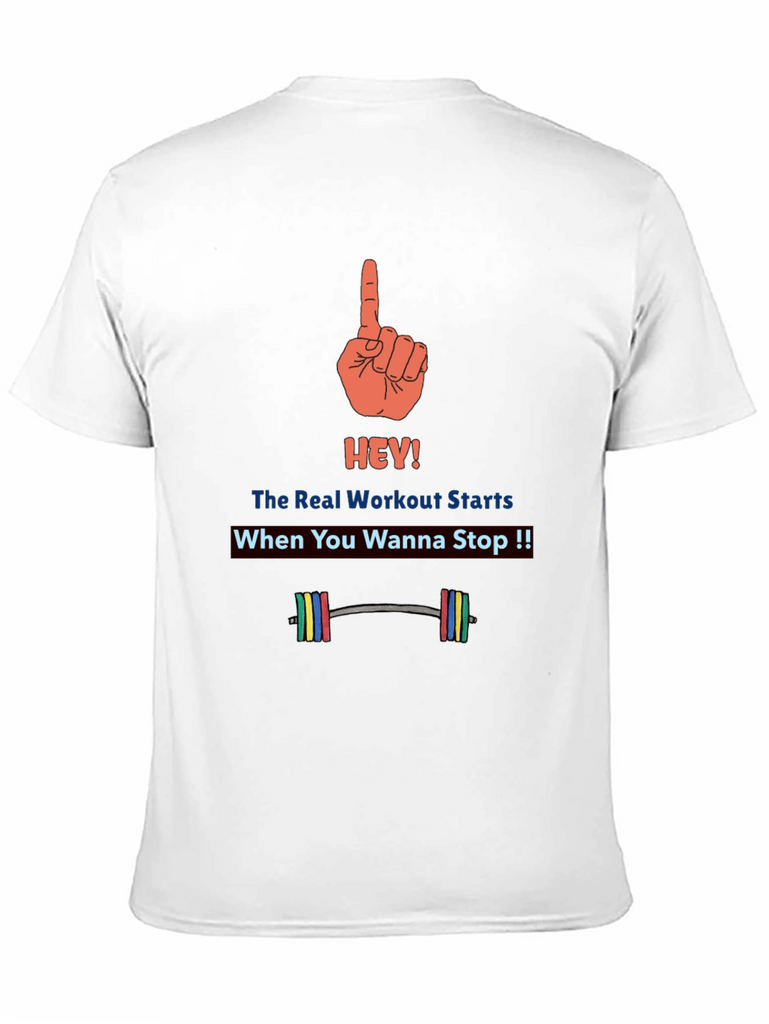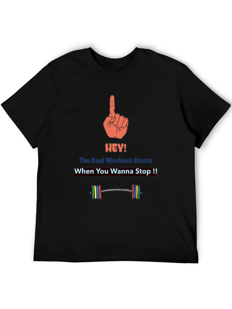 Motivate your workout with this eye-catching black T-shirt. The design features a hand with a raised finger pointing upwards, followed by the motivational text "HEY! The Real Workout Starts When You Wanna Stop !!" and a barbell image. This tee is comfortable and perfect for the gym or everyday casual wear. Show off your dedication to fitness and inspire others with this unique shirt. A must-have for fitness enthusiasts!