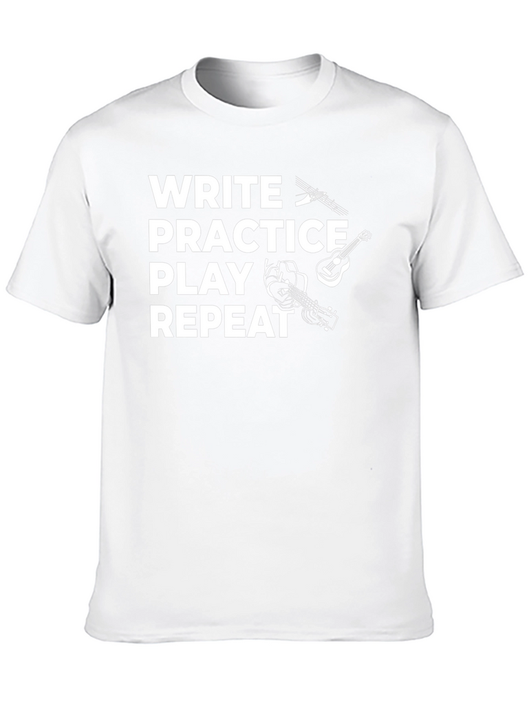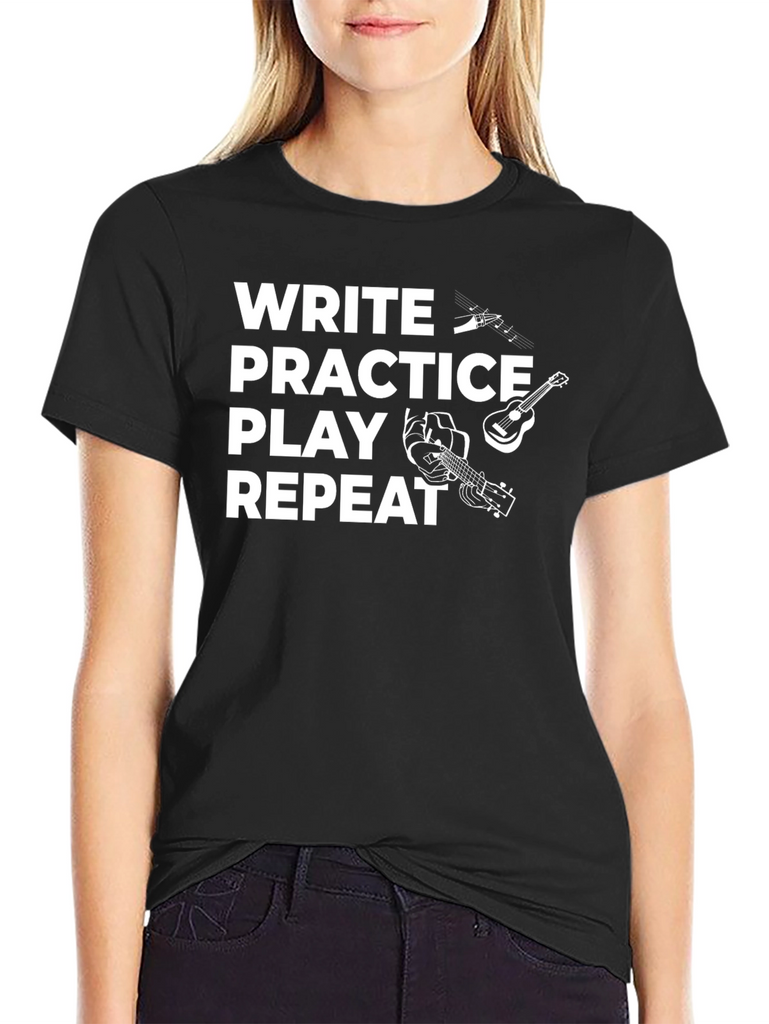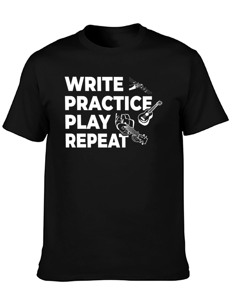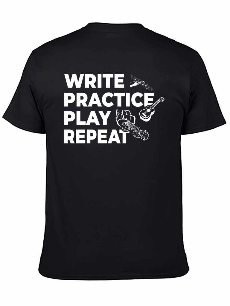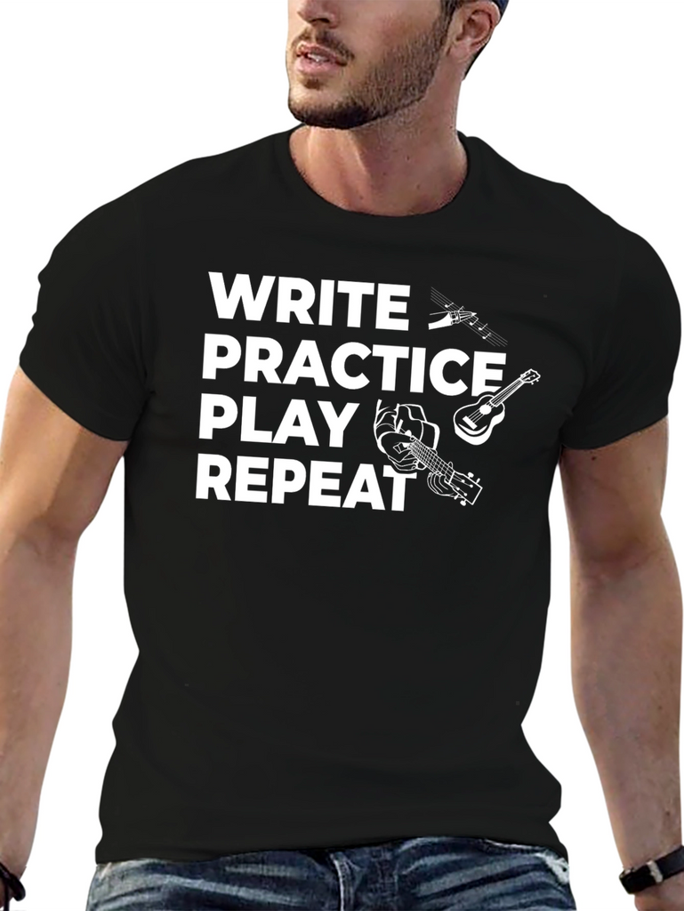 This stylish black t-shirt is perfect for musicians and music lovers. The design features the words "Write Practice Play Repeat" in bold white text, accompanied by playful graphics of musical notes, a guitar, and hands playing an instrument. Made from a comfortable-looking fabric, this tee is ideal for everyday wear, band practice, songwriting sessions, or casual gigs. Show off your passion for music with this eye-catching and unique shirt. Makes a great gift for guitarists, songwriters, and music enthusiasts.