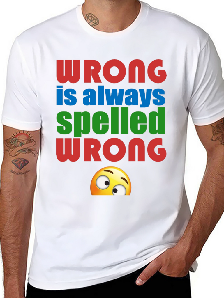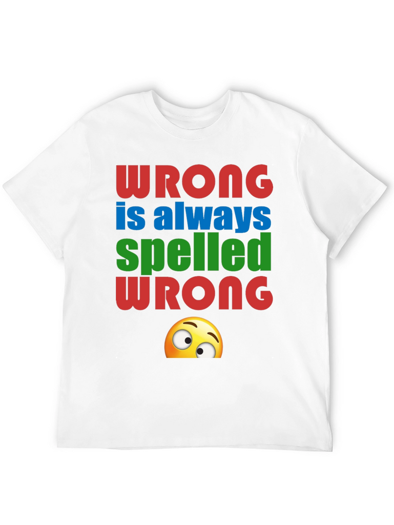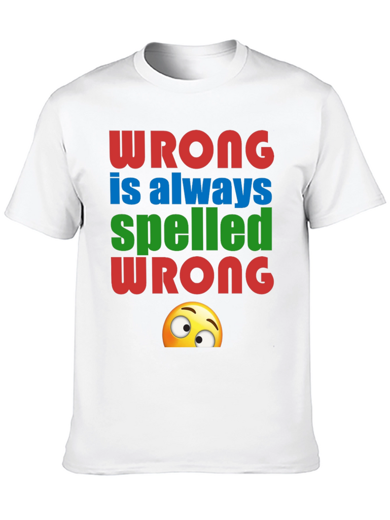 This novelty graphic tee features the playful message "Wrong is always spelled wrong" in bold, colorful lettering. The red, blue, and green text is complemented by a quirky emoji peeking out from the bottom of the design. Made from a soft, breathable black fabric, this shirt offers both comfort and style. It's perfect for casual wear, parties, or as a conversation starter. Show off your sense of humor with this unique and eye-catching tee. A fun gift for grammar enthusiasts and anyone who appreciates a good pun!