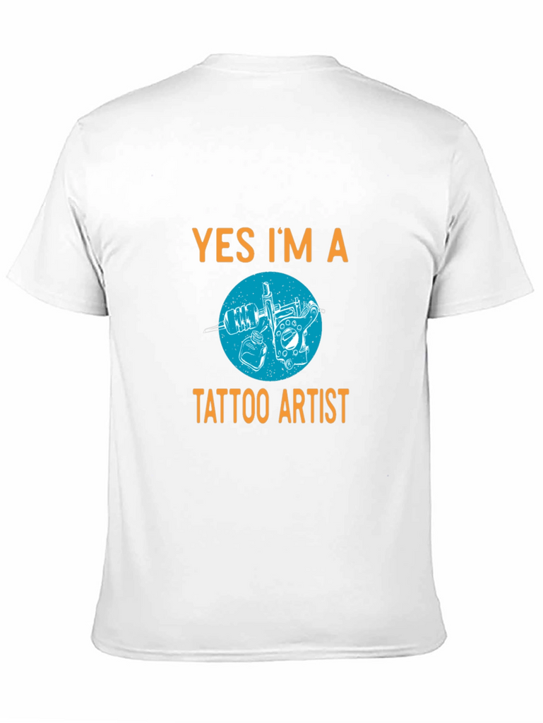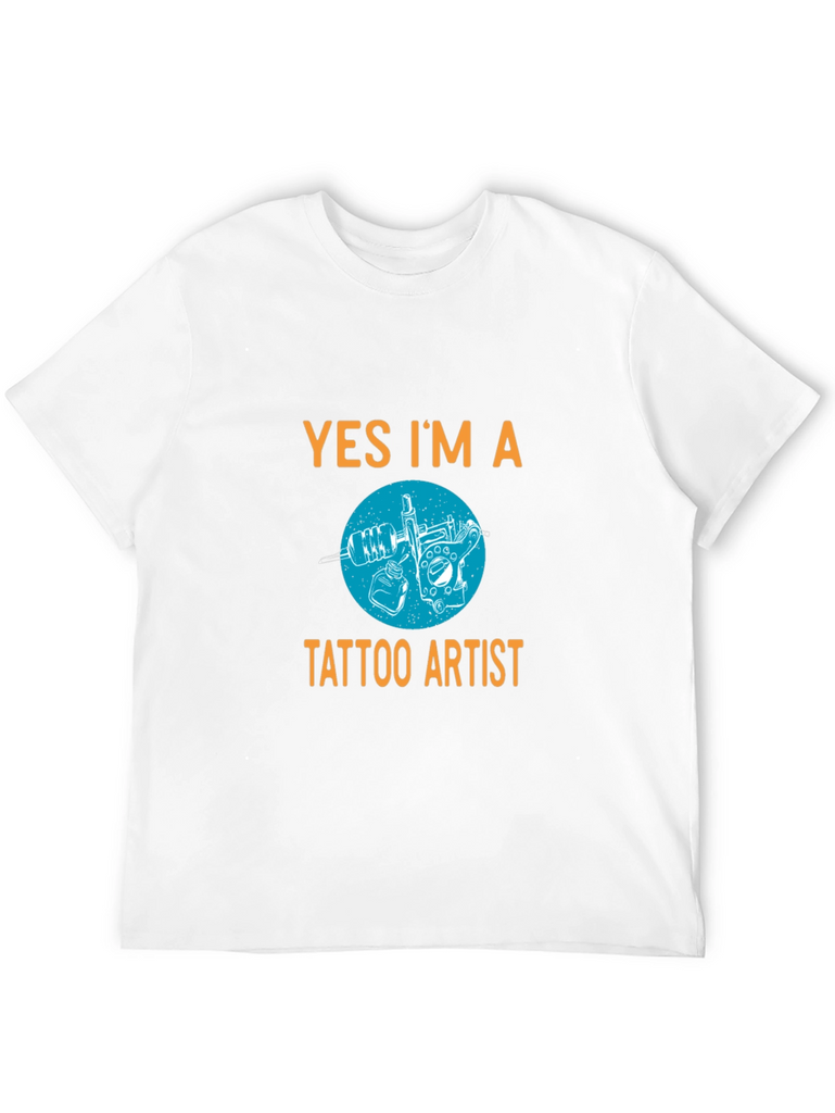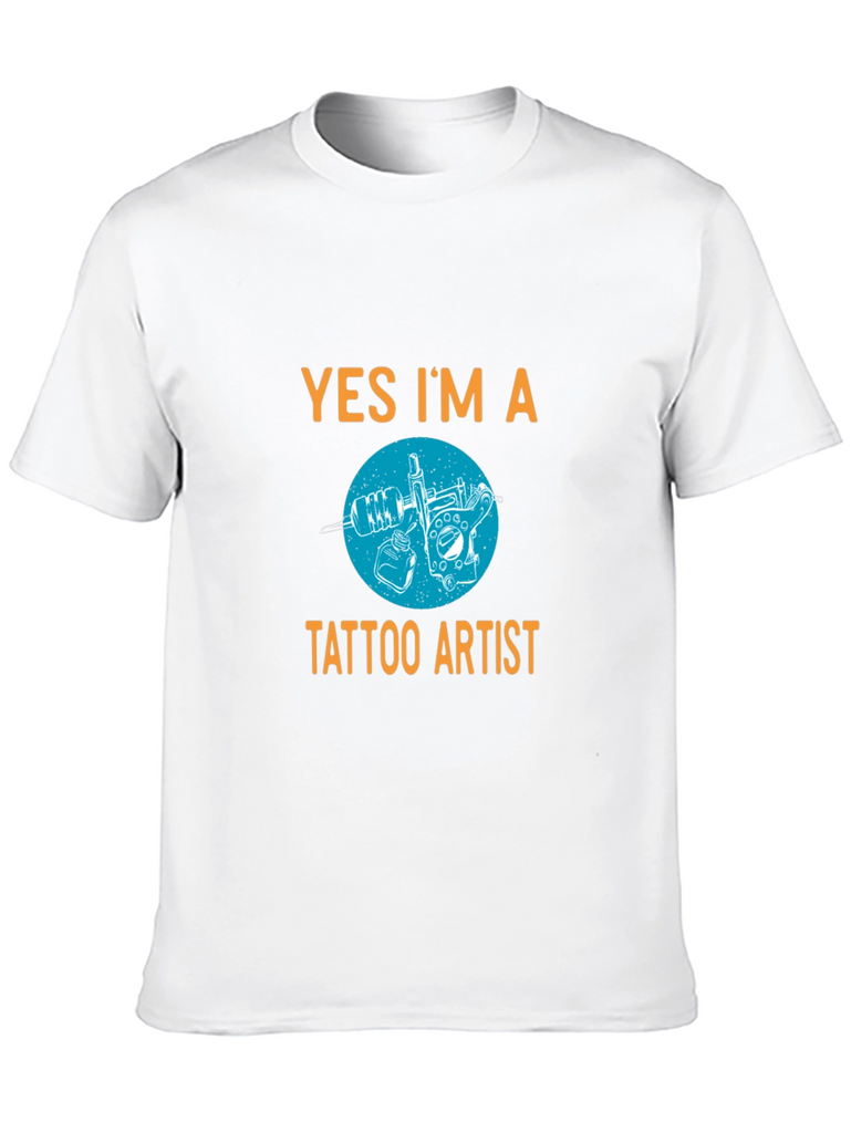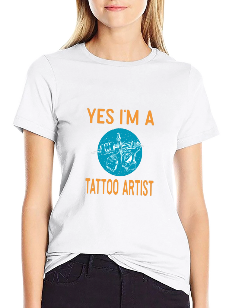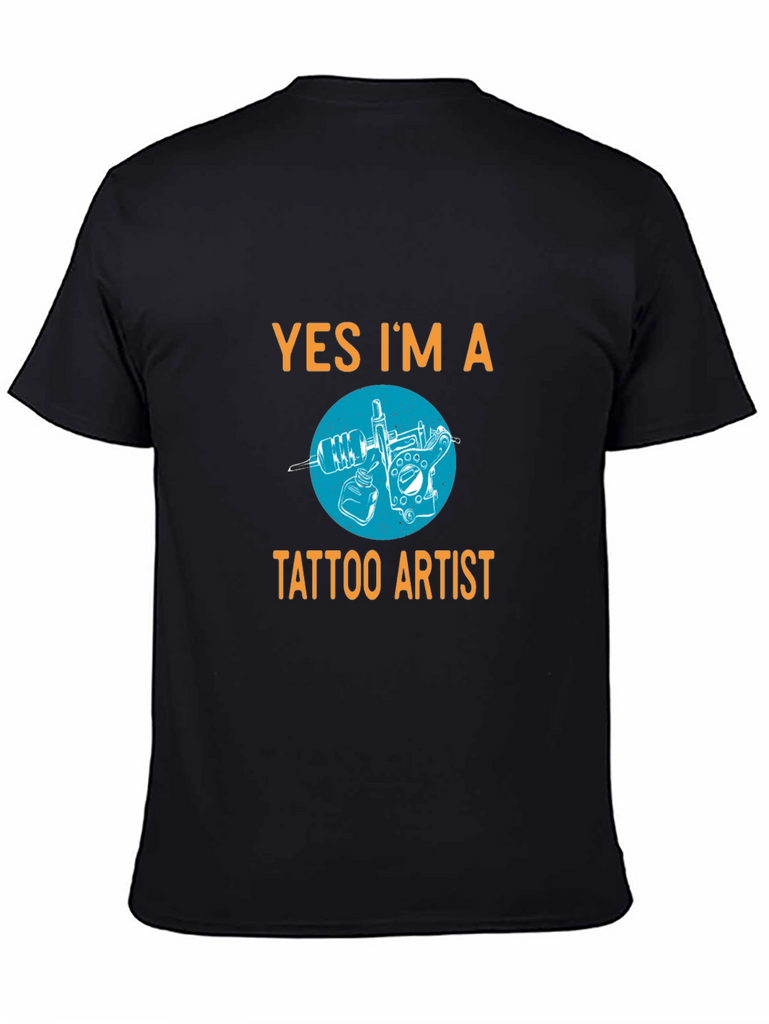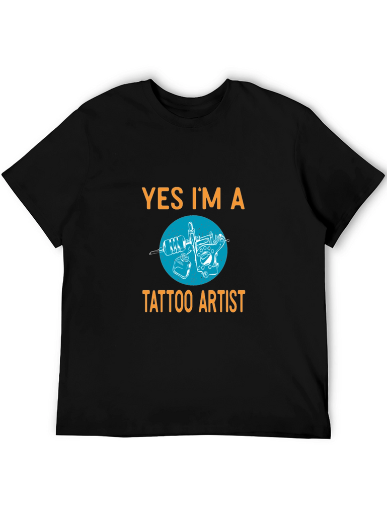 Show off your passion with this bold black t-shirt. Featuring the text "YES I'M A TATTOO ARTIST" in a striking orange font, it is centered above and below a detailed, white tattoo gun graphic enclosed in a blue circle. The design makes it clear that you are proud of your profession. The shirt is made of comfortable material, ideal for everyday wear or a casual work environment. It's a perfect gift for the tattoo artist in your life or a great way to express your own artistic identity.