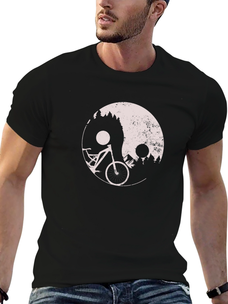 Embrace harmony with this unique Yin Yang T-shirt! This tee features a creative graphic incorporating a bicycle and a serene landscape within the iconic Yin Yang symbol. The design is printed in a distressed style on a soft, comfortable black fabric. The yin side features the mountain bike with trees while the yang side has mountains. The black color makes it versatile for any casual occasion. Perfect for cyclists, nature lovers, or anyone seeking a stylish and meaningful addition to their wardrobe. A must-have piece for expressing individuality and balance.