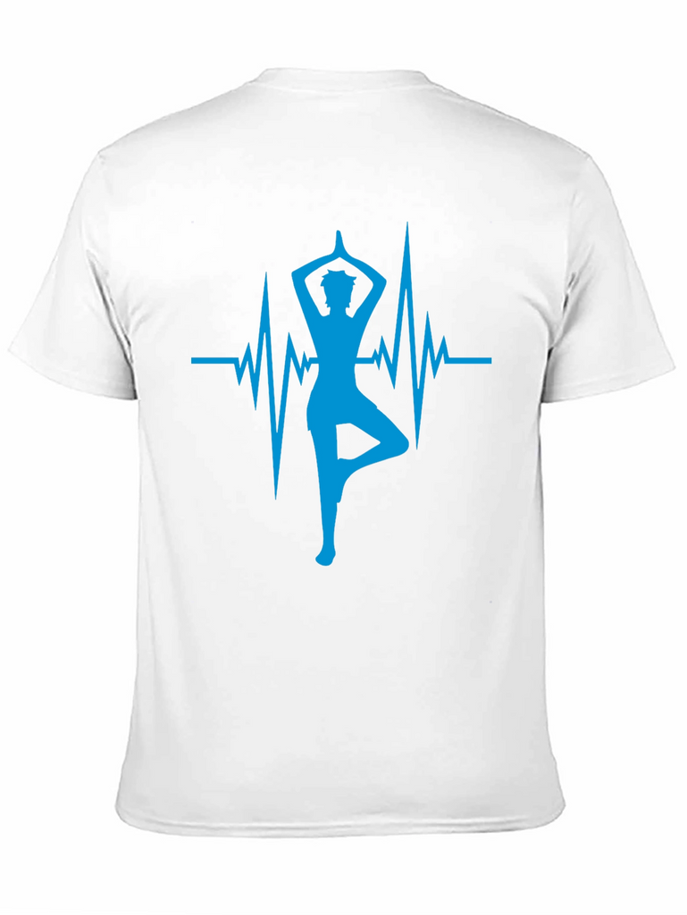 This stylish black t-shirt features a unique design, blending the serenity of yoga with the rhythm of life. A vibrant blue graphic showcases a yoga pose silhouette intertwined with an EKG heartbeat line, creating a visually striking and meaningful image. Made from a soft, comfortable fabric, this shirt offers both style and comfort for everyday wear. The design makes it a perfect choice for yoga enthusiasts, fitness lovers, or anyone who appreciates a touch of mindful fashion. Wear it to the gym, yoga class, or simply as a statement piece to express your passion for wellness and inner peace.